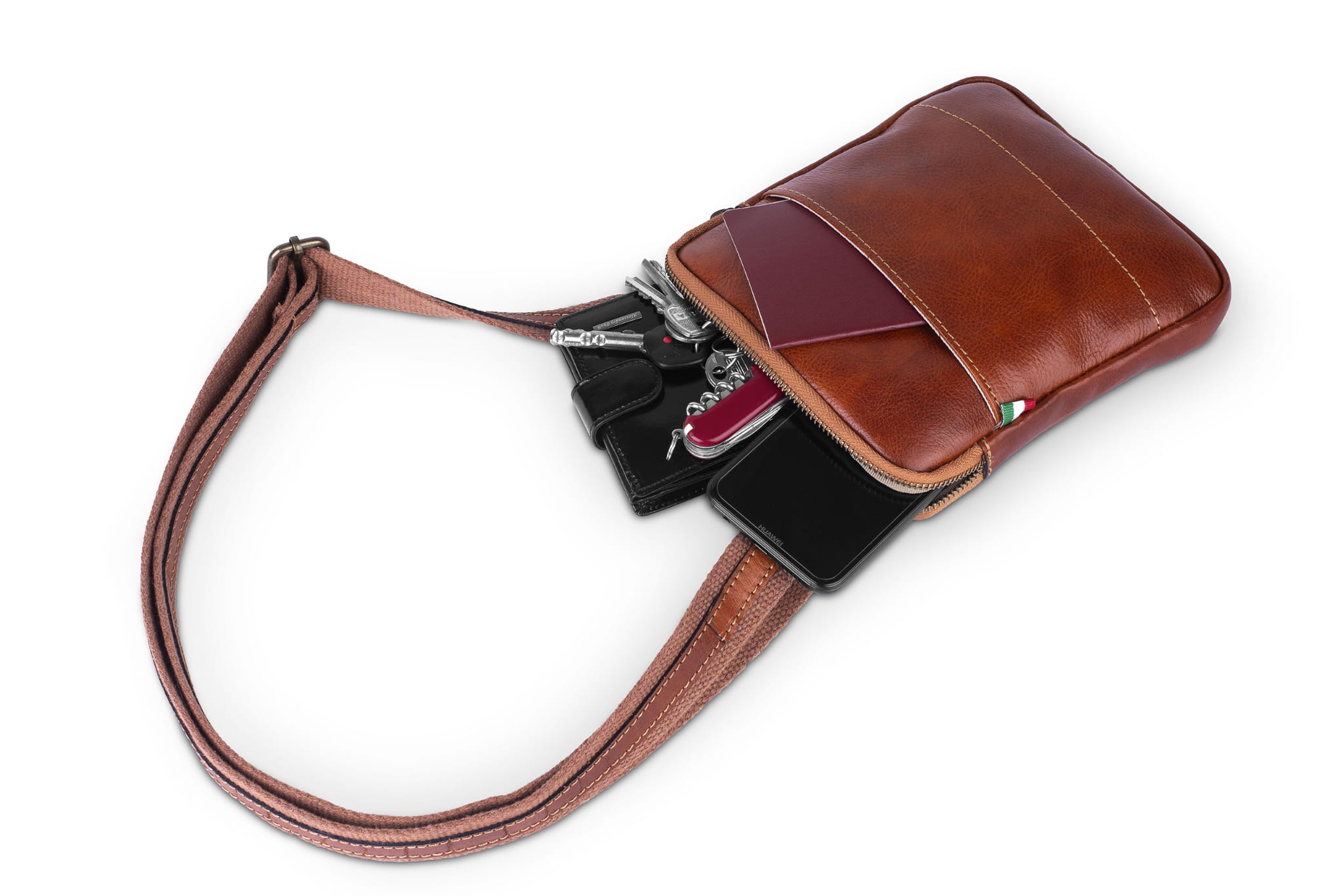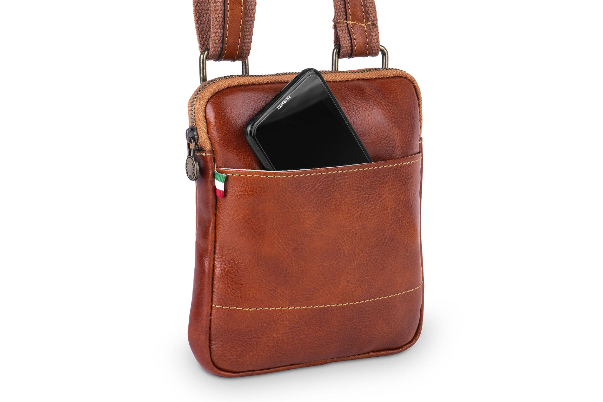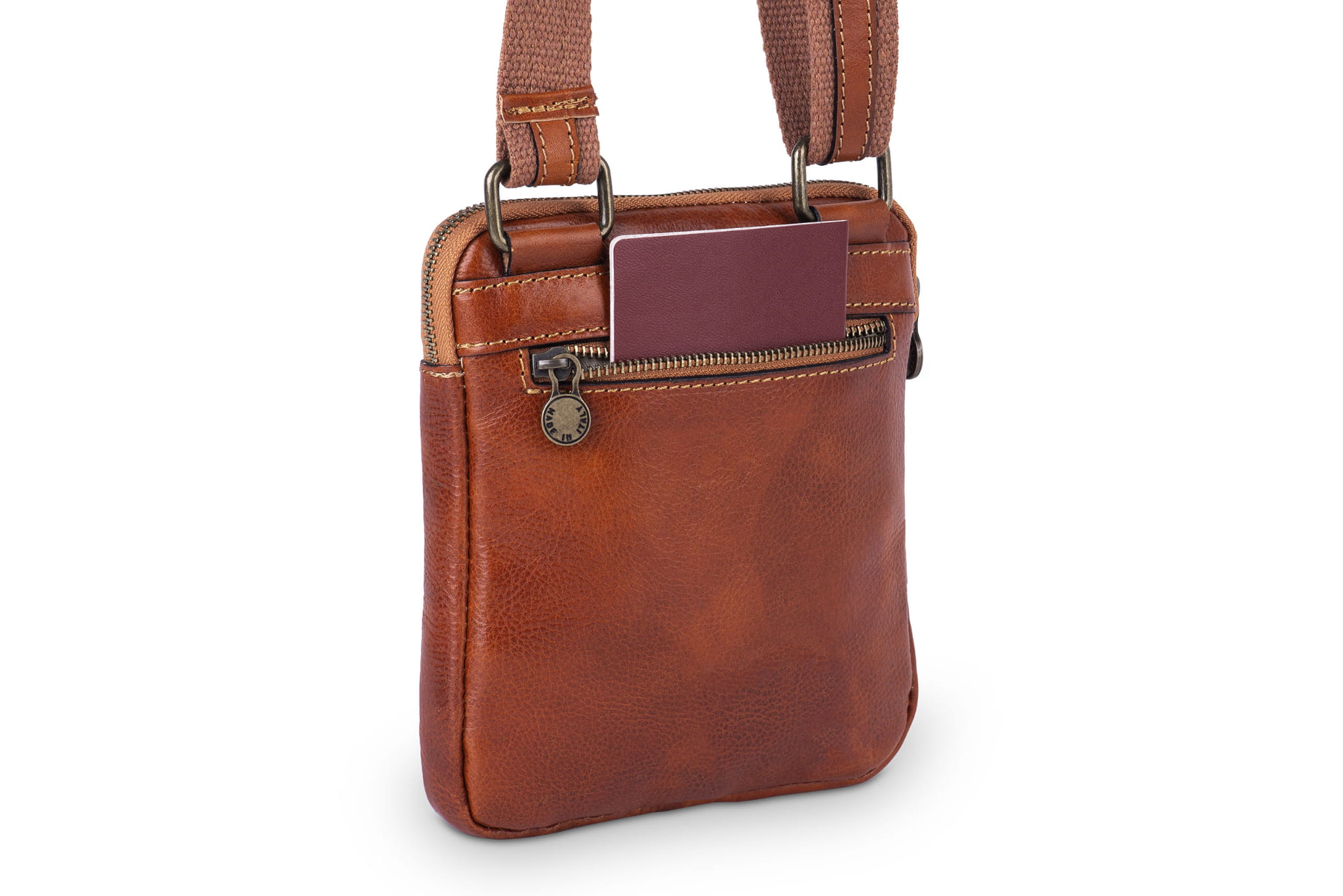 Materiał, z którego uszyta jest listonoszka, to włoska naturalna skóra licowa. Skóra gładka i miła w dotyku a jednocześnie wytrzymała i dająca dobrą ochronę przed wilgocią. Listonoszka jest niewielka ale bez problemu zmieści się w niej portfel, telefon, klucze lub mała książka. Szeroki bawełniany pasek na ramię jest dodatkowo wzmocniony wąskim skórzanym paskiem.