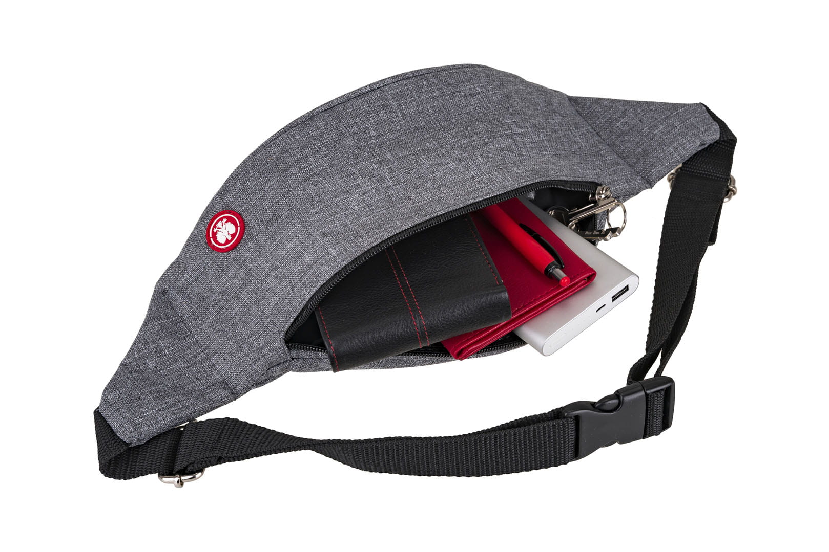Wykonana z nieprzemakalnej, jasnoszarej kodury. Powiększona komora pomieści więcej rzeczy niż standardowa nerka.