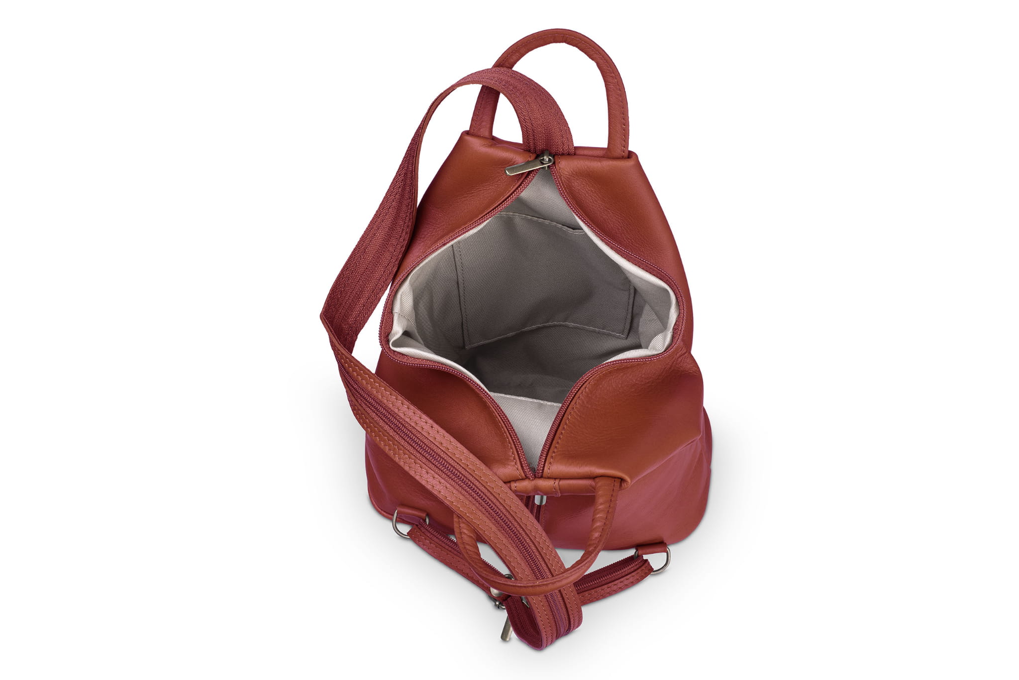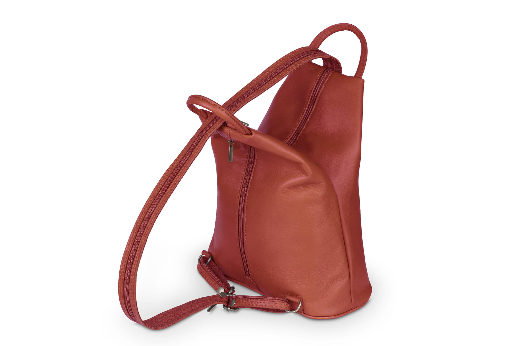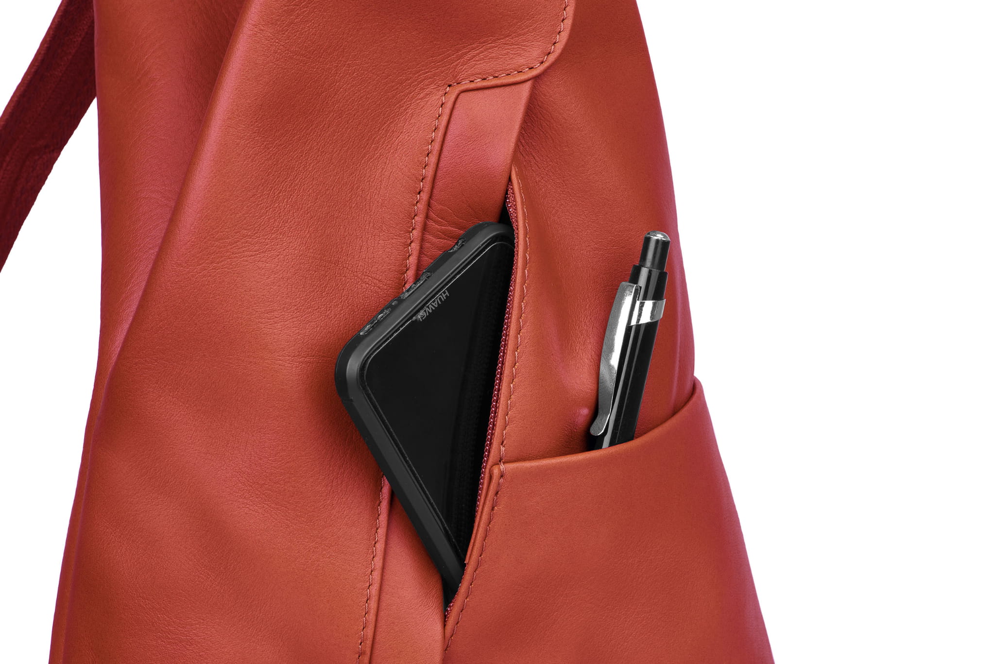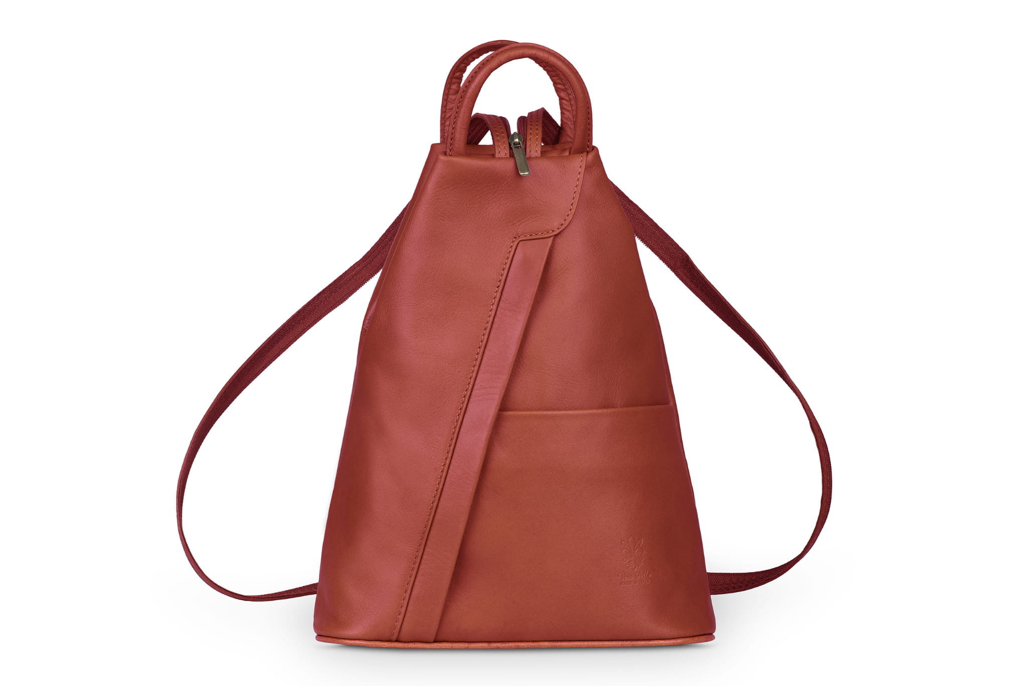 Plecak wykonany z wysokogatunkowej, włoskiej skóry licowej. Wyróżnia go smukła forma, pięć kieszeni w różnych rozmiarach i szelki z suwakiem. Po spięciu szelek, tworzą one pojedynczą, grubszą szelkę do noszenia plecaka na jednym ramieniu.