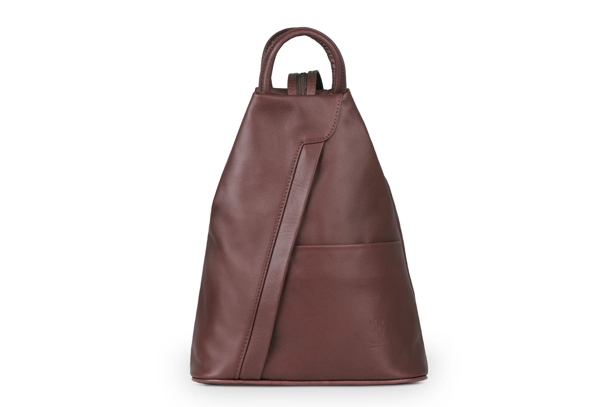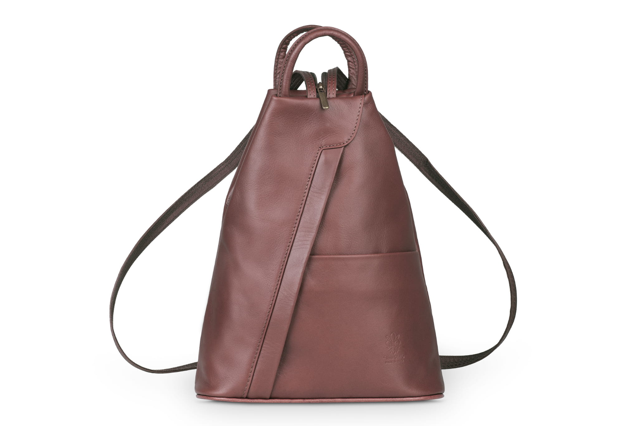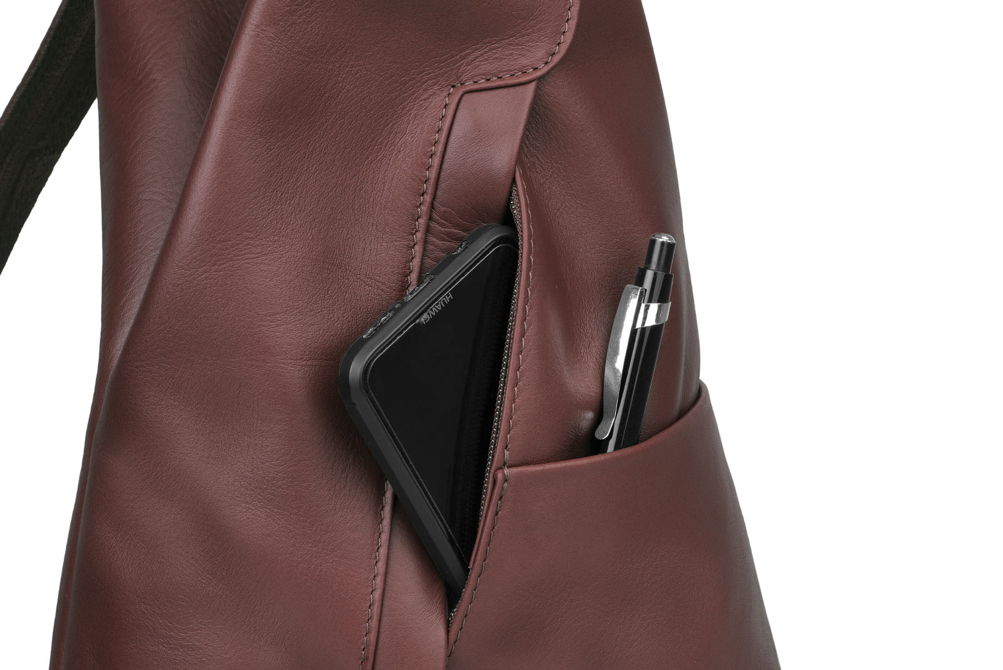 Plecak wykonany z wysokogatunkowej, włoskiej skóry licowej. Wyróżnia go smukła forma, pięć kieszeni w różnych rozmiarach i szelki z suwakiem. Po spięciu szelek, tworzą one pojedynczą, grubszą szelkę do noszenia plecaka na jednym ramieniu.
