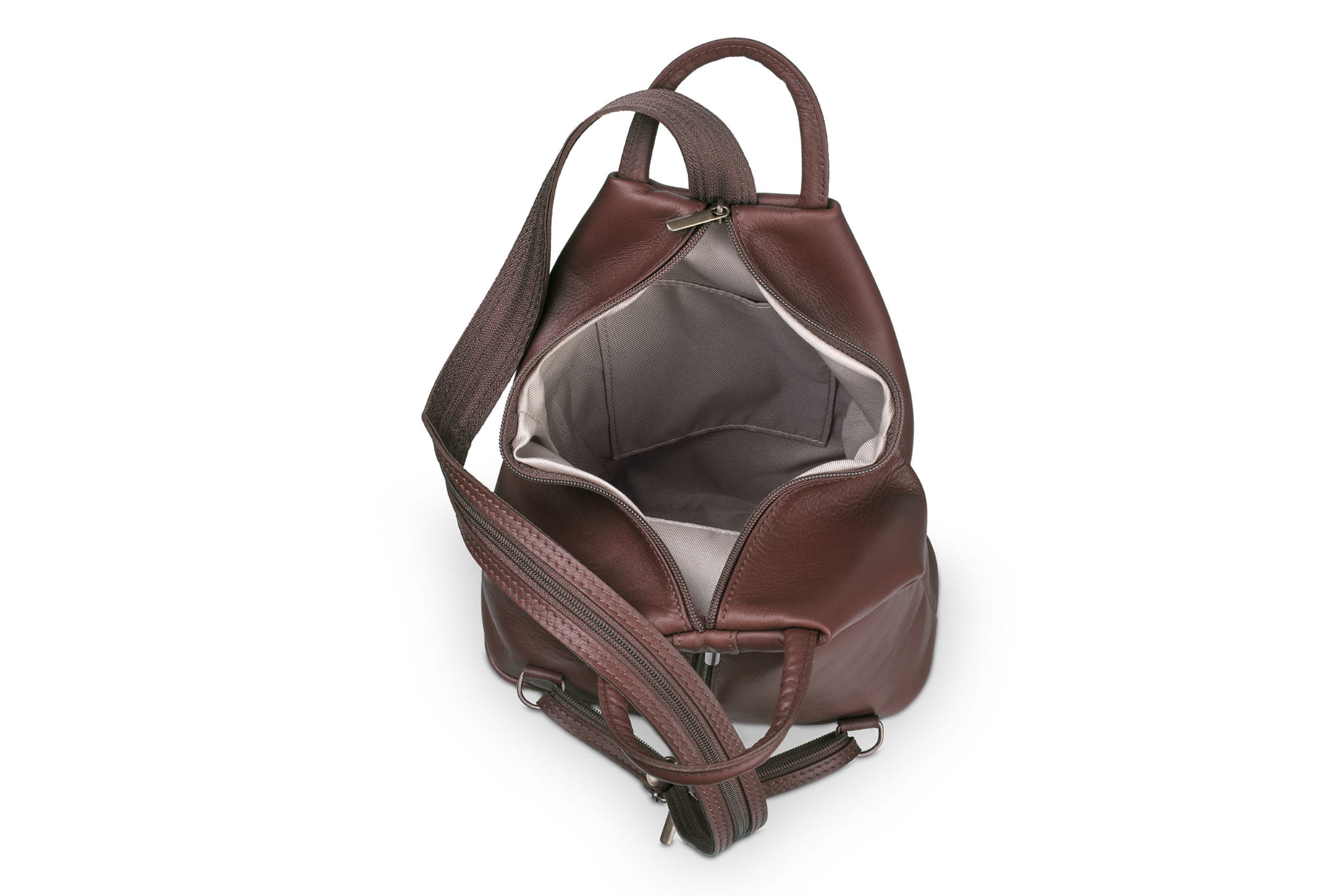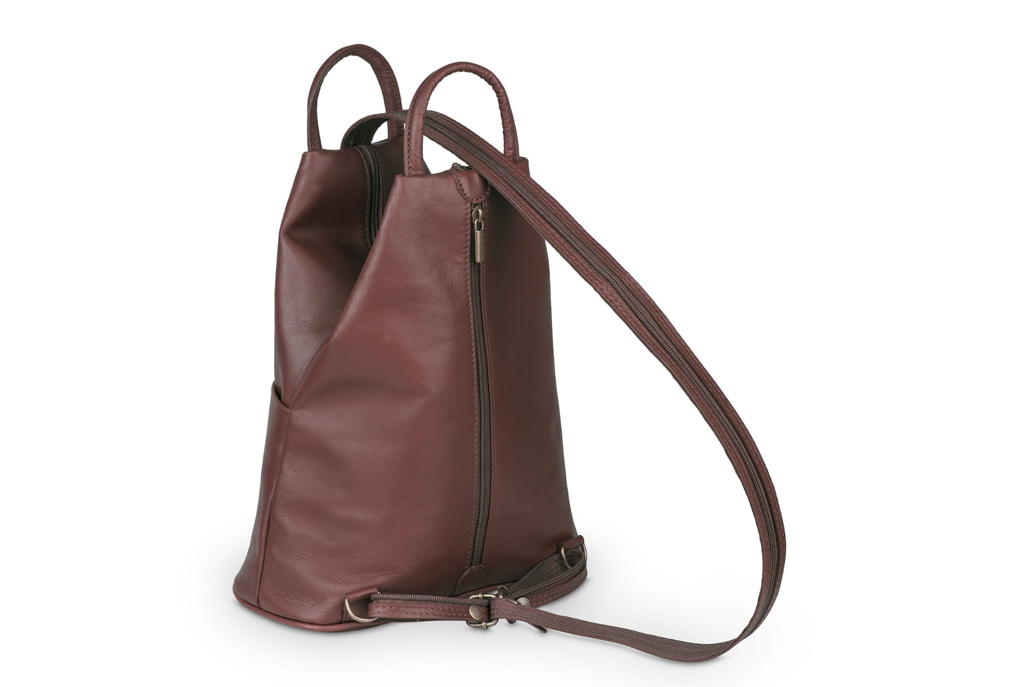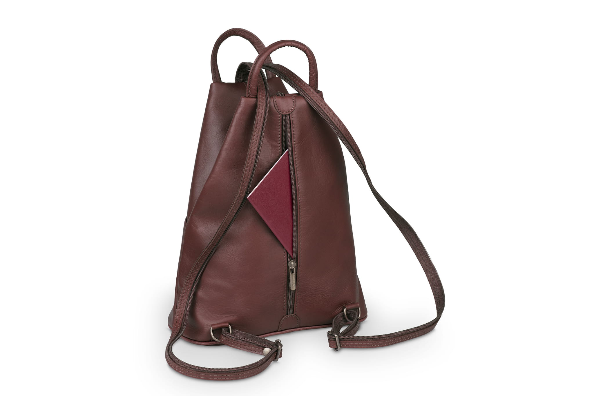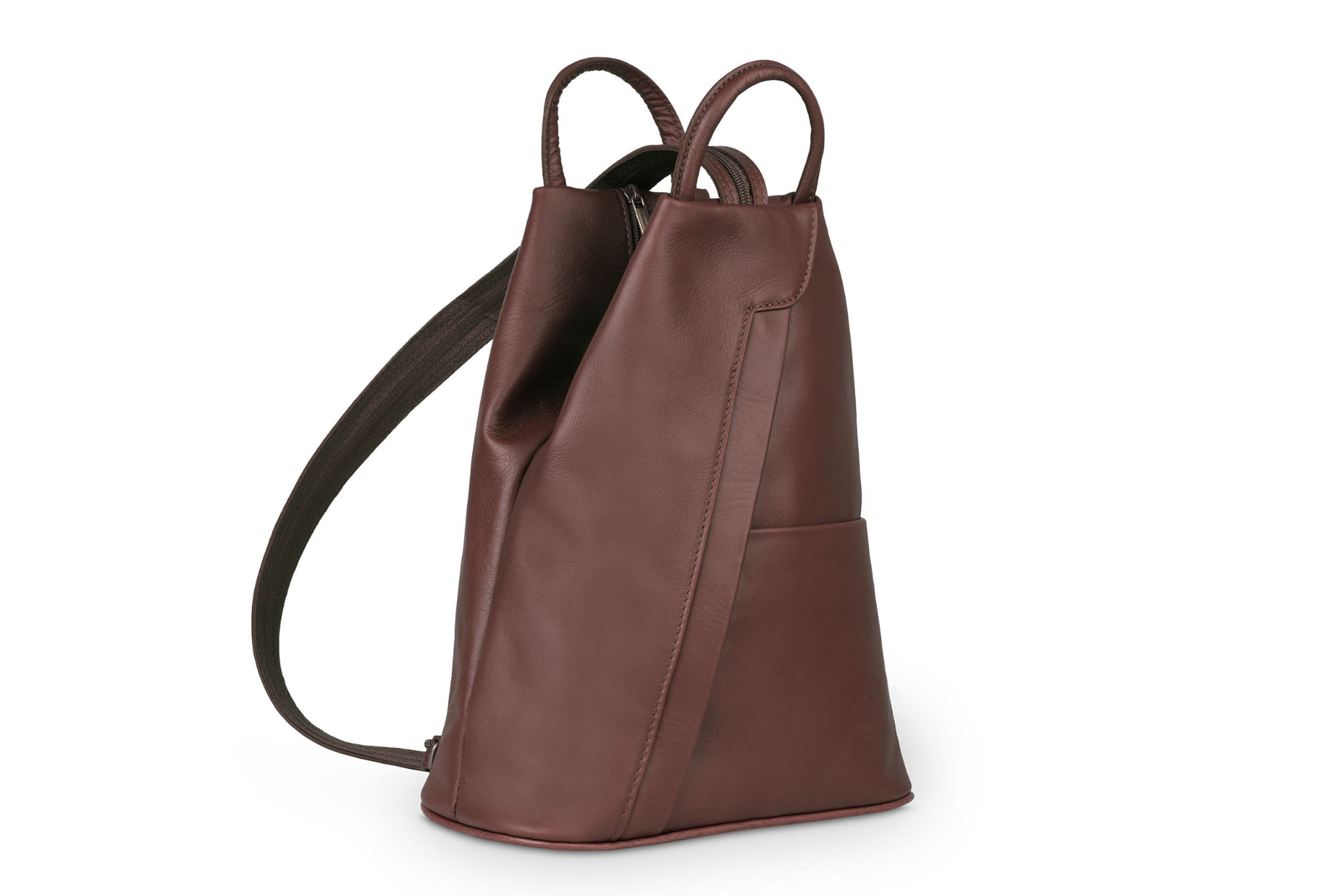 Plecak wykonany z wysokogatunkowej, włoskiej skóry licowej. Wyróżnia go smukła forma, pięć kieszeni w różnych rozmiarach i szelki z suwakiem. Po spięciu szelek, tworzą one pojedynczą, grubszą szelkę do noszenia plecaka na jednym ramieniu.
