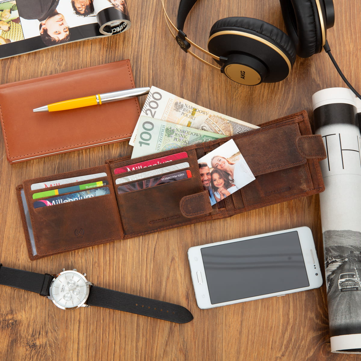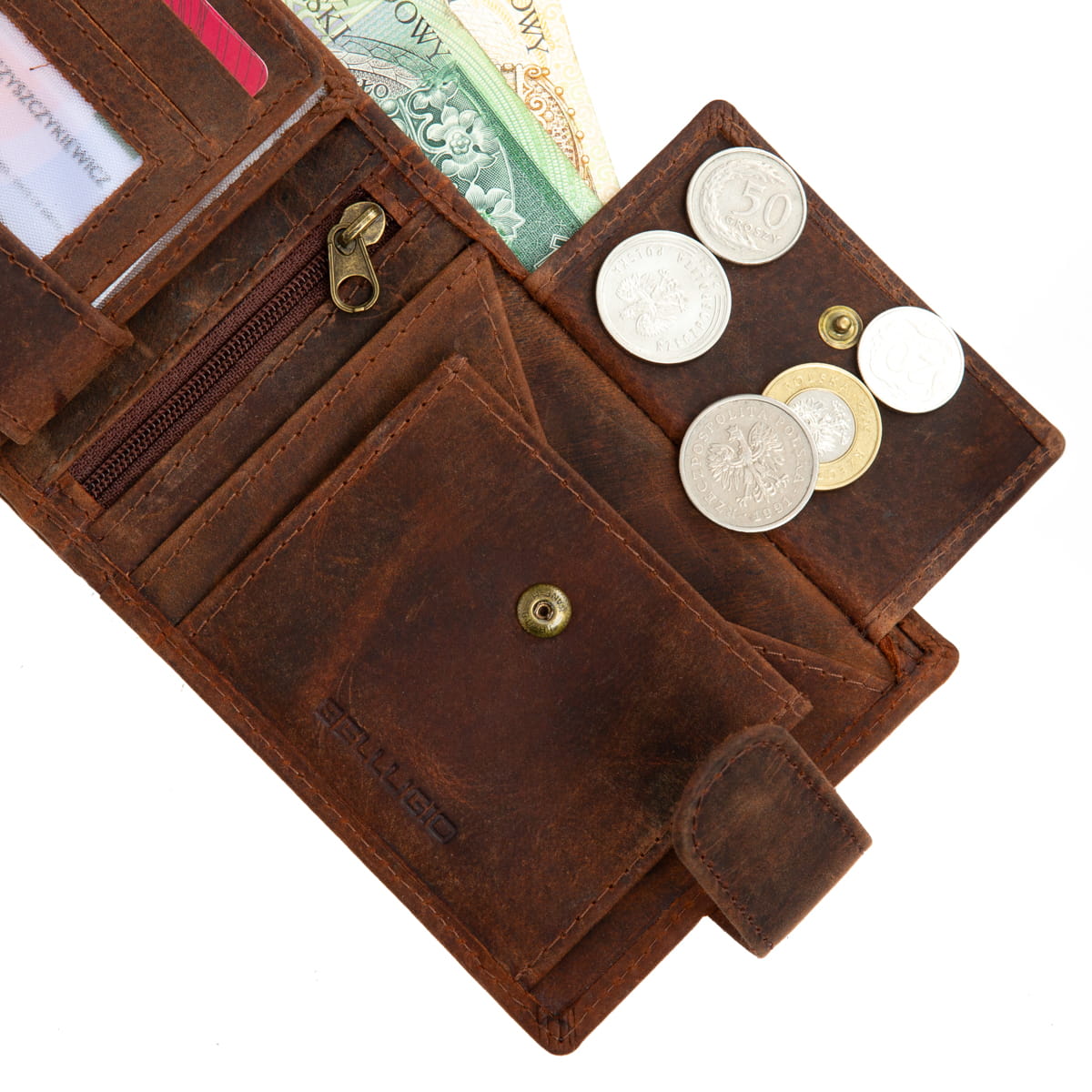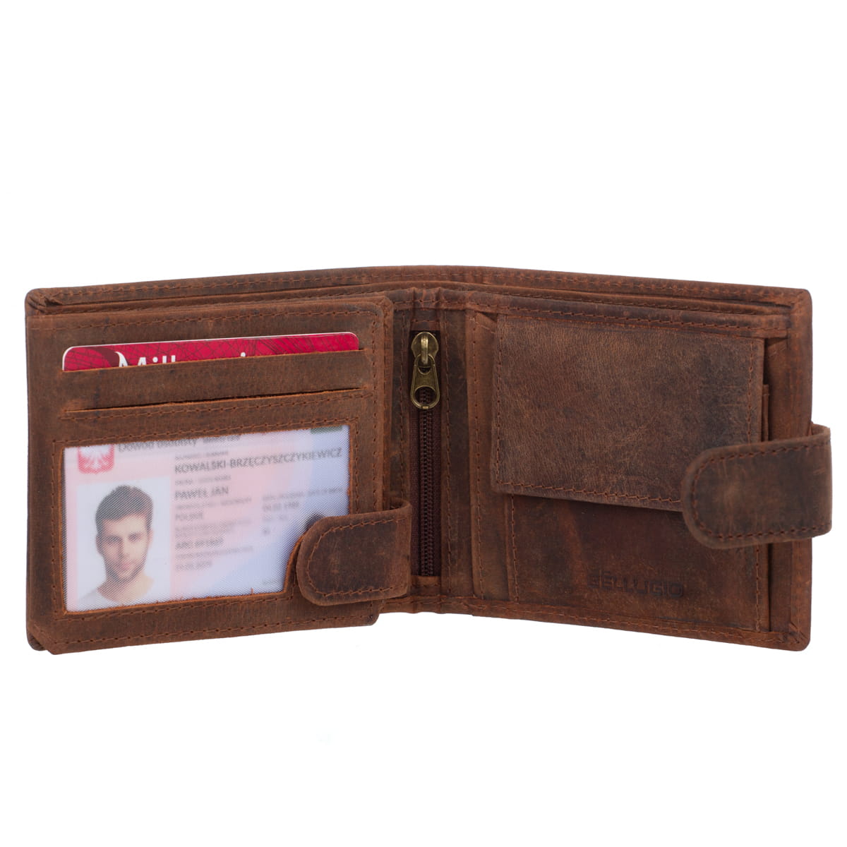 Rustykalny portfel wykonany z opalanej skóry naturalnej. Stylowy i praktyczny - ma duże przegrody na banknoty i dokumenty, ale bez problemu mieści się w kieszeni spodni. Jest odporny na przetarcia i różnego rodzaju zabrudzenia. Przy produkcji portfeli Bellugio szczególną uwagę przykłada się do detali, dzięki czemu są dopracowane w każdym szczególne i mogą być użytkowane przez wiele lat.