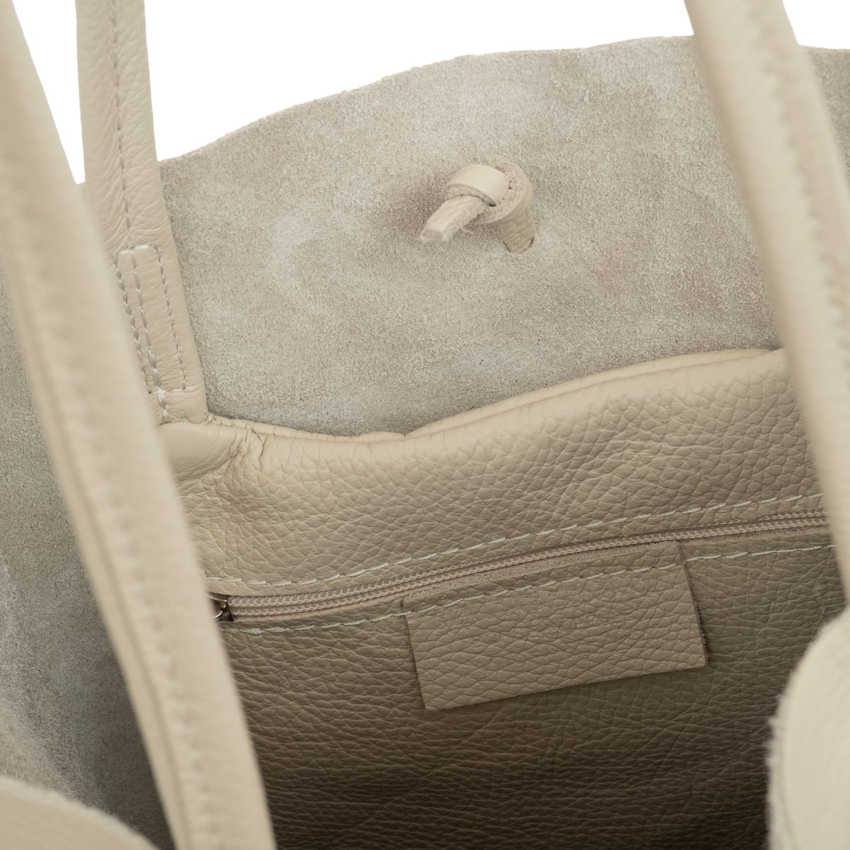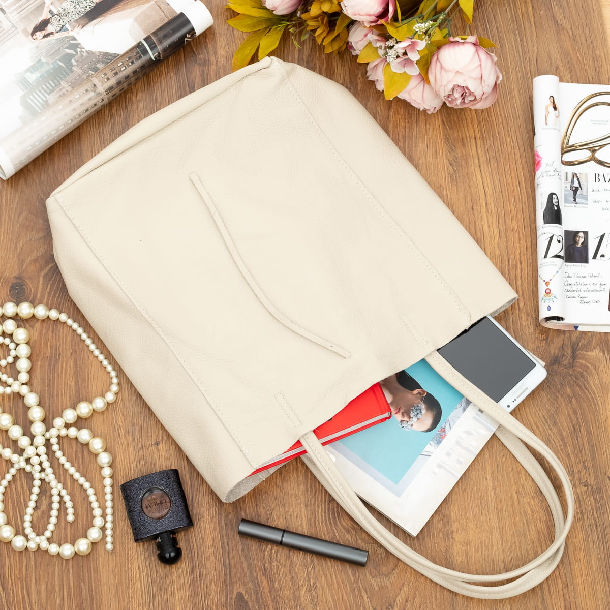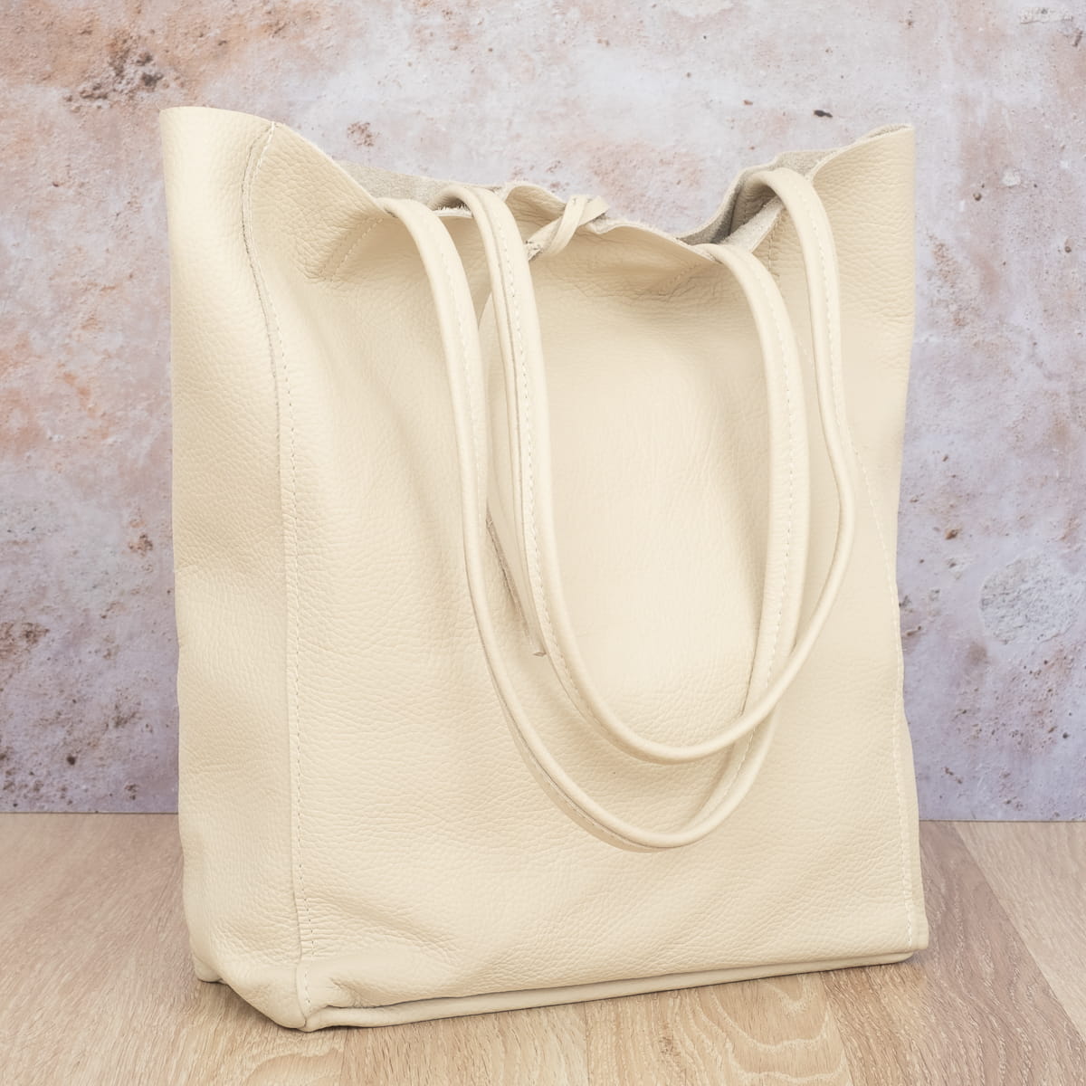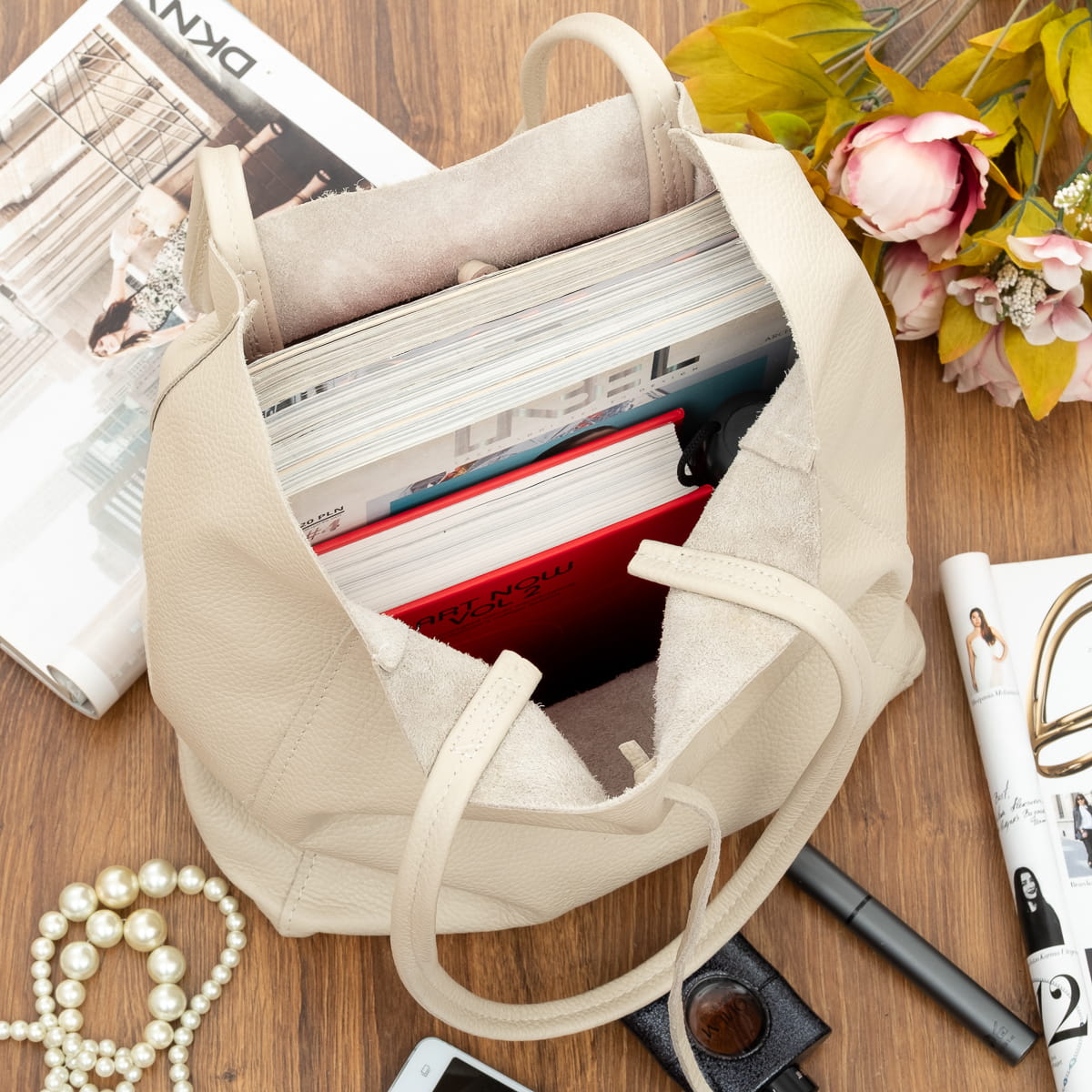Pojemna włoska torba damska z usztywnianym dnem. Wykonana z wysokogatunkowej, naturalnej skóry licowej. Dzięki zastosowaniu grubej skóry torba jest mocna i nieprzemakalna. Z dużym zapasem zmieszczą się w niej przedmioty formatu A4. Praktycznym dodatkiem jest, zamykana na suwak, wewnętrzna kieszeń na drobiazgi.