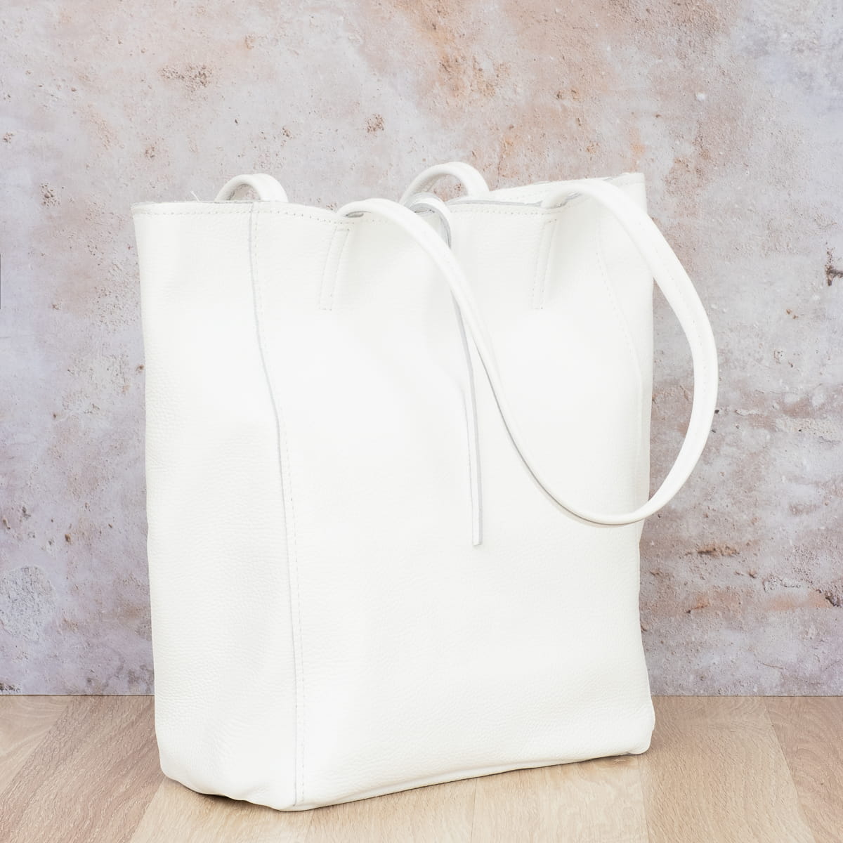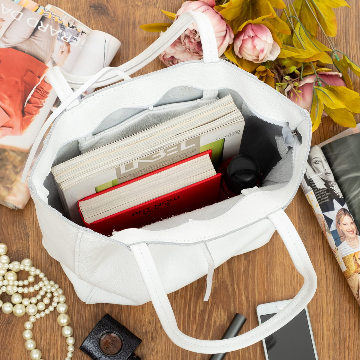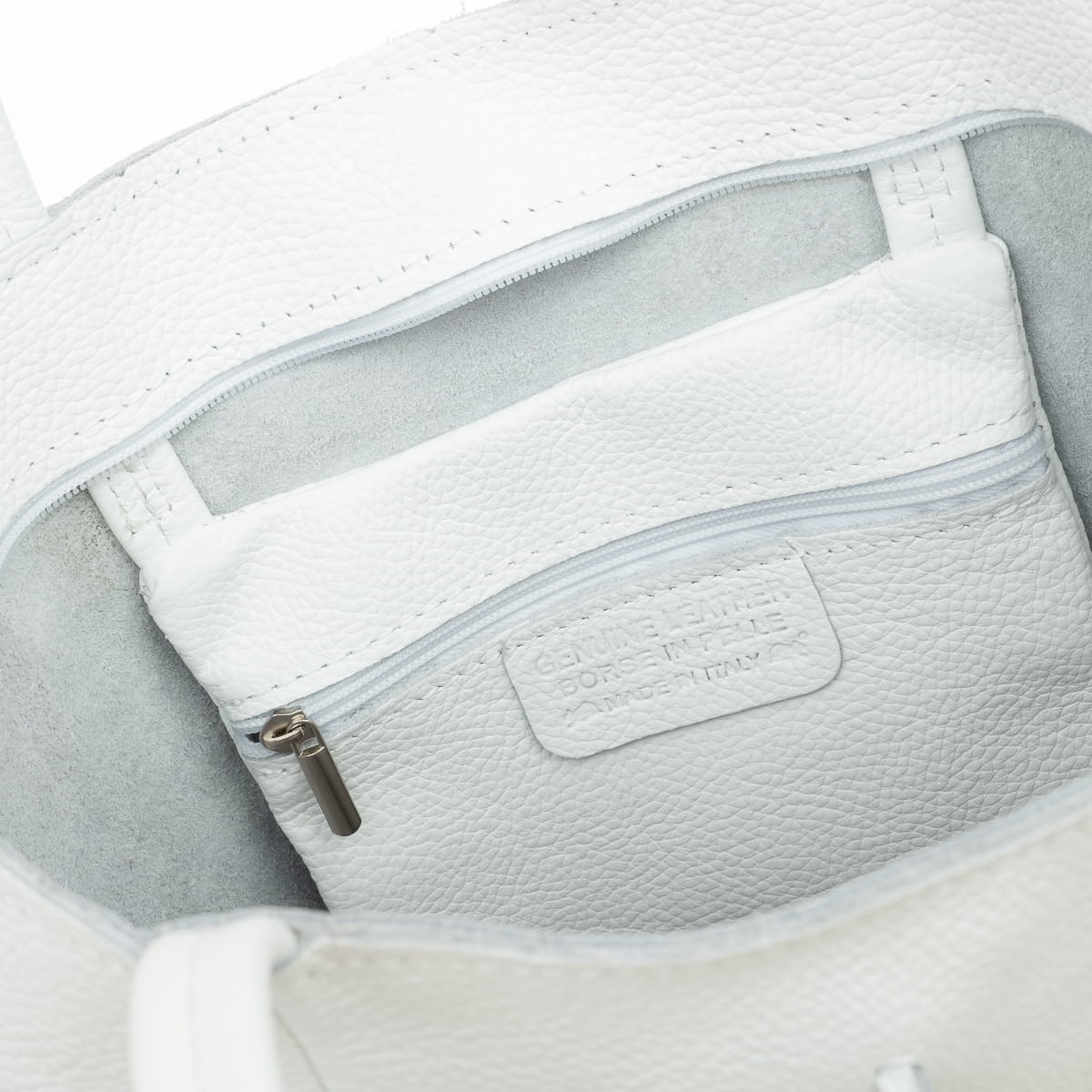 Pojemna włoska torba damska z usztywnianym dnem. Wykonana z wysokogatunkowej, naturalnej skóry licowej. Dzięki zastosowaniu grubej skóry torba jest mocna i nieprzemakalna. Z dużym zapasem zmieszczą się w niej przedmioty formatu A4. Praktycznym dodatkiem jest, zamykana na suwak, wewnętrzna kieszeń na drobiazgi.