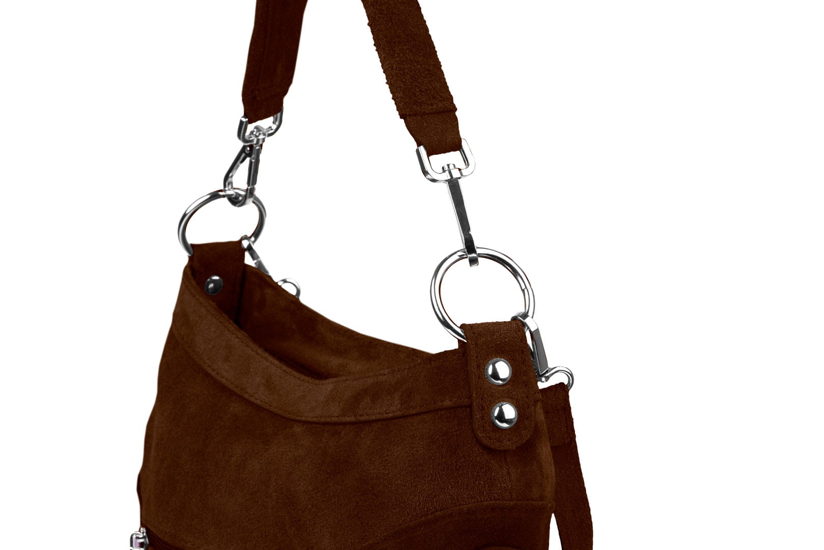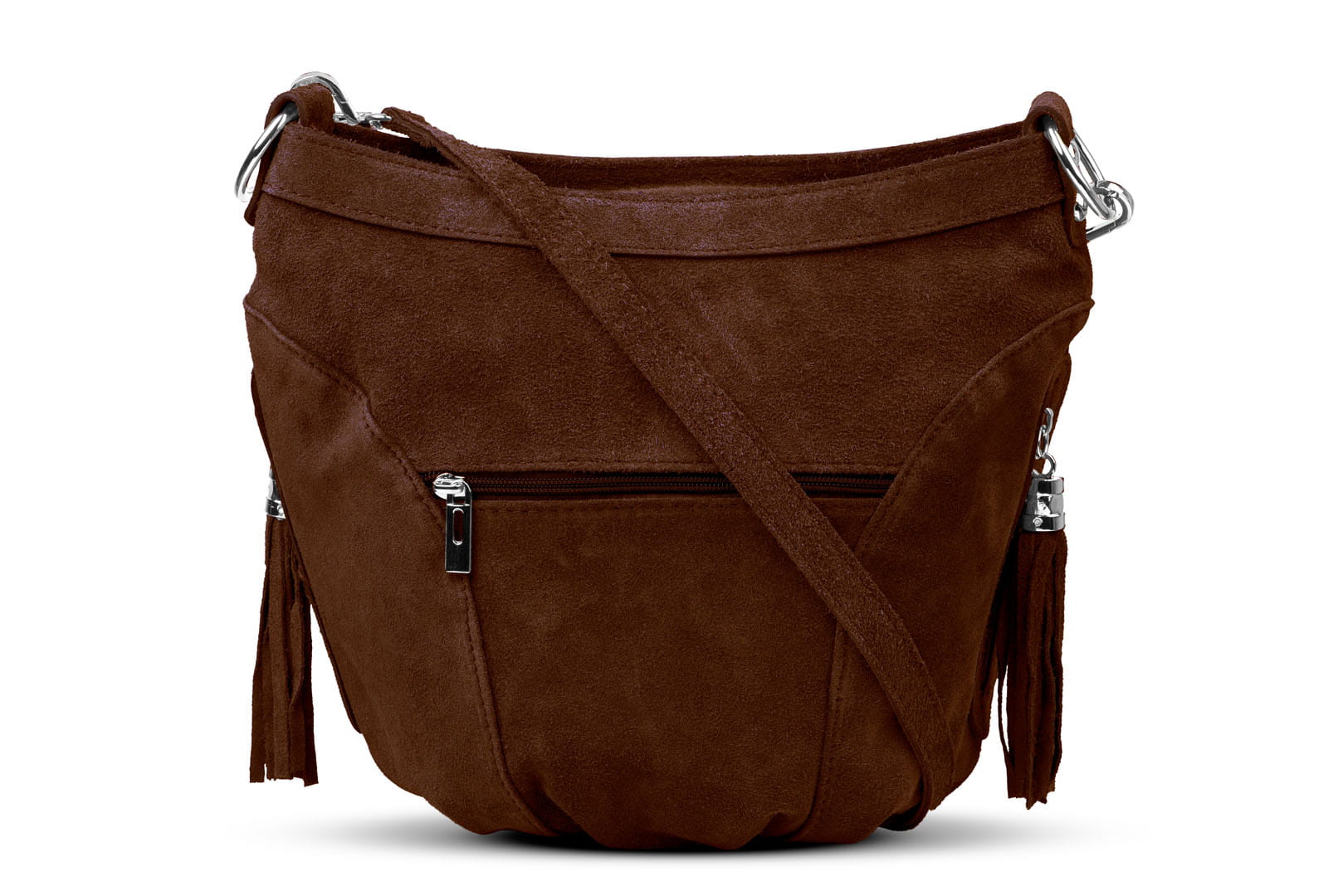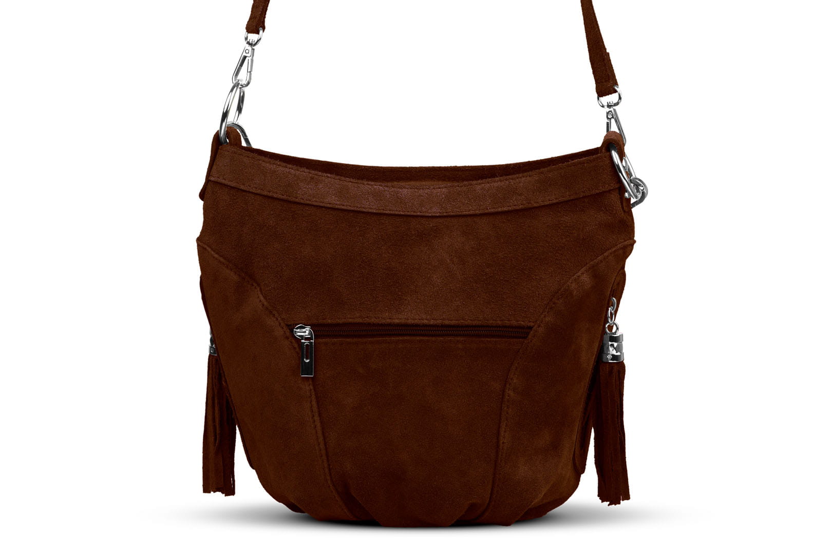 Torebka damska wykonana z wysokogatunkowego włoskiego zamszu naturalnego. Po obu stronach torebki znajdują się dwie praktyczne kieszonki. Dzięki dwóm paskom różnej długości, torebkę można nosić w ręku lub na ramieniu.