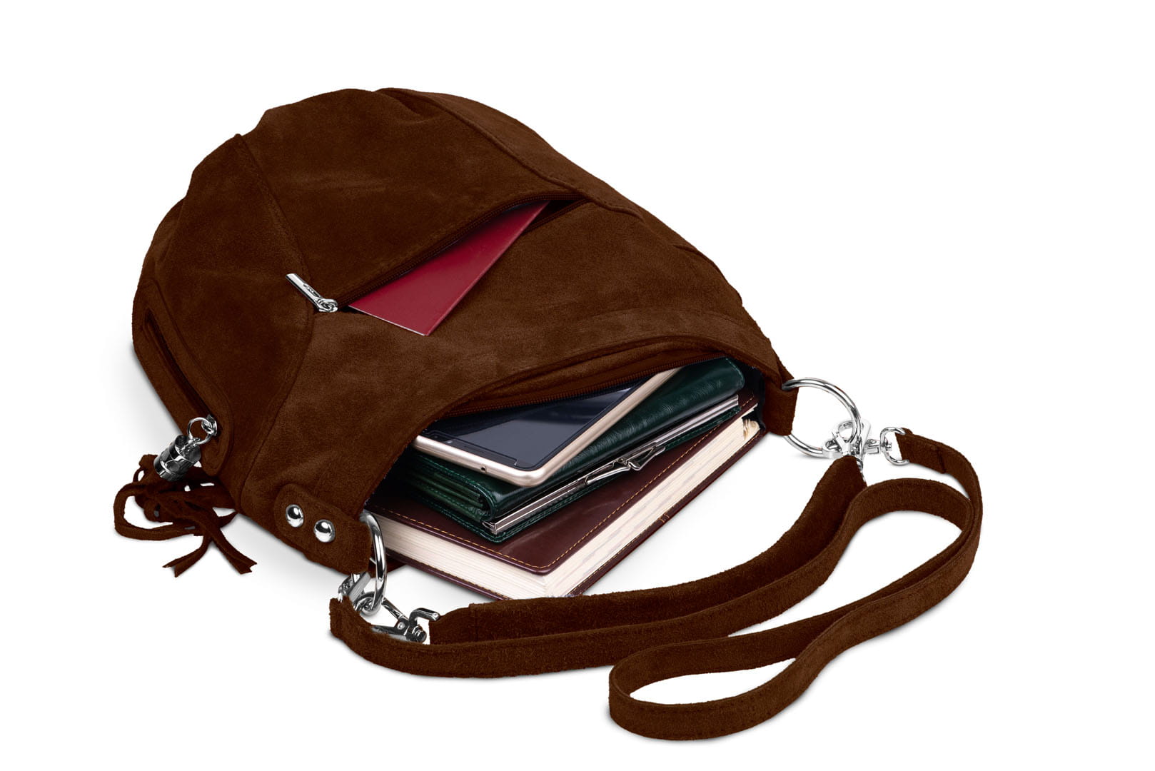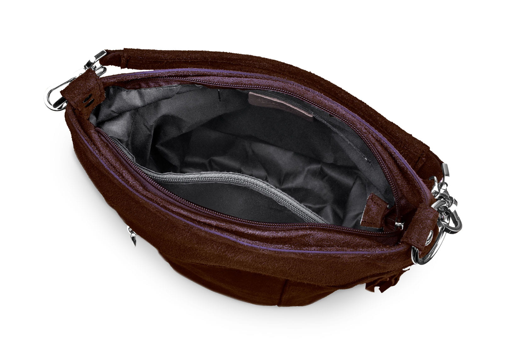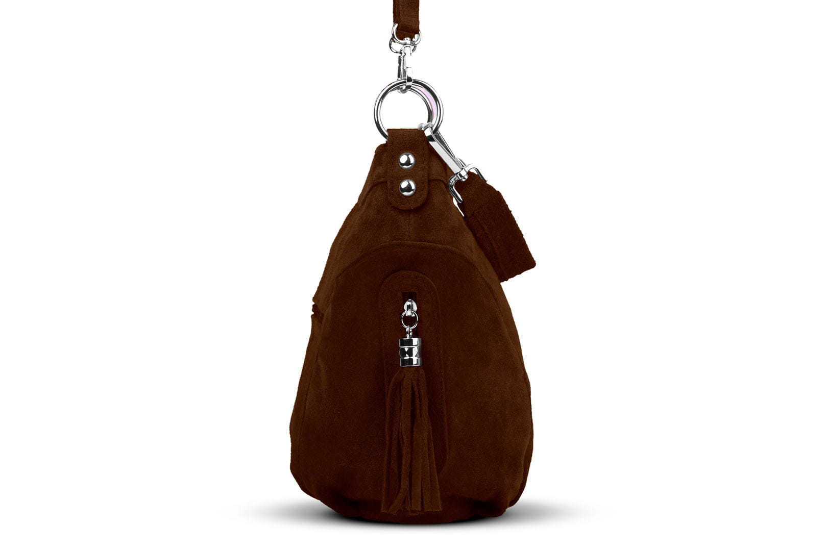 Torebka damska wykonana z wysokogatunkowego włoskiego zamszu naturalnego. Po obu stronach torebki znajdują się dwie praktyczne kieszonki. Dzięki dwóm paskom różnej długości, torebkę można nosić w ręku lub na ramieniu.