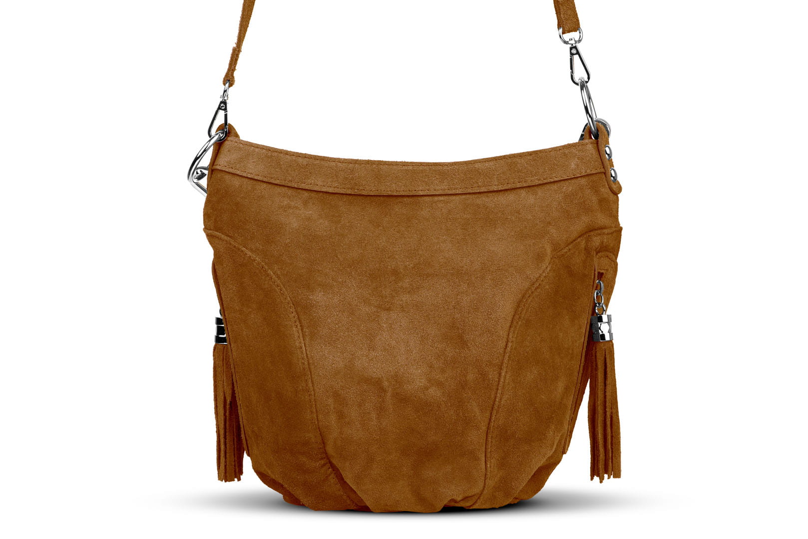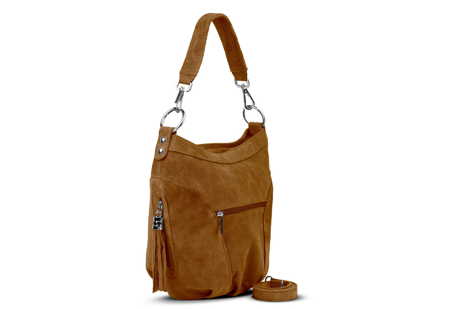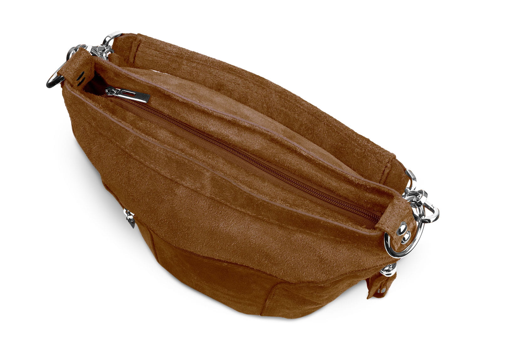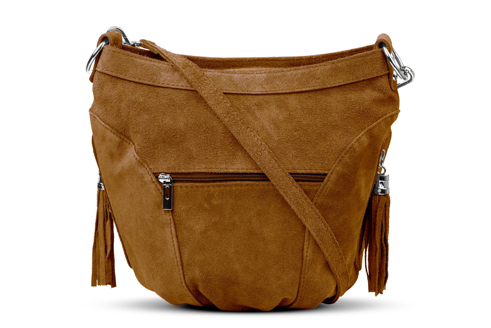 Torebka damska wykonana z wysokogatunkowego włoskiego zamszu naturalnego. Po obu stronach torebki znajdują się dwie praktyczne kieszonki. Dzięki dwóm paskom różnej długości, torebkę można nosić w ręku lub na ramieniu.