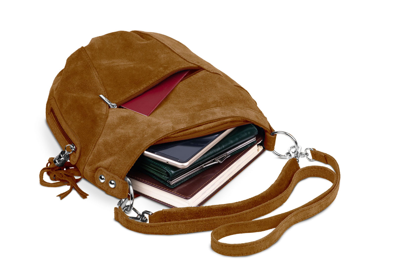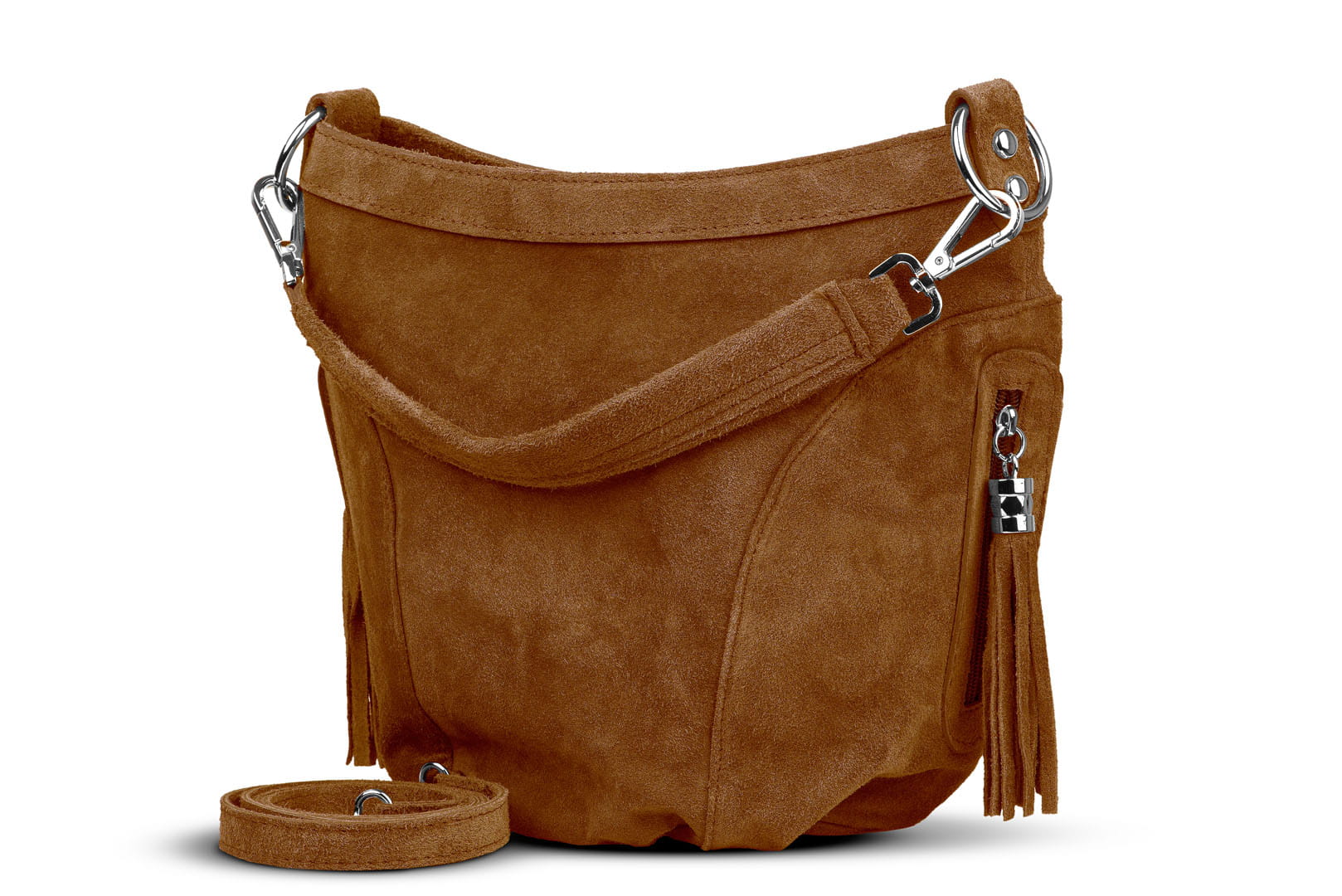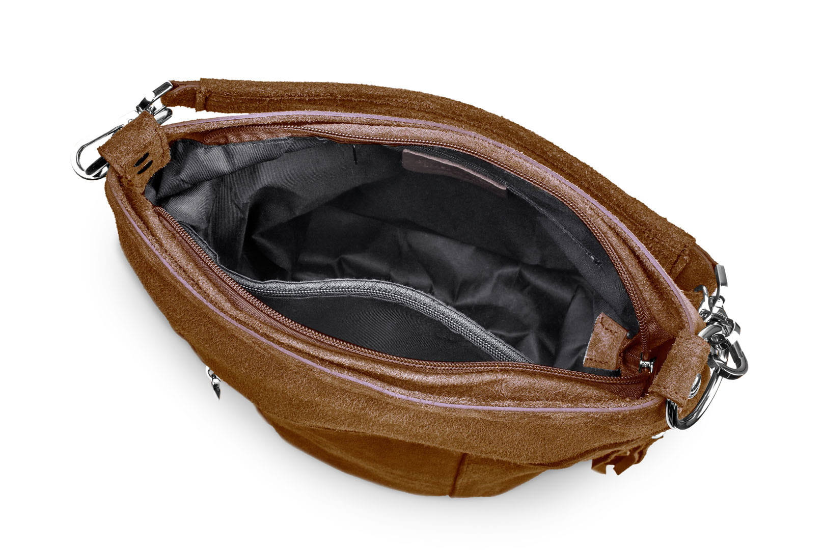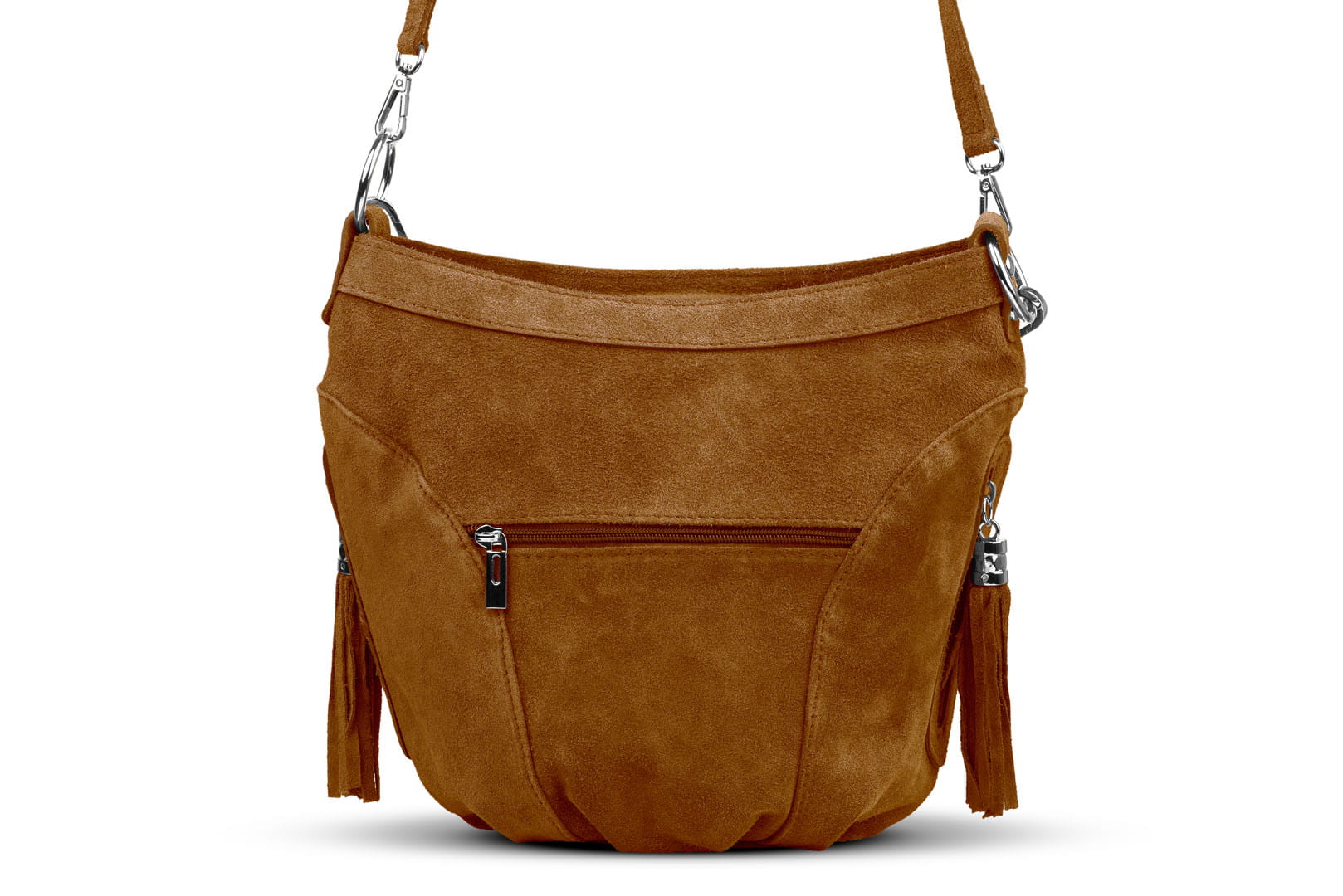 Torebka damska wykonana z wysokogatunkowego włoskiego zamszu naturalnego. Po obu stronach torebki znajdują się dwie praktyczne kieszonki. Dzięki dwóm paskom różnej długości, torebkę można nosić w ręku lub na ramieniu.