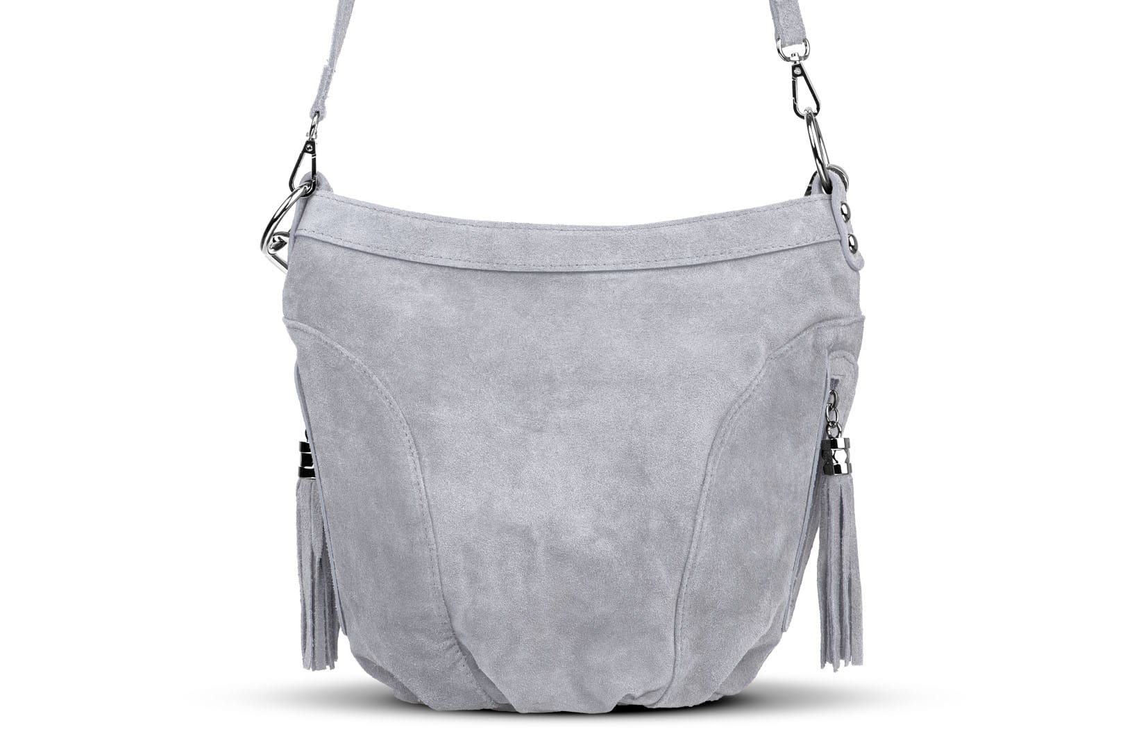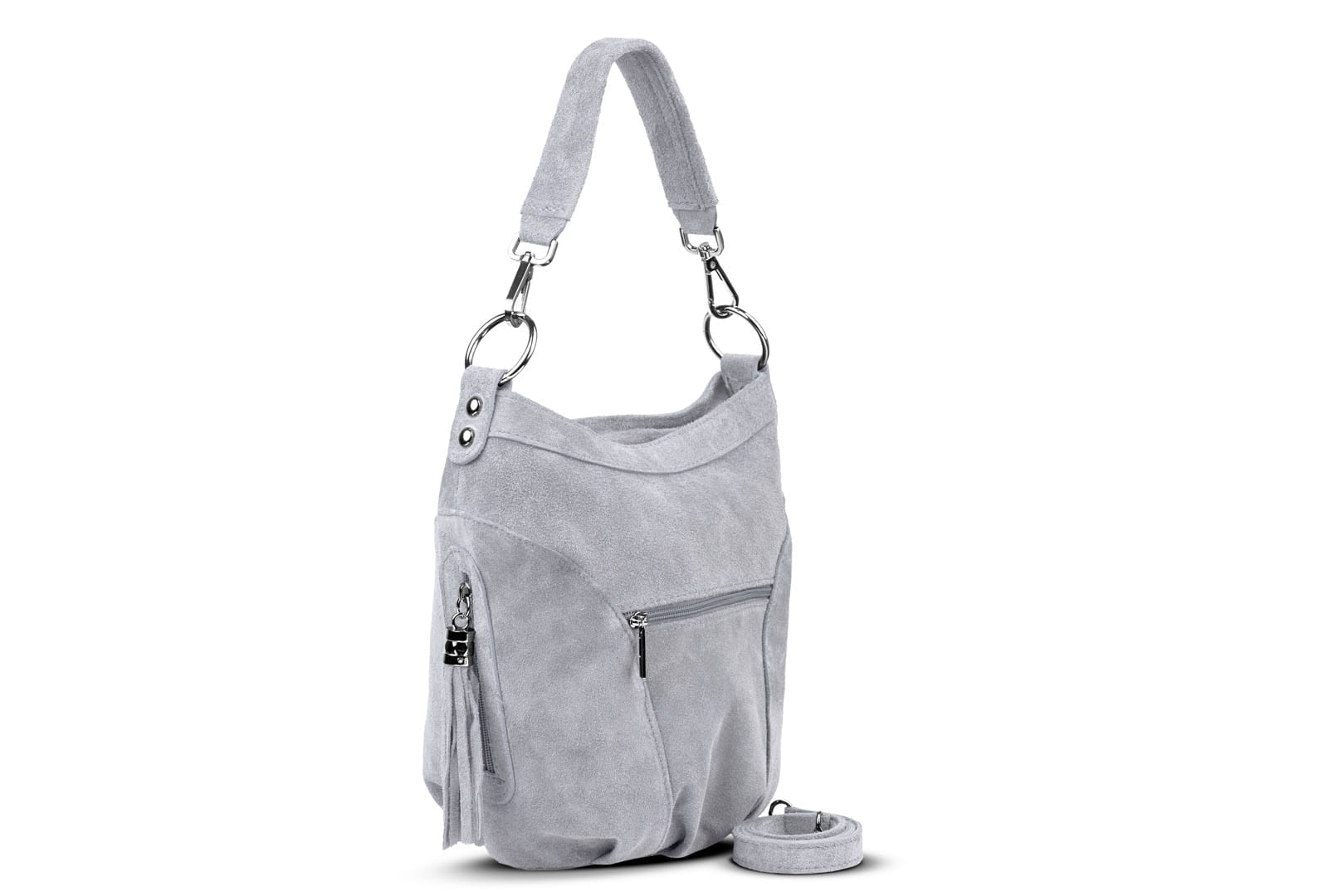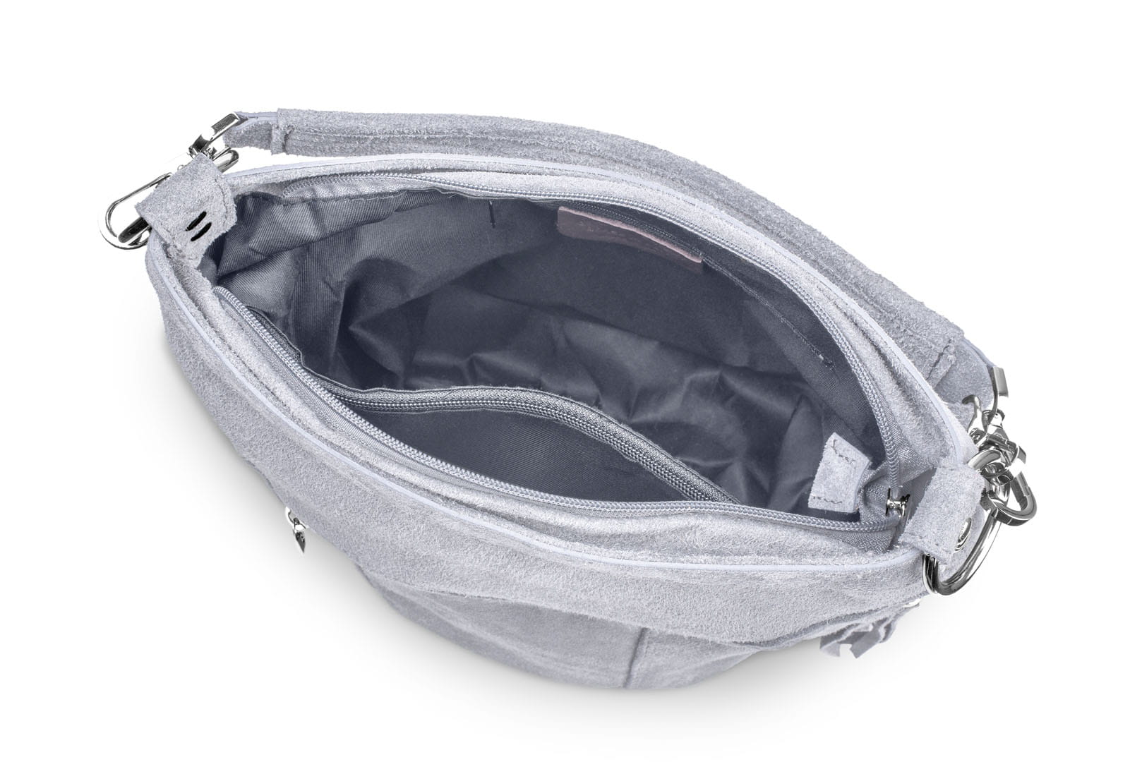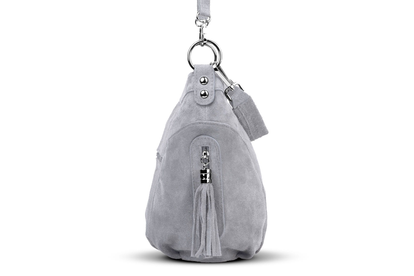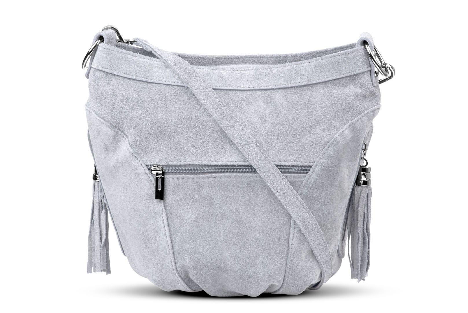Torebka damska wykonana z wysokogatunkowego włoskiego zamszu naturalnego. Po obu stronach torebki znajdują się dwie praktyczne kieszonki. Dzięki dwóm paskom różnej długości, torebkę można nosić w ręku lub na ramieniu.
