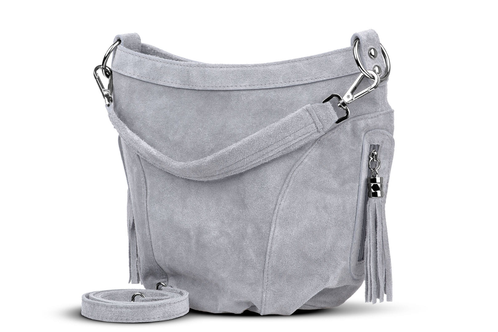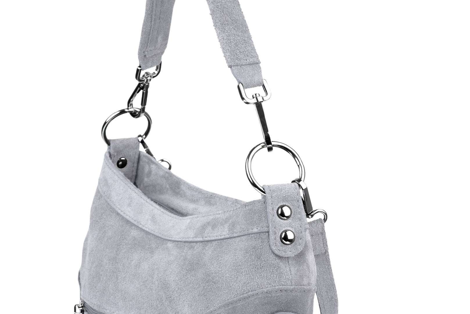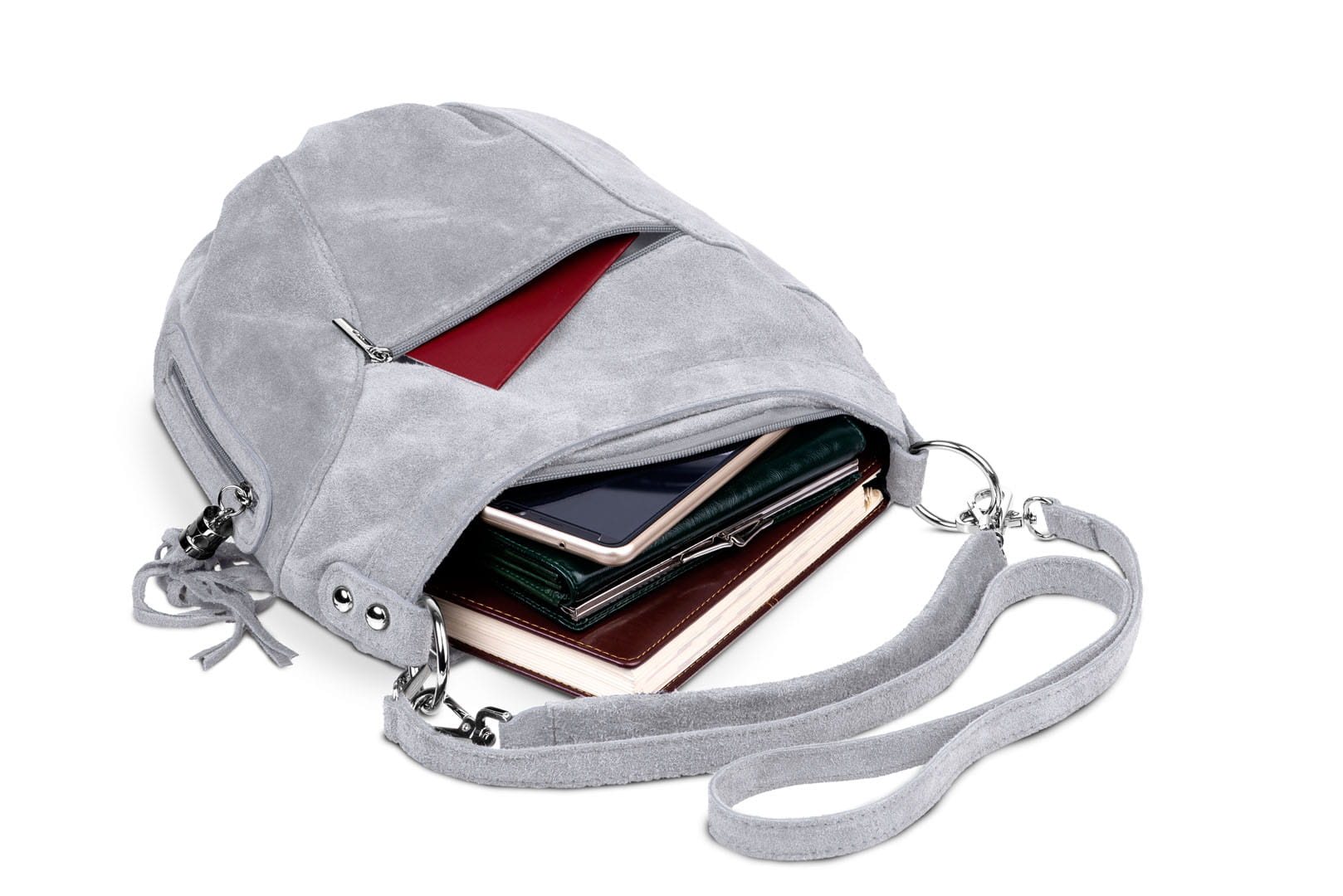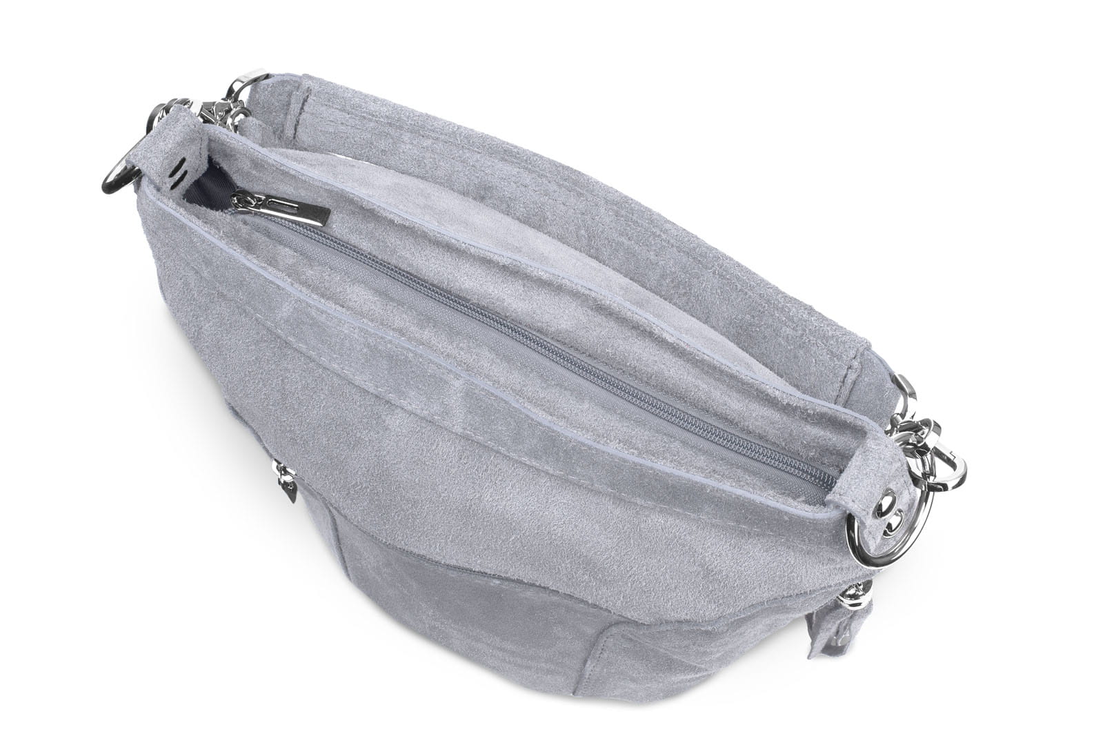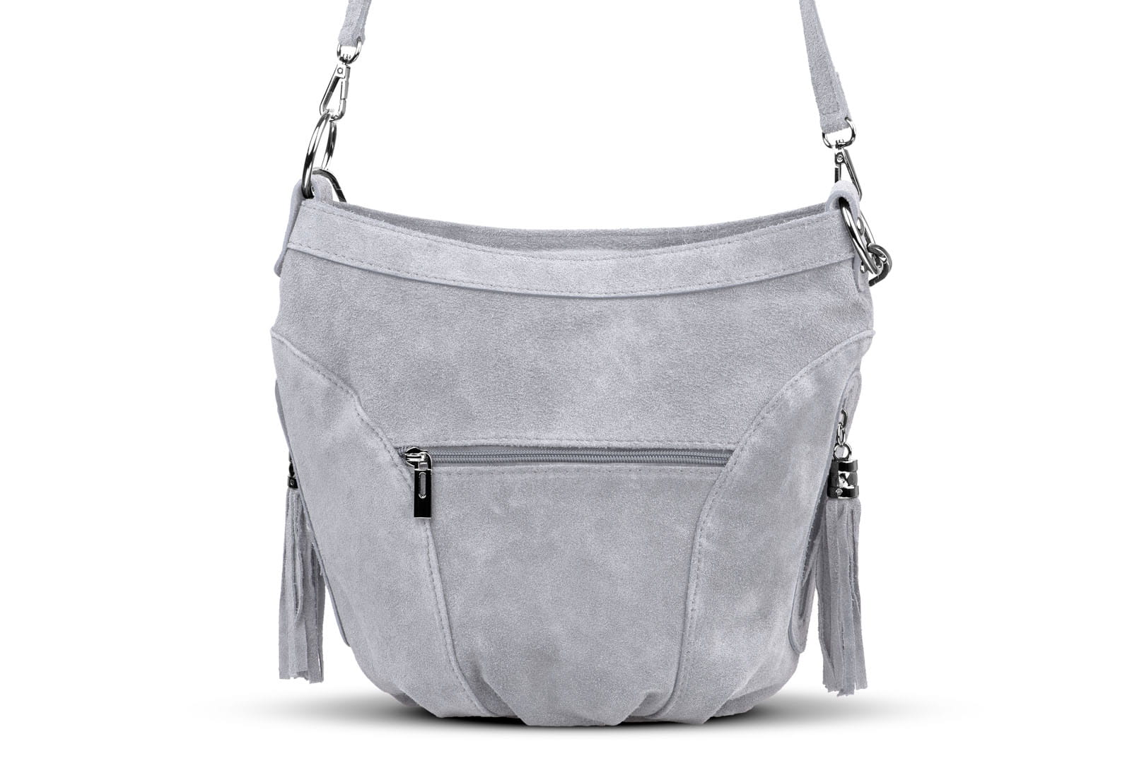 Torebka damska wykonana z wysokogatunkowego włoskiego zamszu naturalnego. Po obu stronach torebki znajdują się dwie praktyczne kieszonki. Dzięki dwóm paskom różnej długości, torebkę można nosić w ręku lub na ramieniu.