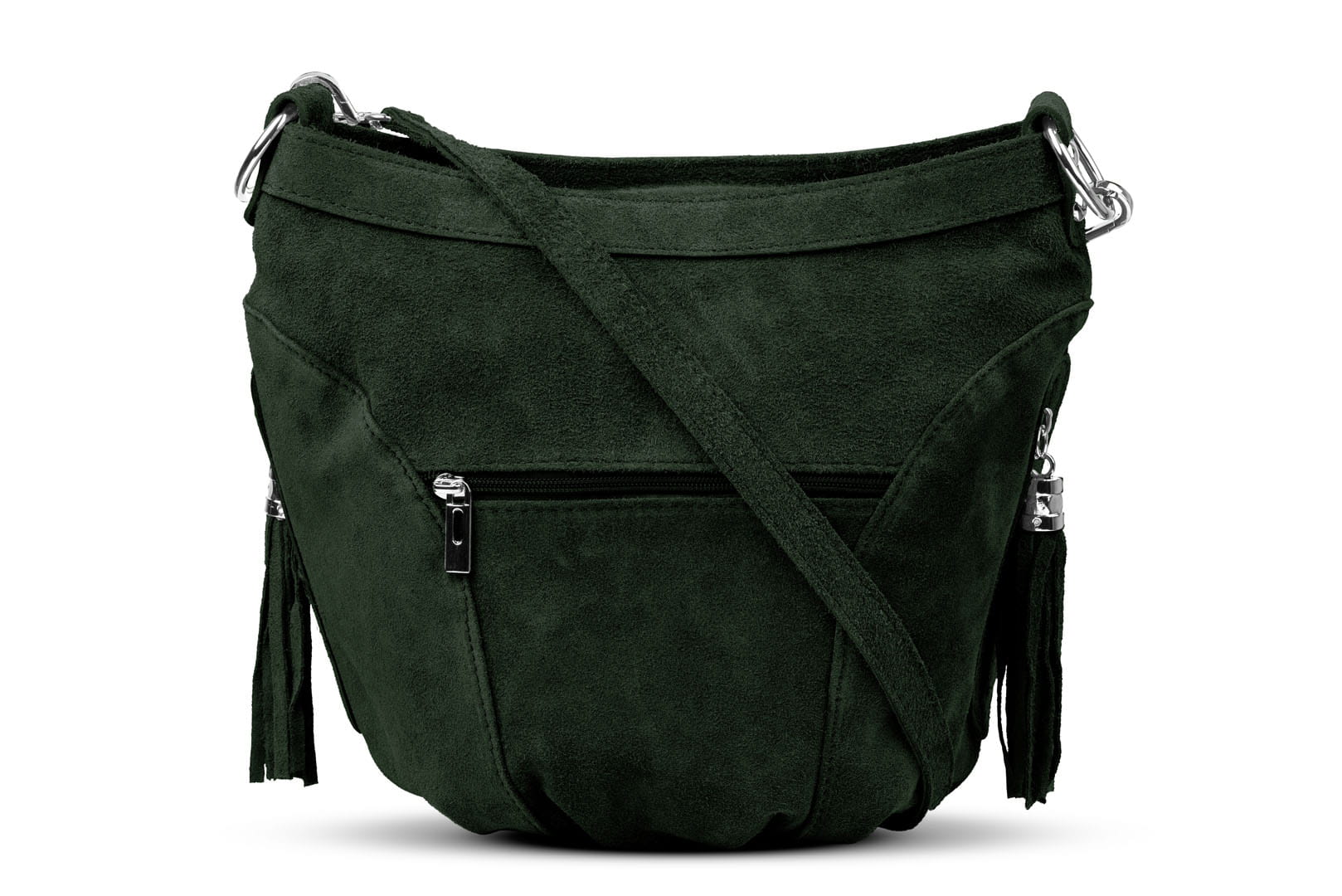 Torebka damska wykonana z wysokogatunkowego włoskiego zamszu naturalnego. Po obu stronach torebki znajdują się dwie praktyczne kieszonki. Dzięki dwóm paskom różnej długości, torebkę można nosić w ręku lub na ramieniu.