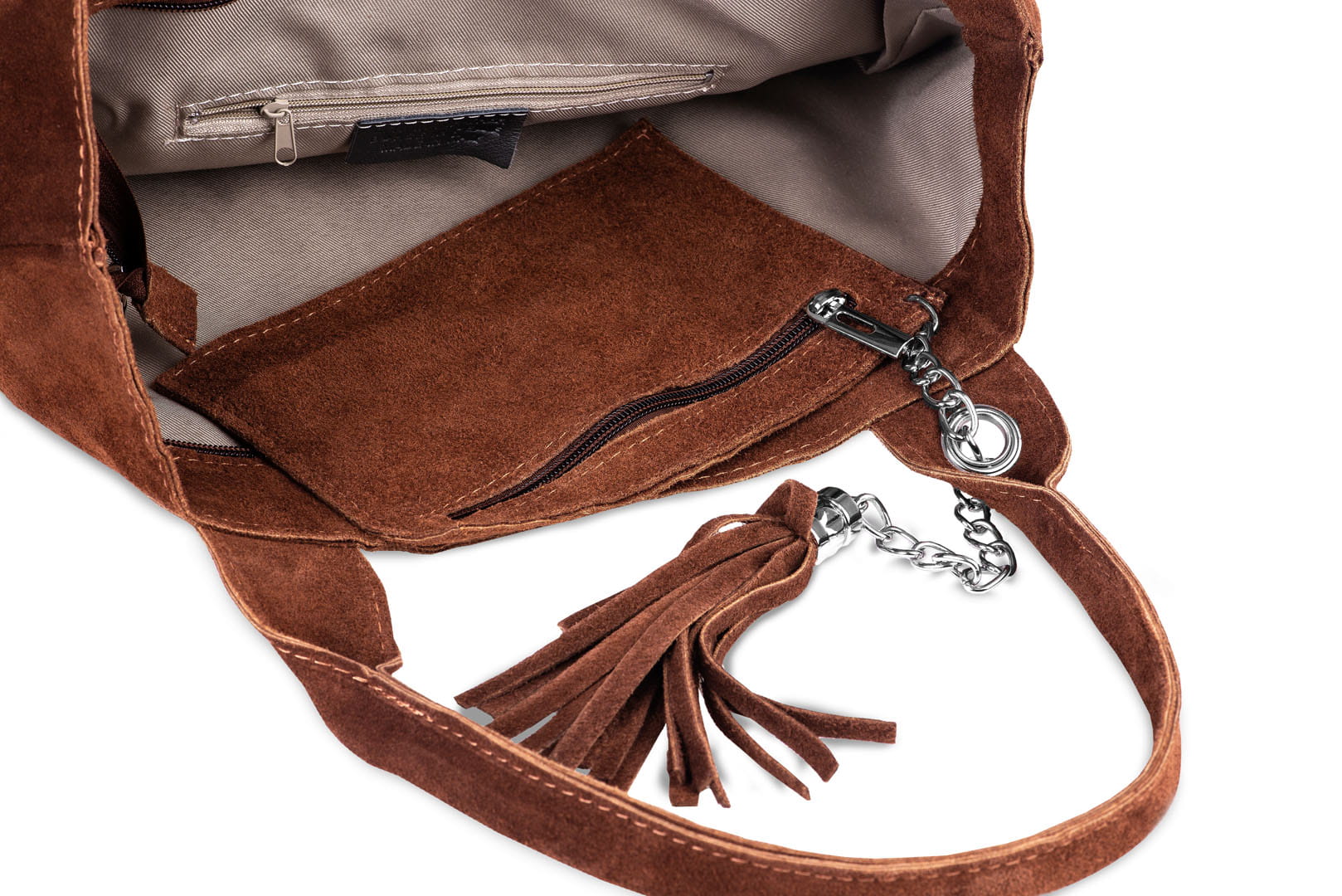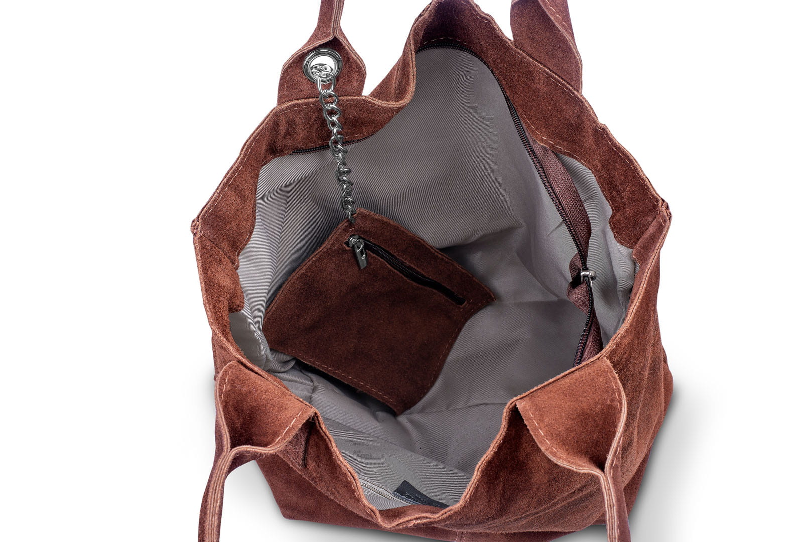 Torba damska wykonana z wysokogatunkowego włoskiego zamszu naturalnego. Do torby dołączona jest praktyczna saszetka. Jest ona uwiązana na łańcuszku co z jednej strony uniemożliwia jej zgubienie, a z drugiej pozwala łatwo odnaleźć ją w torbie.