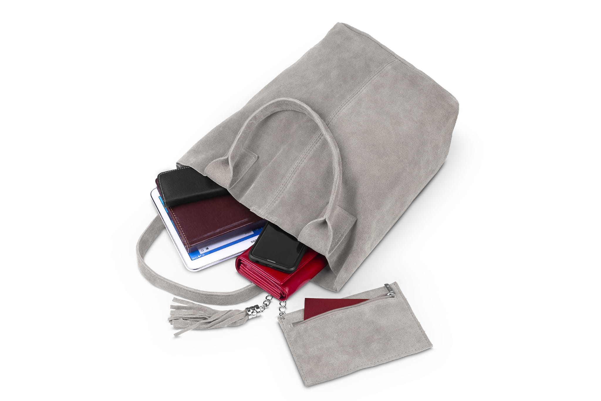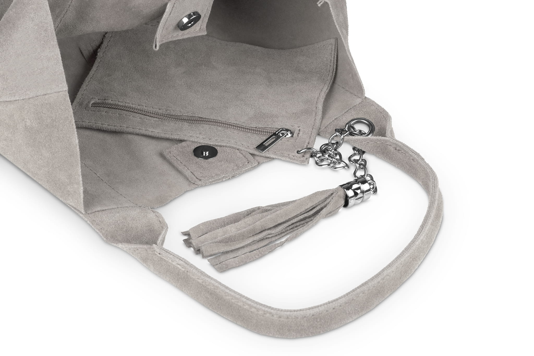 Torba damska wykonana z wysokogatunkowego włoskiego zamszu naturalnego. Do torby dołączona jest praktyczna saszetka. Jest ona uwiązana na łańcuszku co z jednej strony uniemożliwia jej zgubienie, a z drugiej pozwala łatwo odnaleźć ją w torbie.