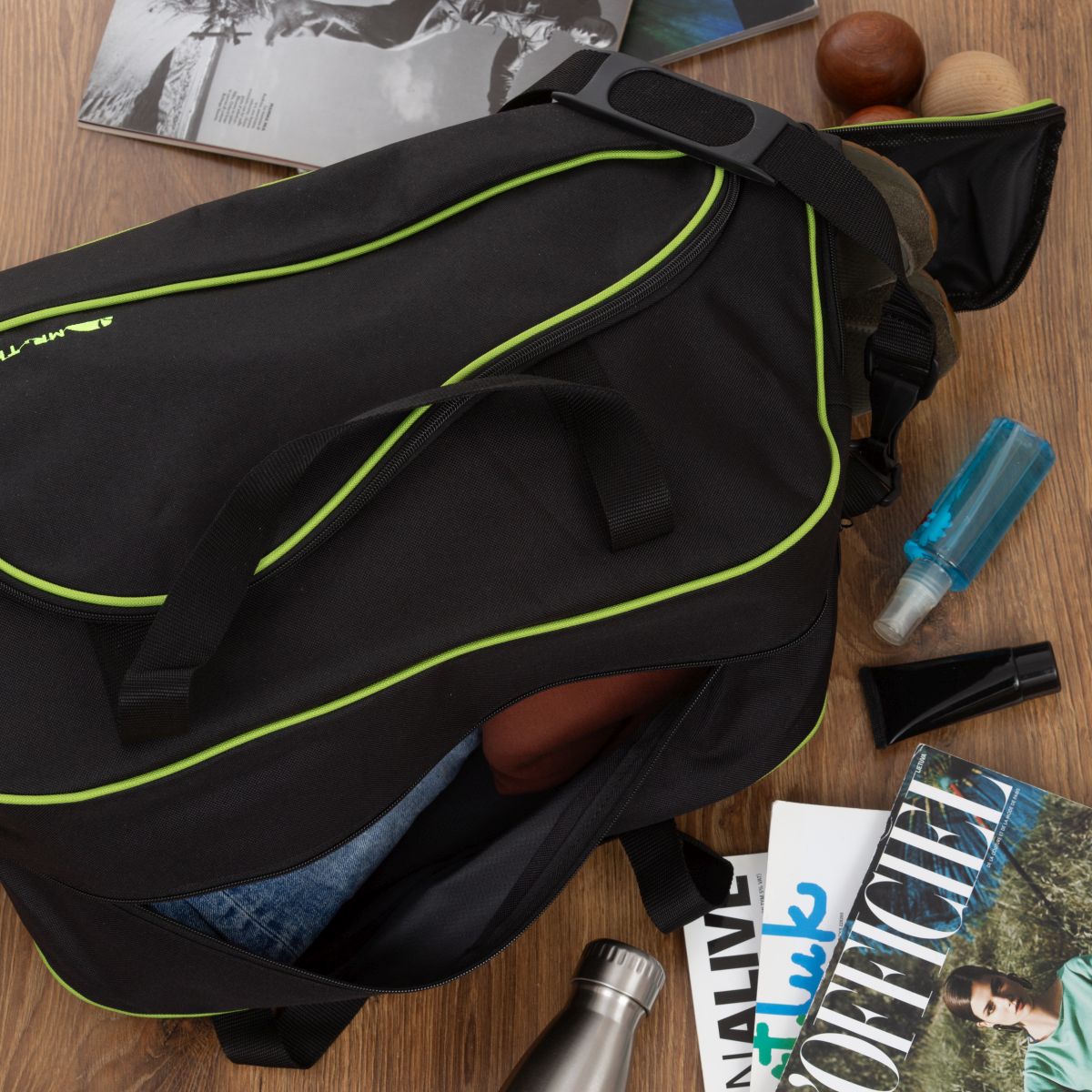 • z boku, funkcjonalna kieszeń na buty.