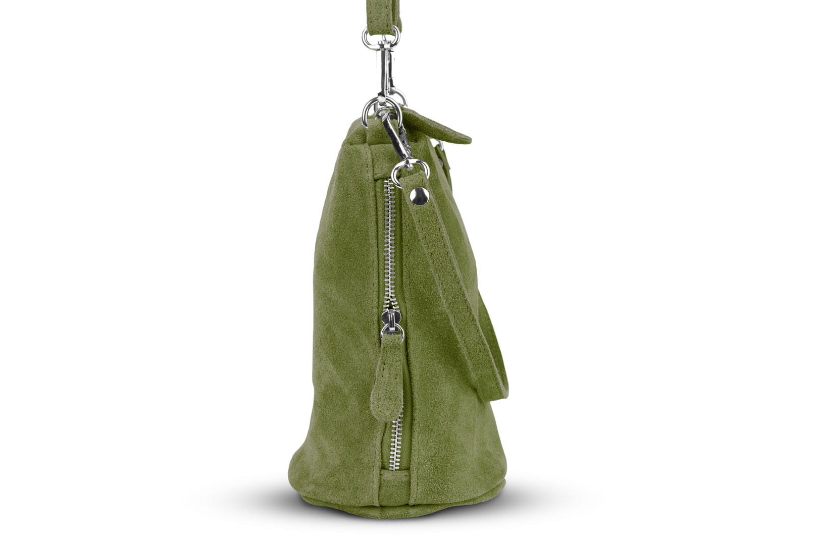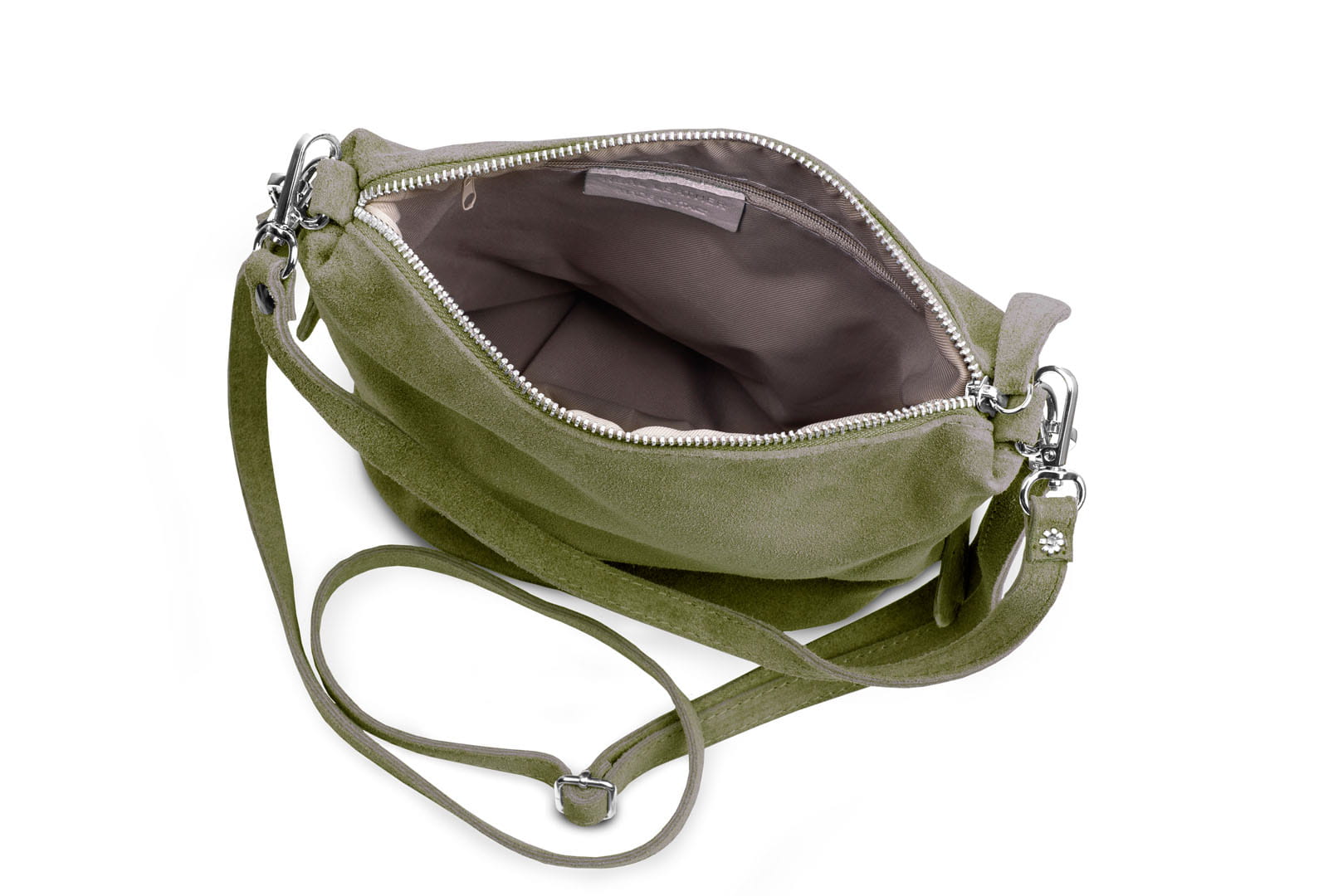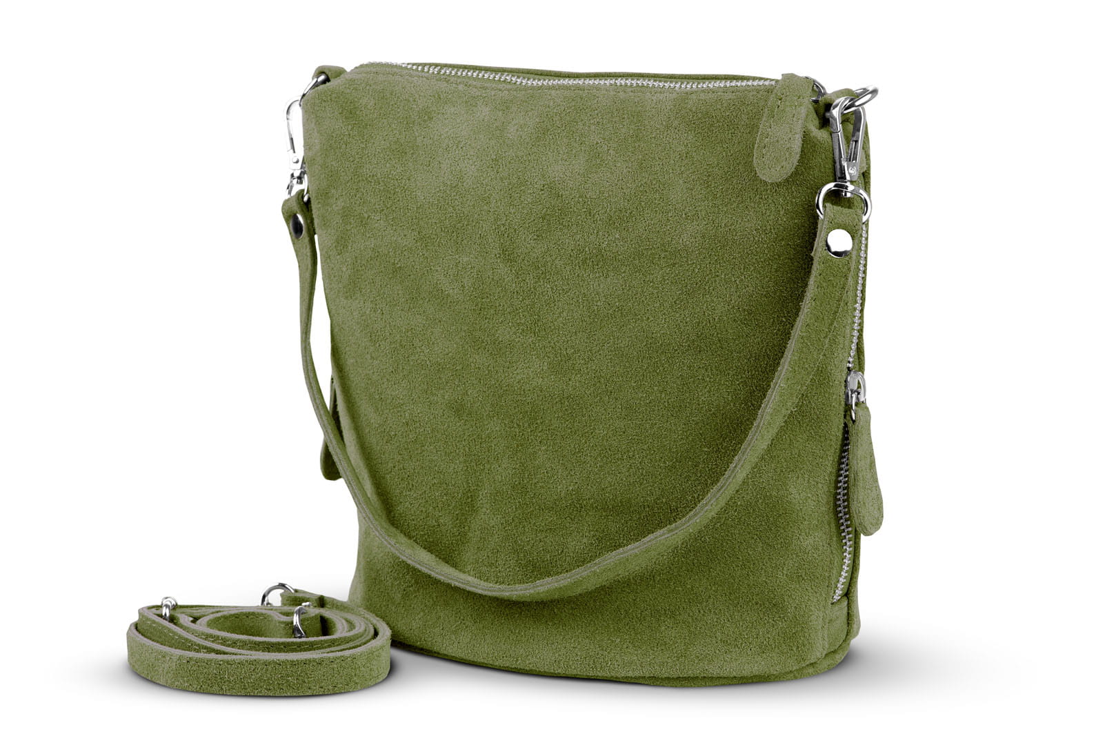 Torebka damska wykonana z wysokogatunkowego włoskiego zamszu naturalnego. Po obu stronach listonoszki znajdują się dwie praktyczne kieszonki. Dzięki dwóm paskom różnej długości, torebkę można nosić w ręku lub na ramieniu.
