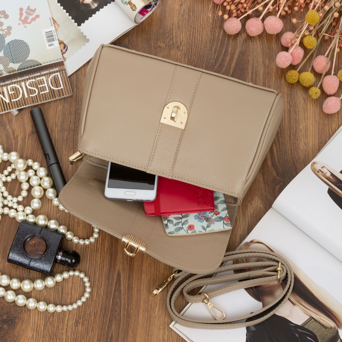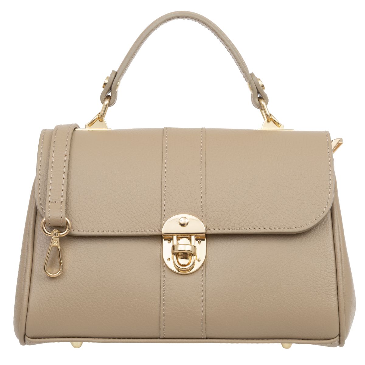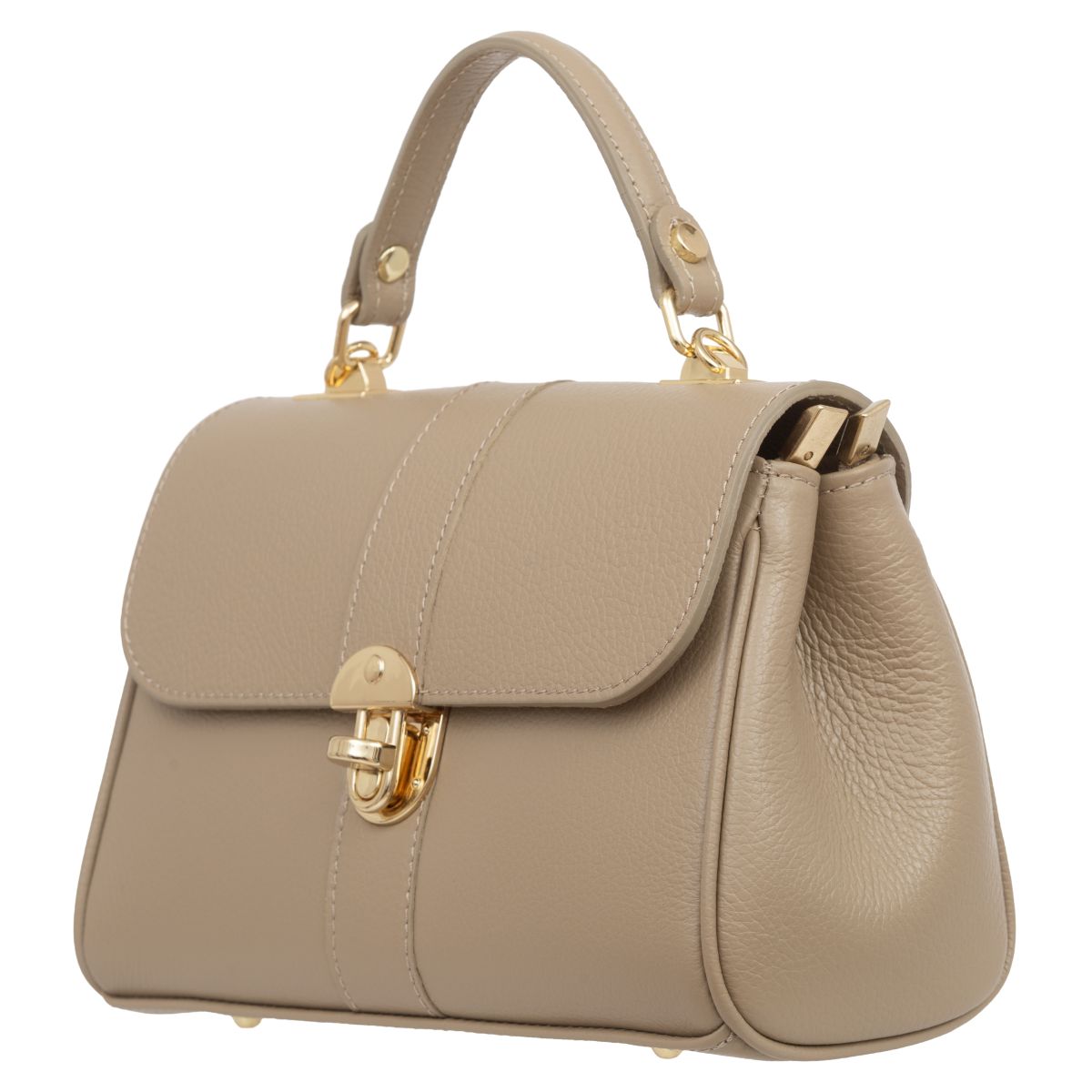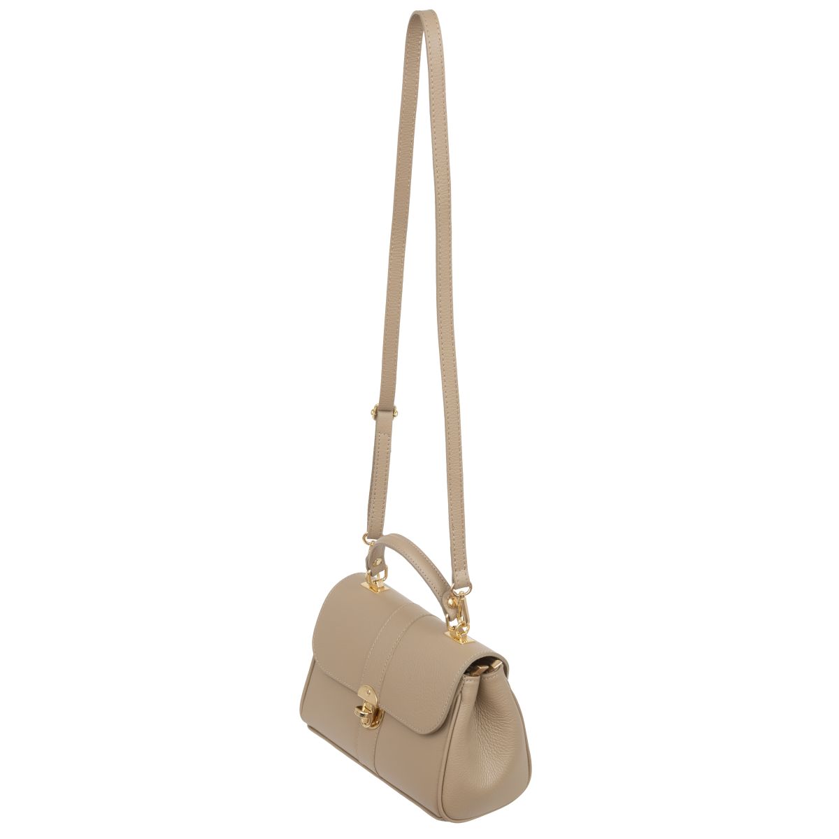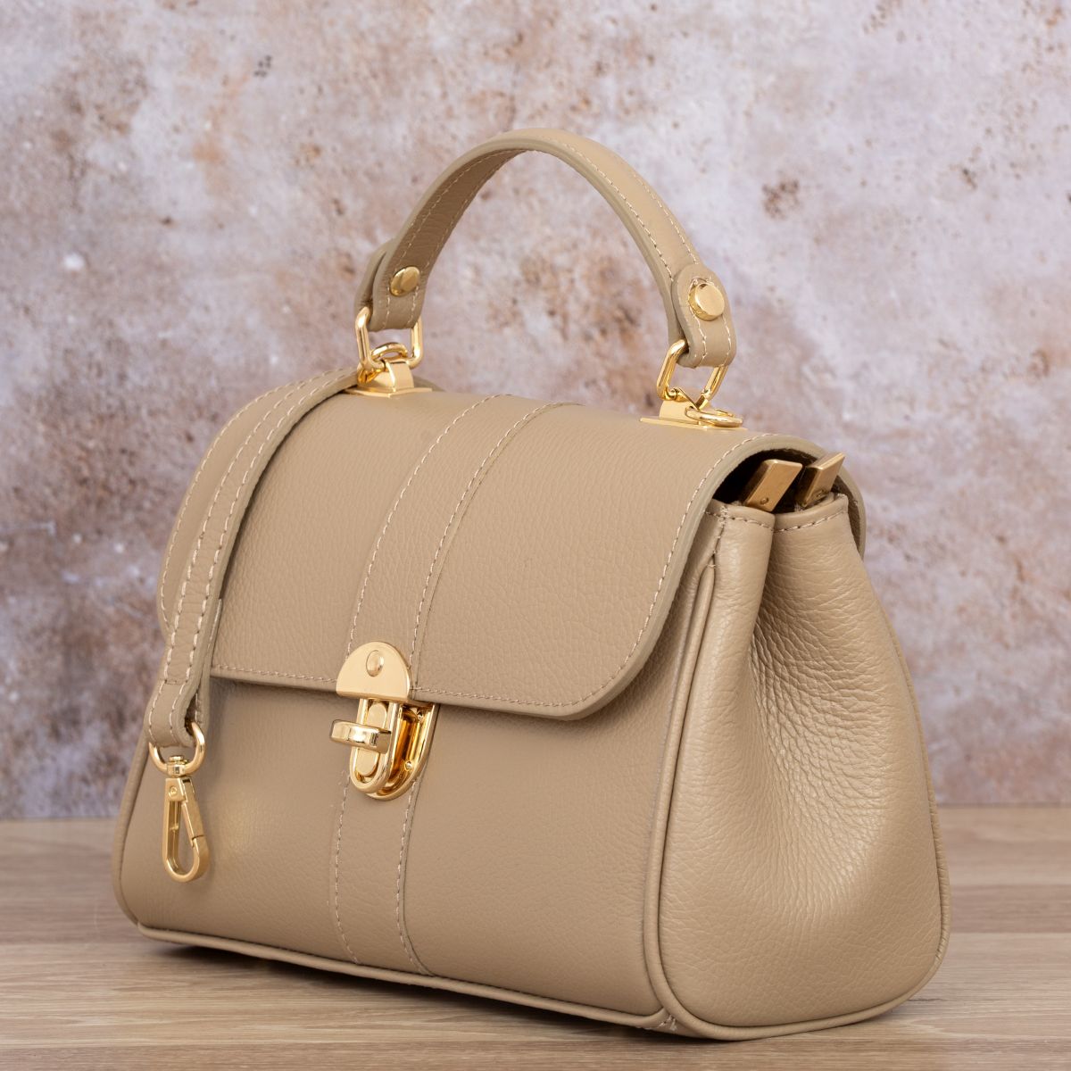 Damski kuferek średniej wielkości, wykonany z włoskiej skóry naturalnej. Górny uchwyt i odpinany pasek pozwala nosić torebkę w ręku lub na ramieniu.