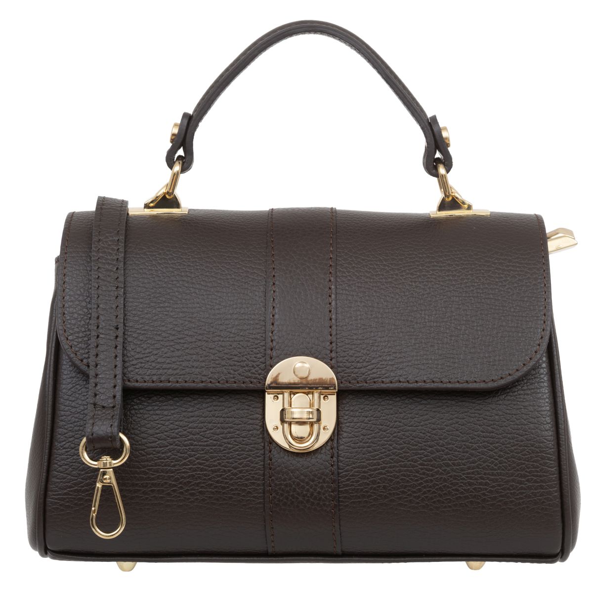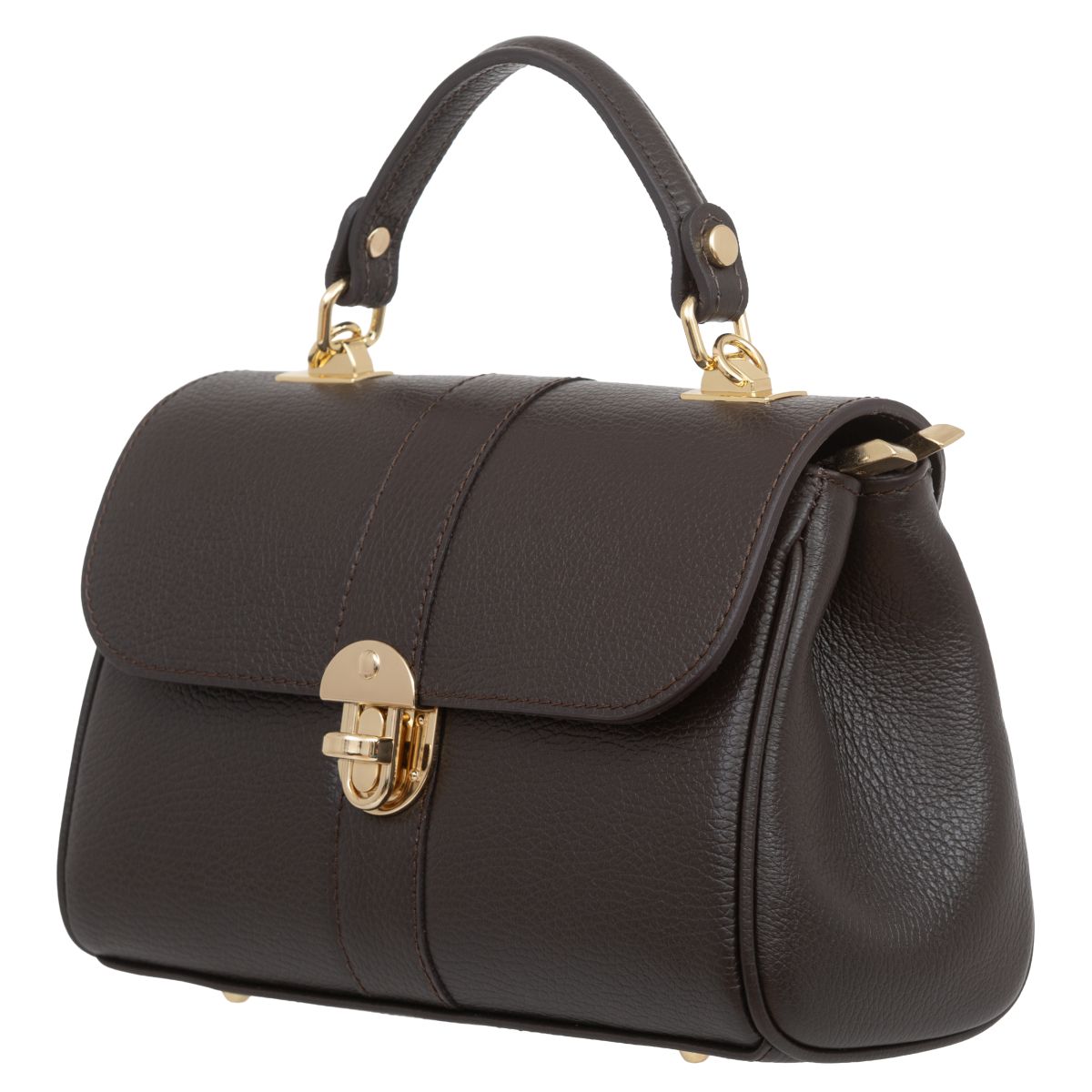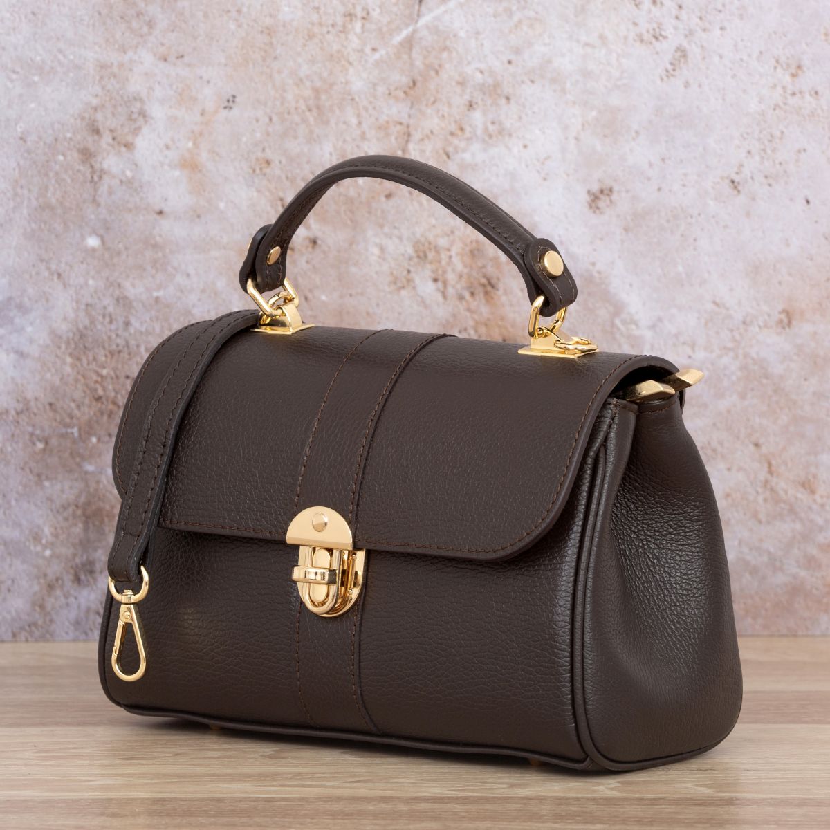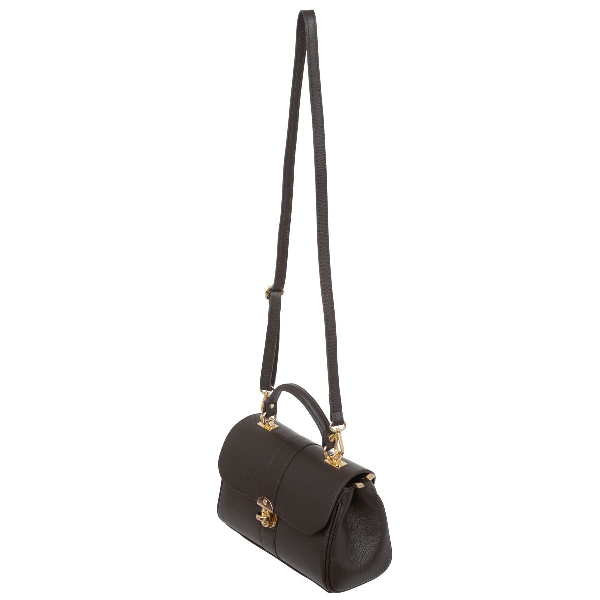 Damski kuferek średniej wielkości, wykonany z włoskiej skóry naturalnej. Górny uchwyt i odpinany pasek pozwala nosić torebkę w ręku lub na ramieniu.
