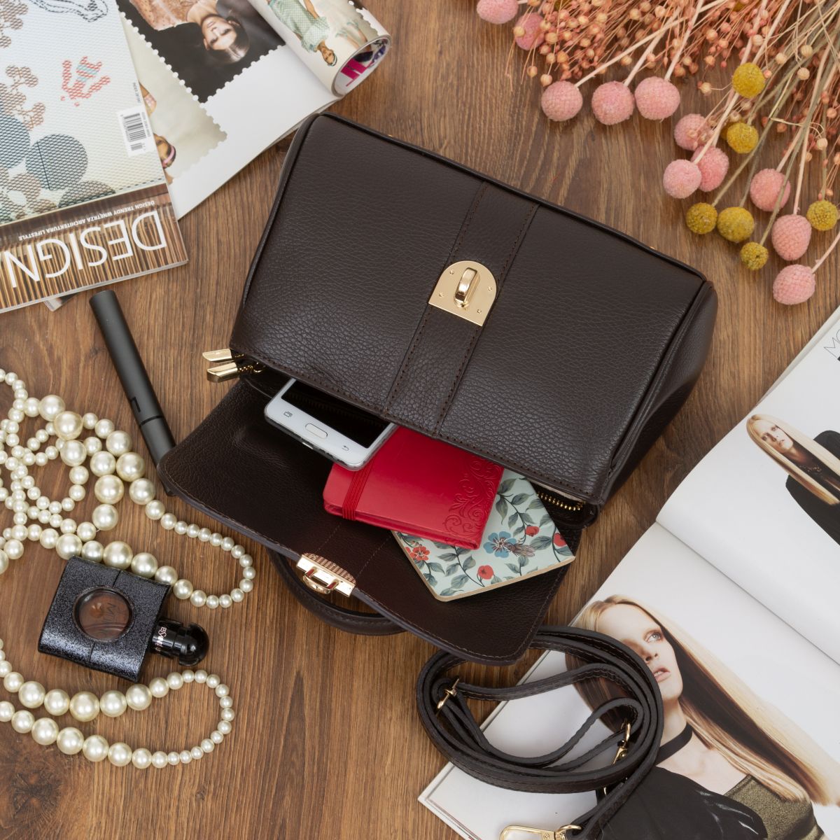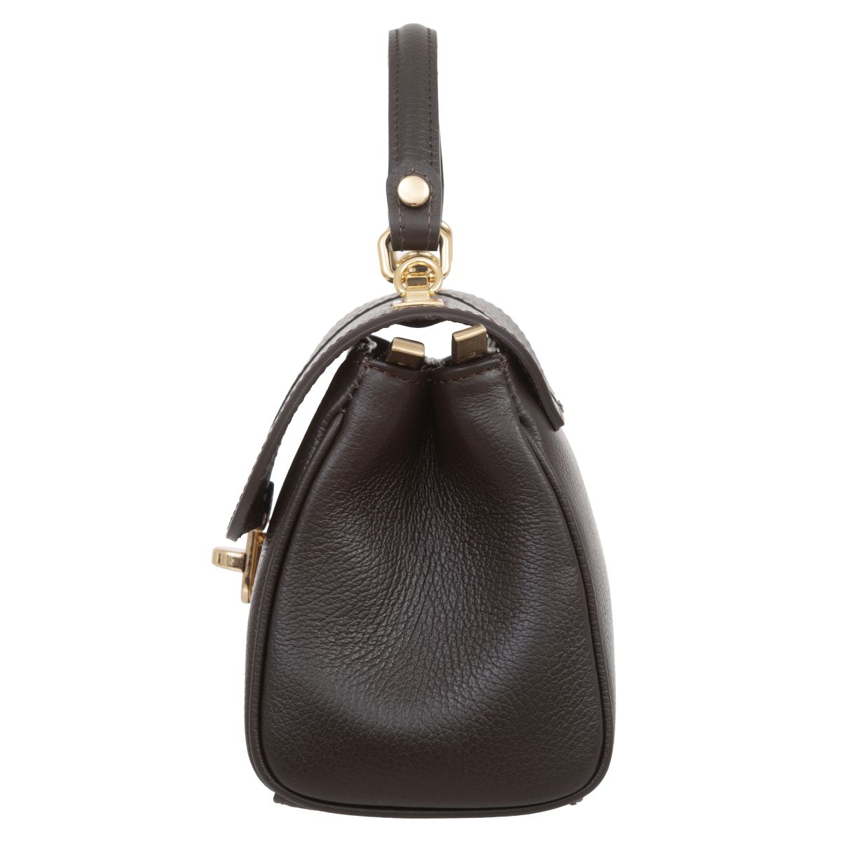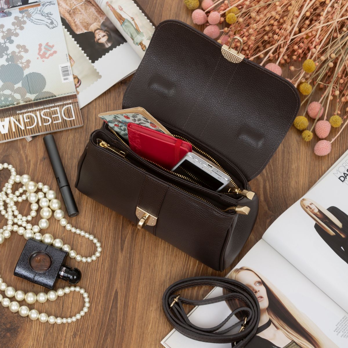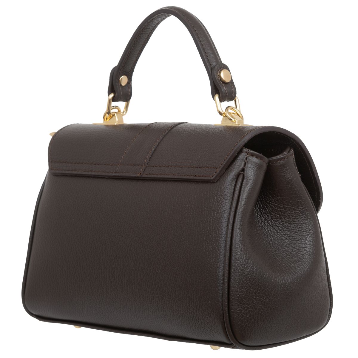 Damski kuferek średniej wielkości, wykonany z włoskiej skóry naturalnej. Górny uchwyt i odpinany pasek pozwala nosić torebkę w ręku lub na ramieniu.