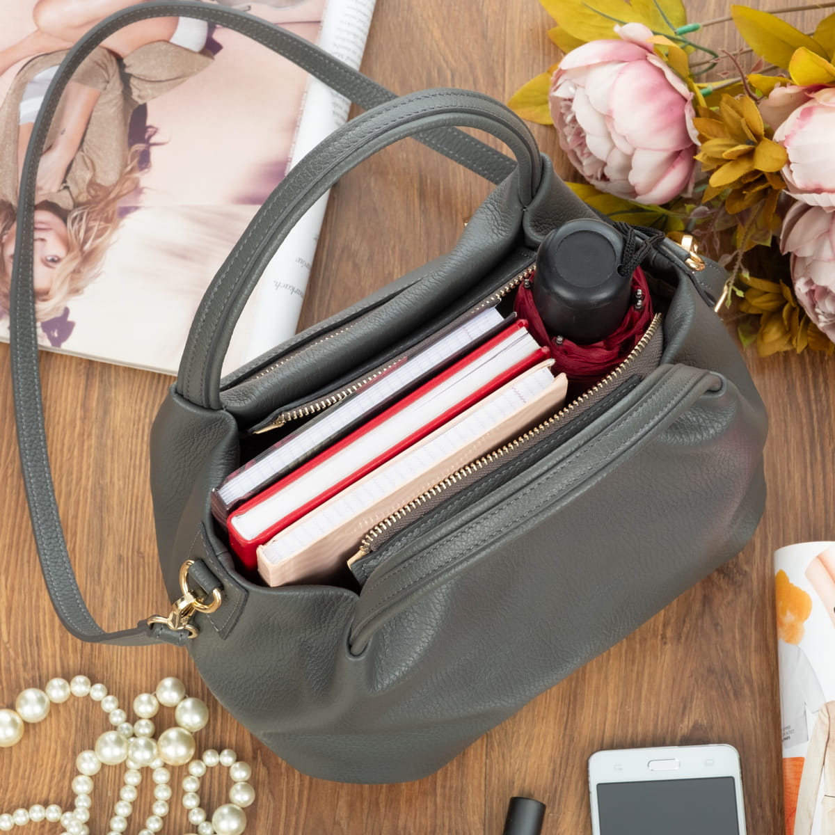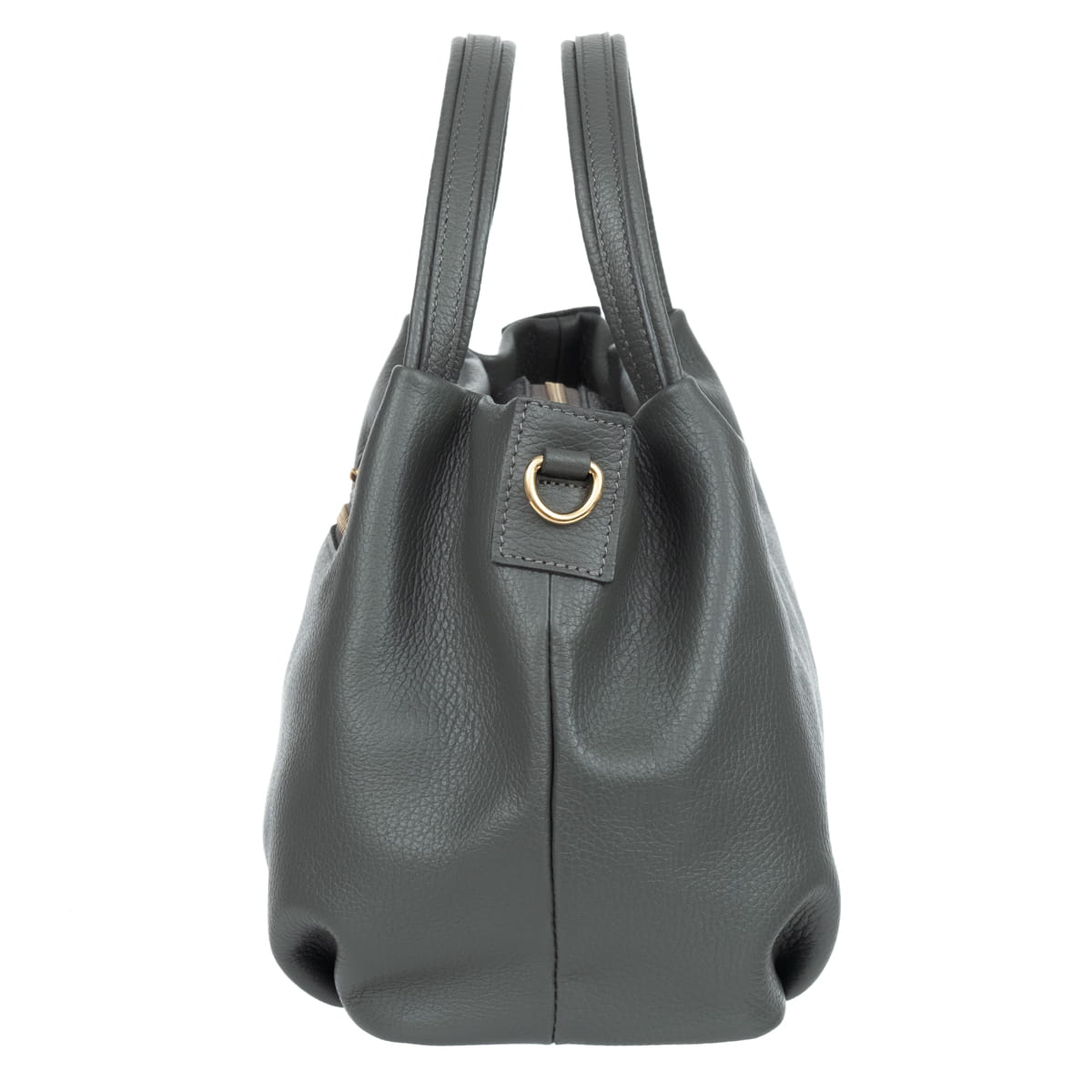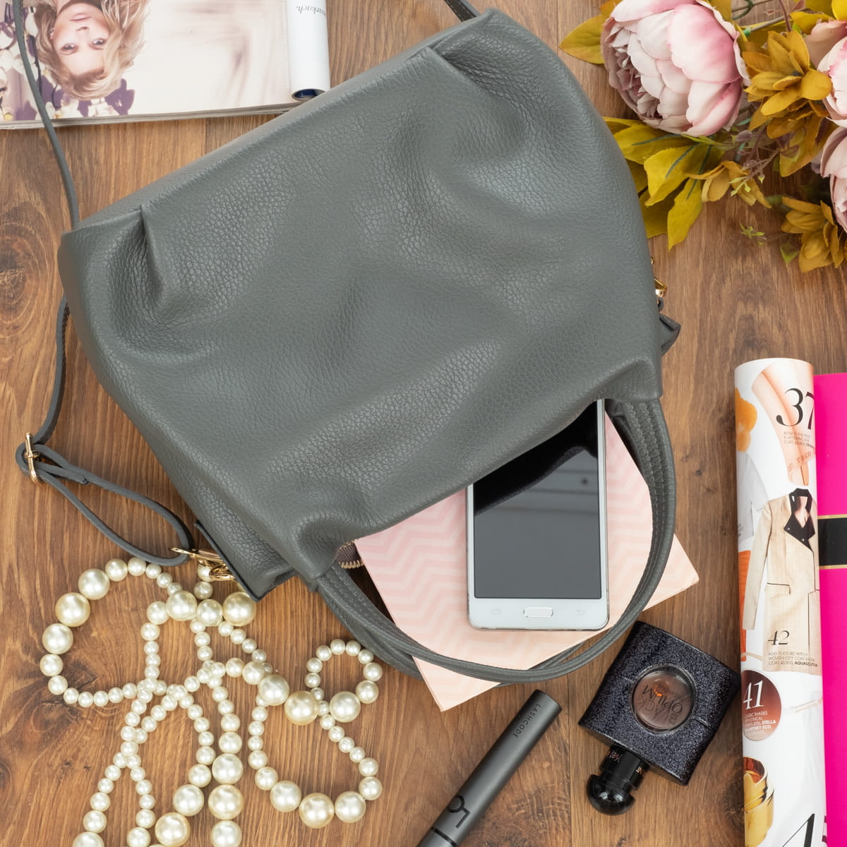 Miejska torebka damska średniej wielkości, wykonana z włoskiej skóry naturalnej. Z tyłu torebki jest kieszonka zamykana na suwak. Para uchwytów i odpinany pasek pozwala nosić torebkę w ręku, na przedramieniu lub na ramieniu.