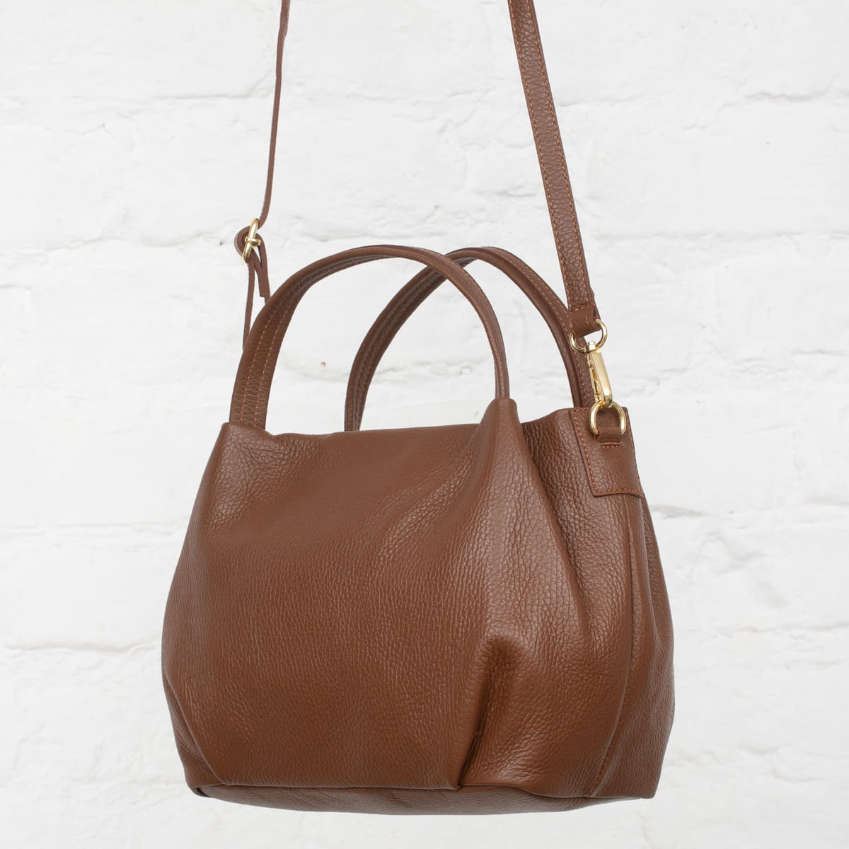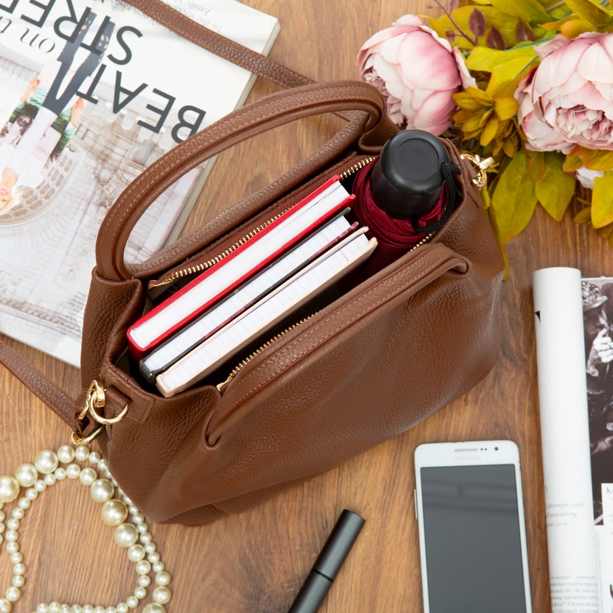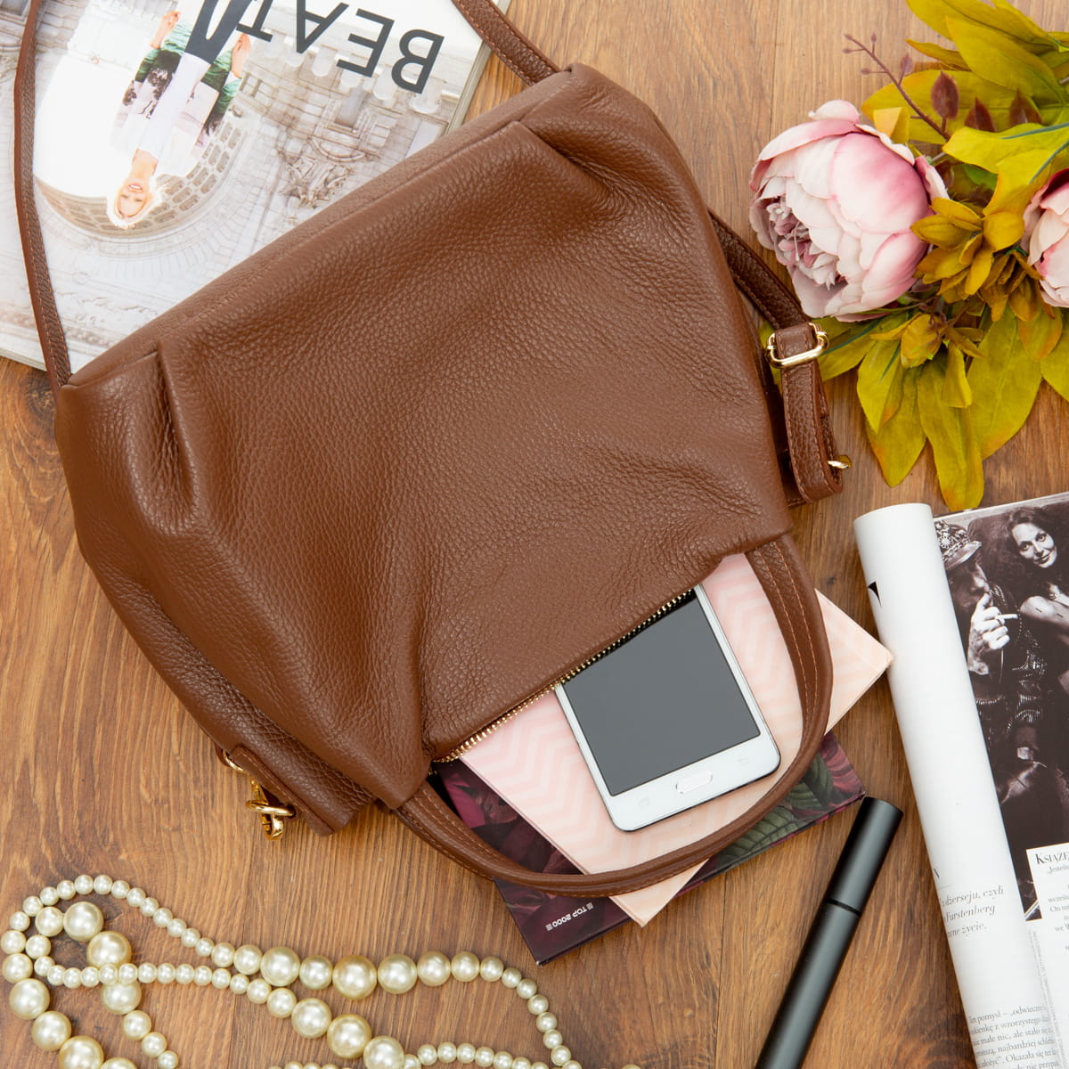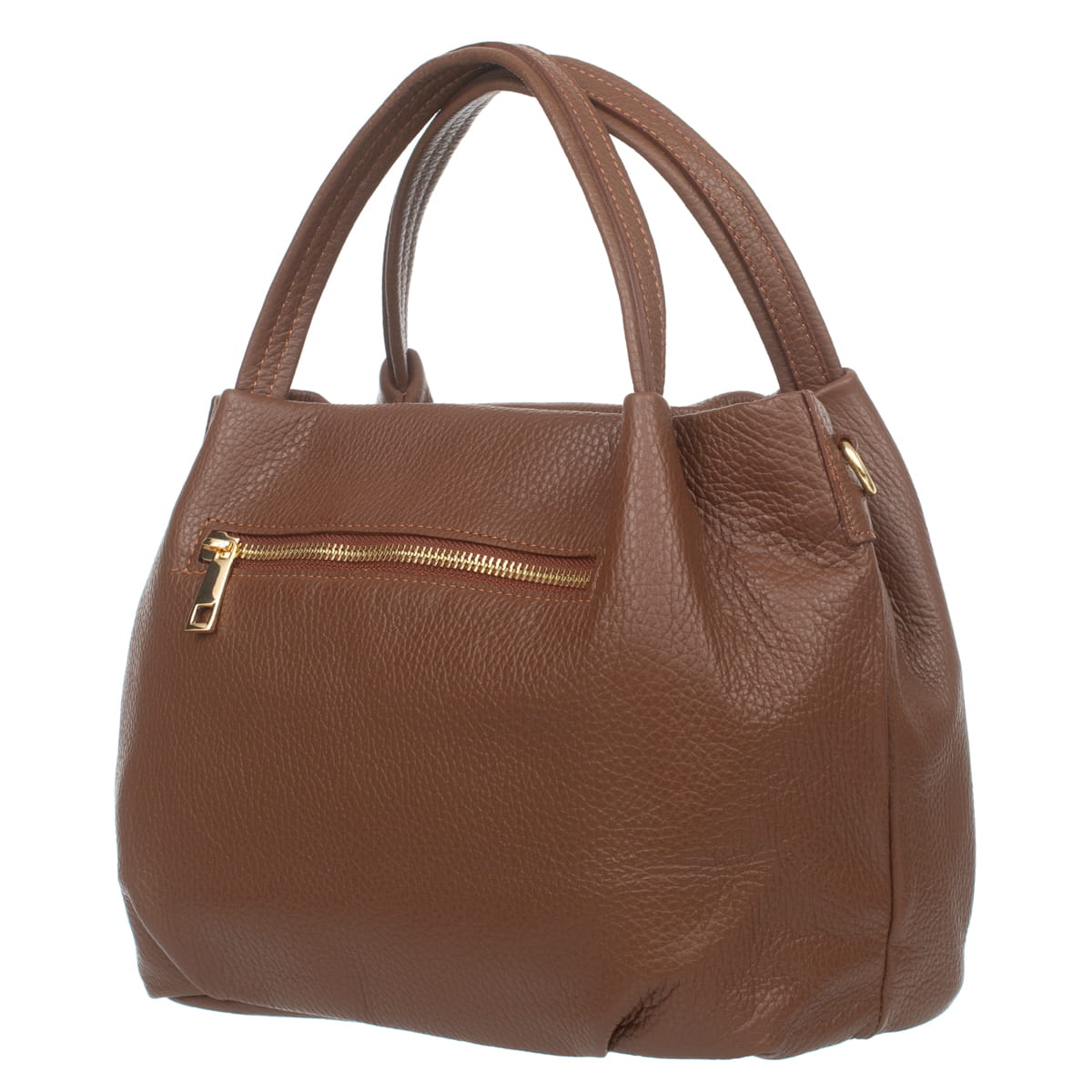 Miejska torebka damska średniej wielkości, wykonana z włoskiej skóry naturalnej. Z tyłu torebki jest kieszonka zamykana na suwak. Para uchwytów i odpinany pasek pozwala nosić torebkę w ręku, na przedramieniu lub na ramieniu.