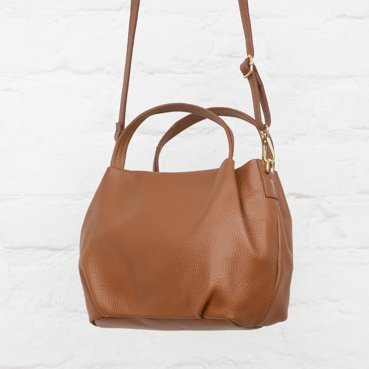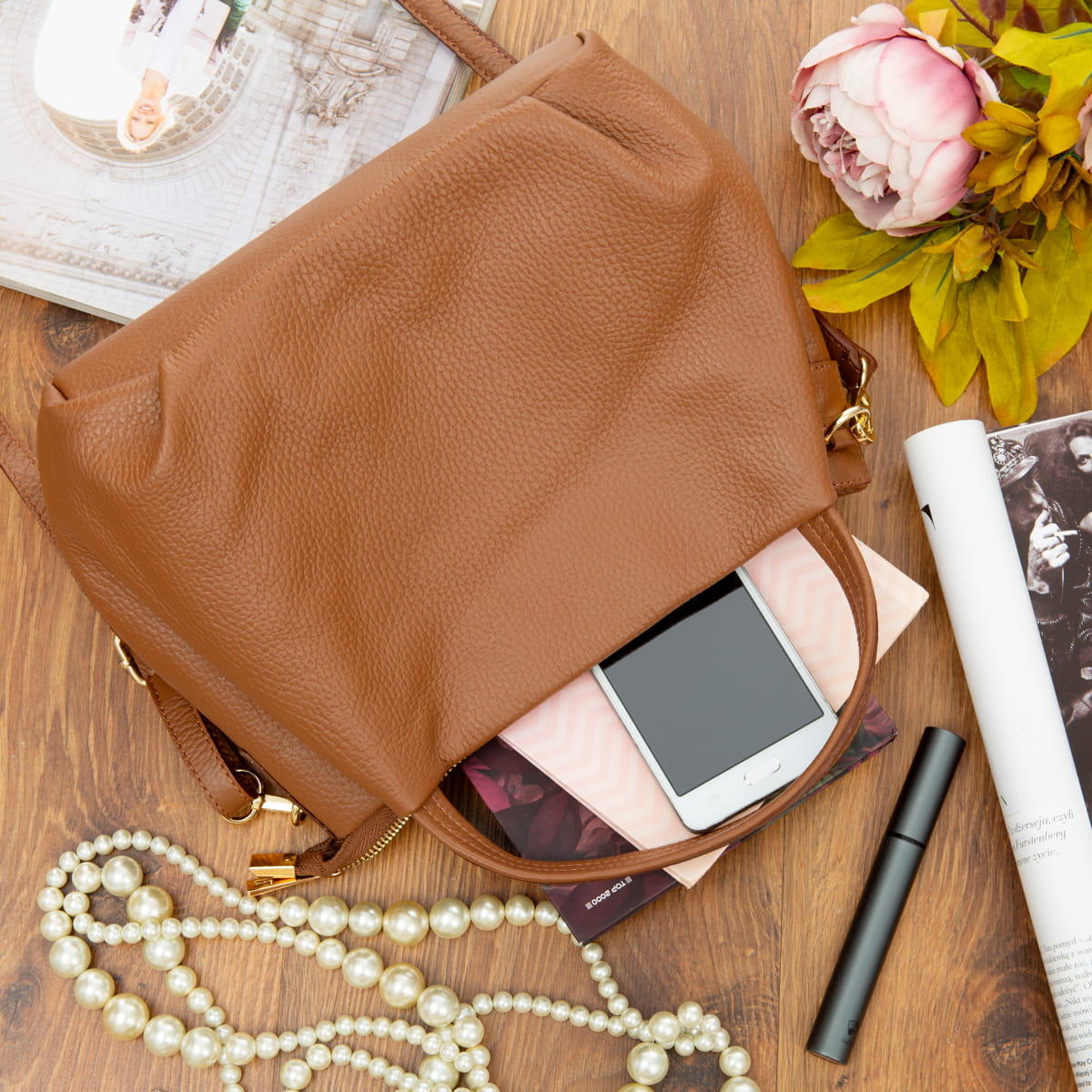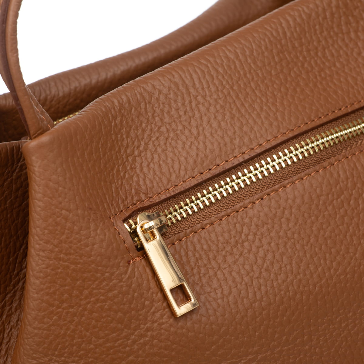 Miejska torebka damska średniej wielkości, wykonana z włoskiej skóry naturalnej. Z tyłu torebki jest kieszonka zamykana na suwak. Para uchwytów i odpinany pasek pozwala nosić torebkę w ręku, na przedramieniu lub na ramieniu.