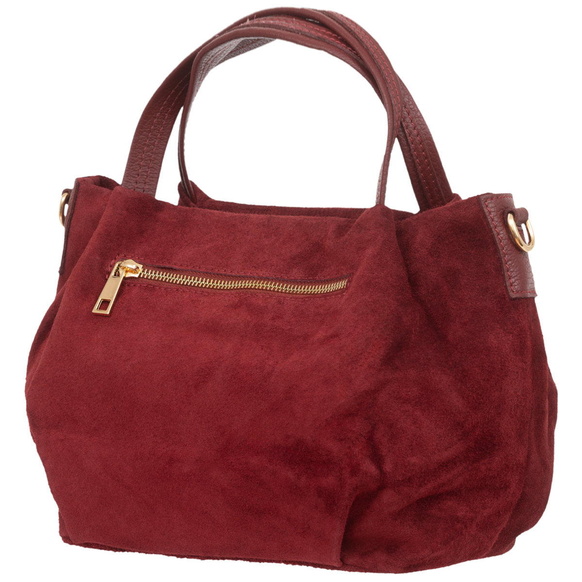 Miejska torebka damska średniej wielkości, wykonana z włoskiej skóry zamszowej. Z tyłu torebki jest kieszonka zamykana na suwak. Para uchwytów i odpinany pasek pozwala nosić torebkę w ręku, na przedramieniu lub na ramieniu.