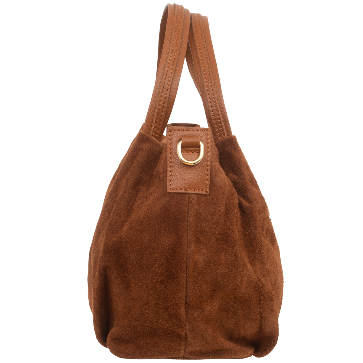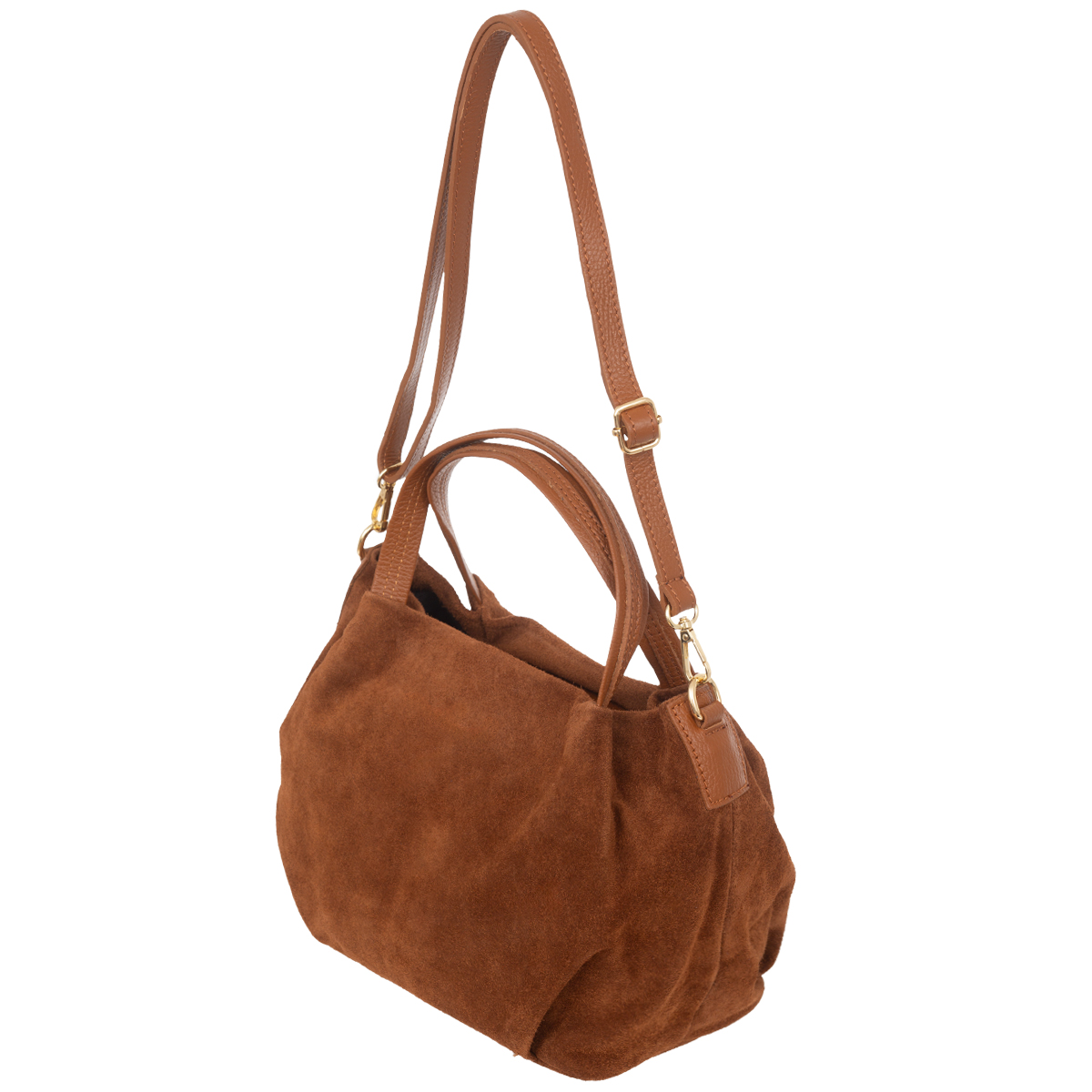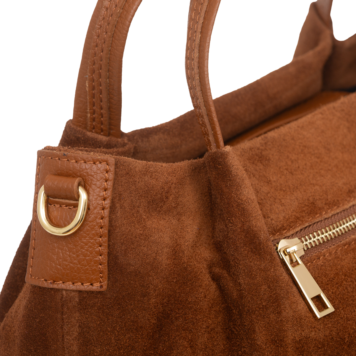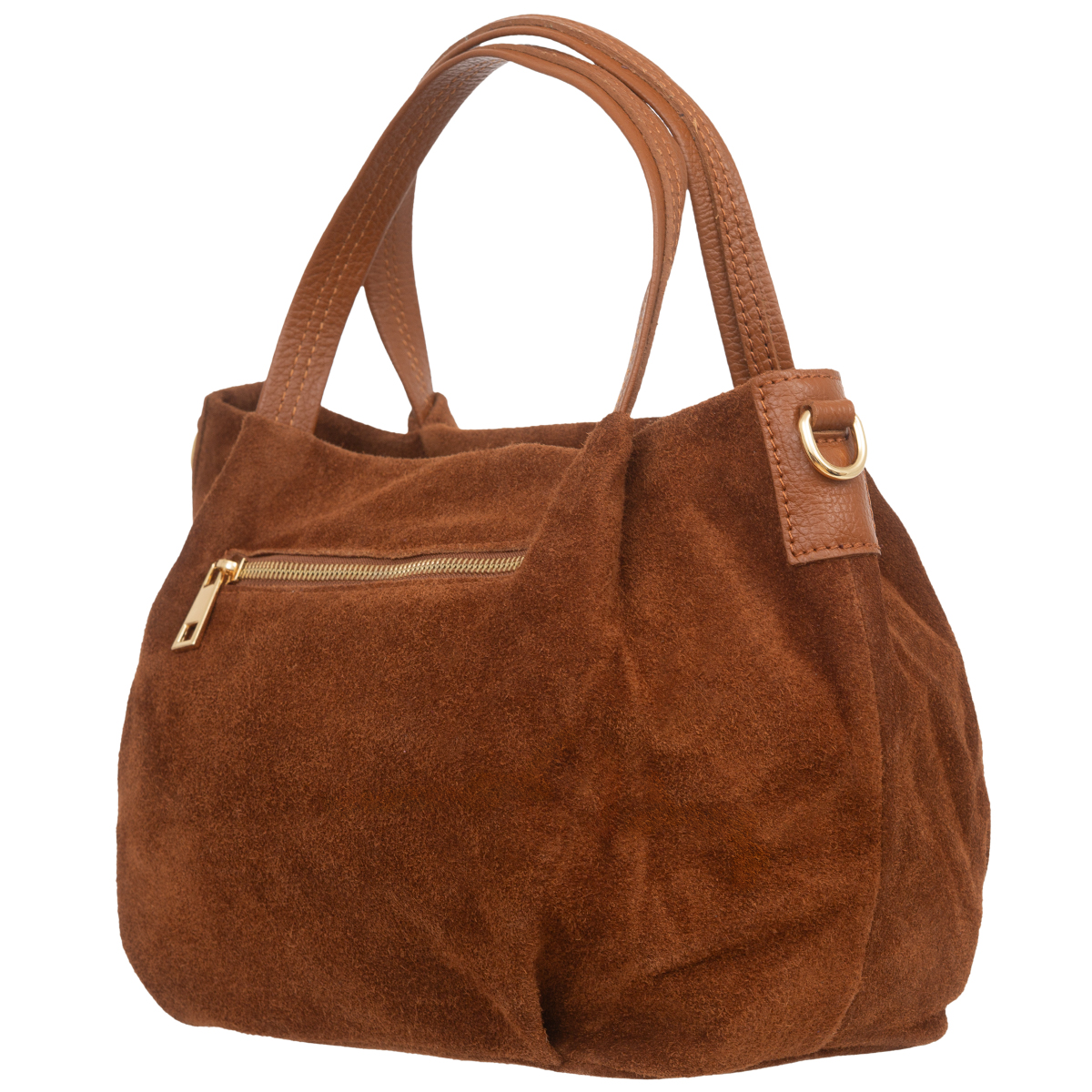 Miejska torebka damska średniej wielkości, wykonana z włoskiej skóry zamszowej. Z tyłu torebki jest kieszonka zamykana na suwak. Para uchwytów i odpinany pasek pozwala nosić torebkę w ręku, na przedramieniu lub na ramieniu.