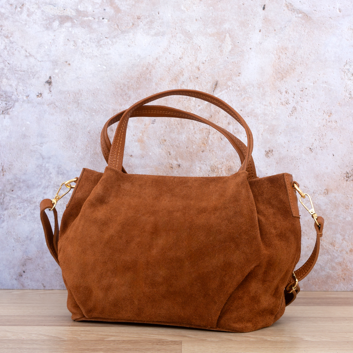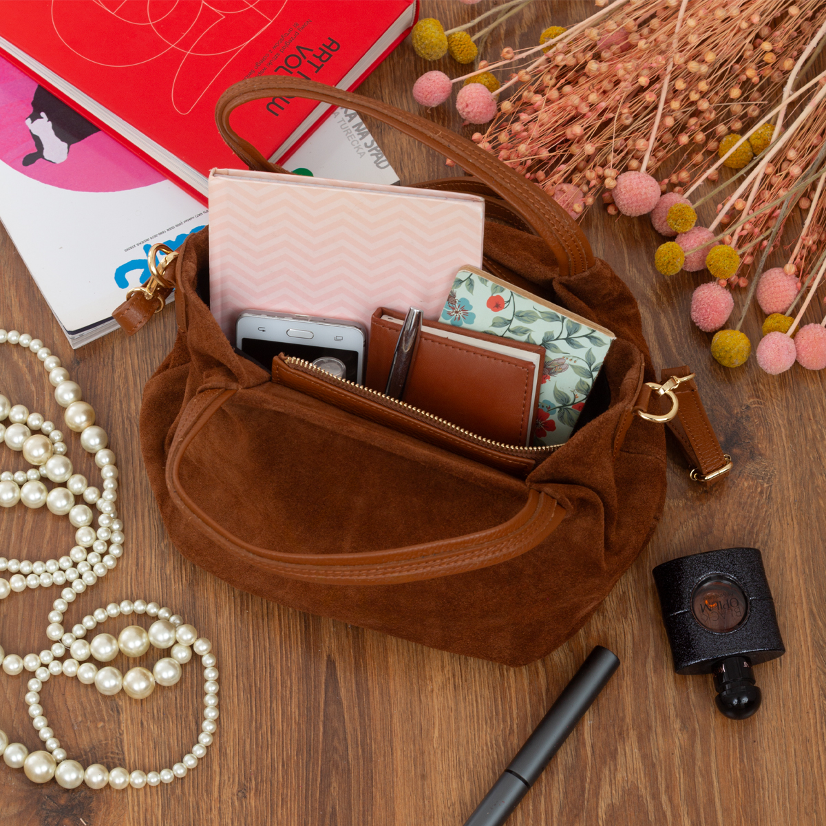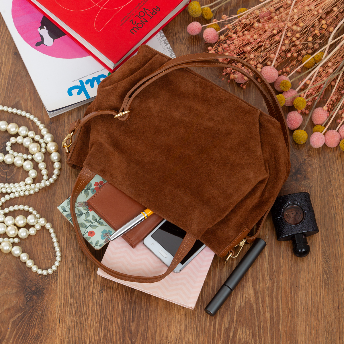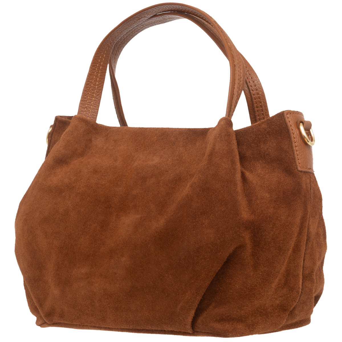 Miejska torebka damska średniej wielkości, wykonana z włoskiej skóry zamszowej. Z tyłu torebki jest kieszonka zamykana na suwak. Para uchwytów i odpinany pasek pozwala nosić torebkę w ręku, na przedramieniu lub na ramieniu.