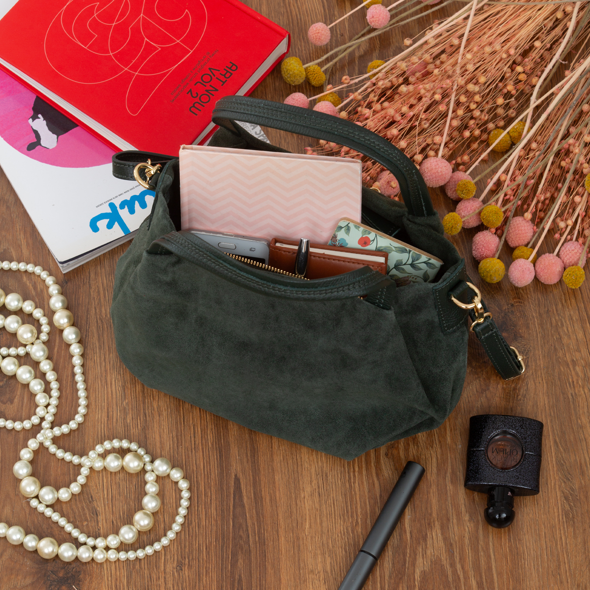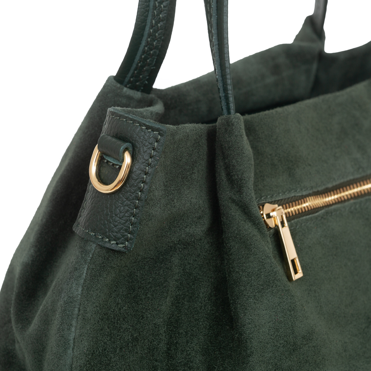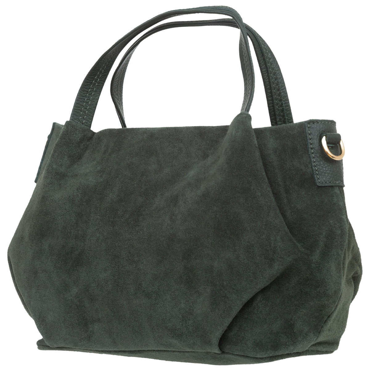 Miejska torebka damska średniej wielkości, wykonana z włoskiej skóry zamszowej. Z tyłu torebki jest kieszonka zamykana na suwak. Para uchwytów i odpinany pasek pozwala nosić torebkę w ręku, na przedramieniu lub na ramieniu.