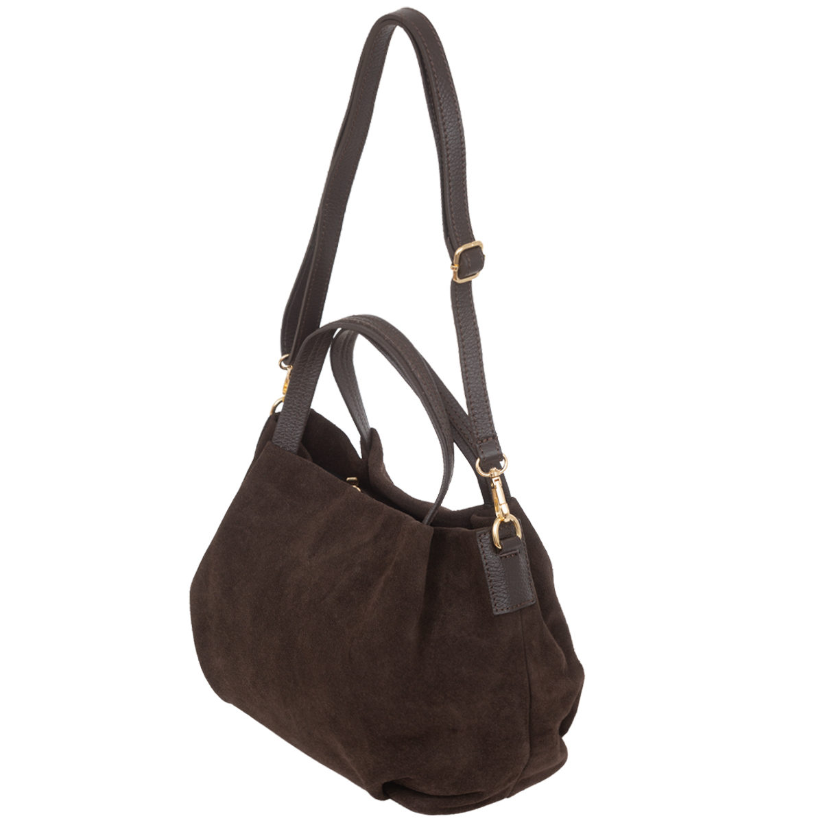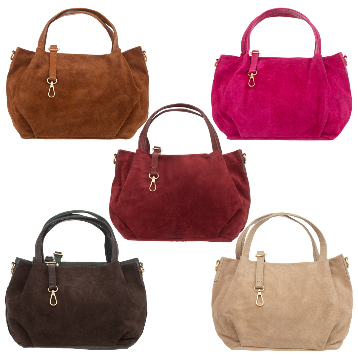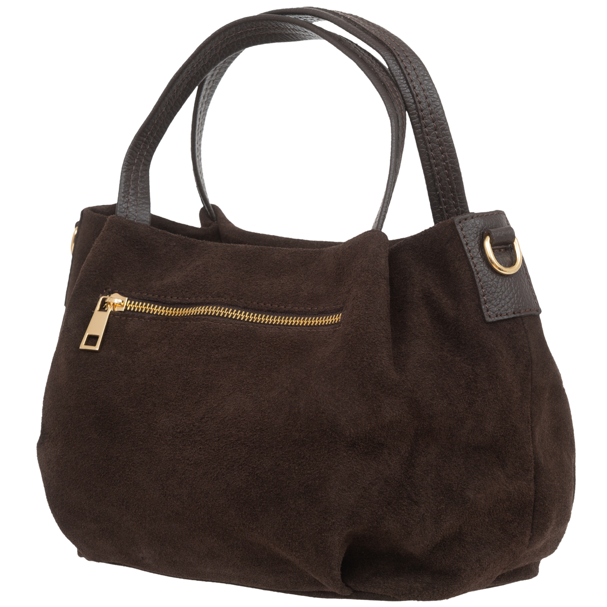 Miejska torebka damska średniej wielkości, wykonana z włoskiej skóry zamszowej. Z tyłu torebki jest kieszonka zamykana na suwak. Para uchwytów i odpinany pasek pozwala nosić torebkę w ręku, na przedramieniu lub na ramieniu.
