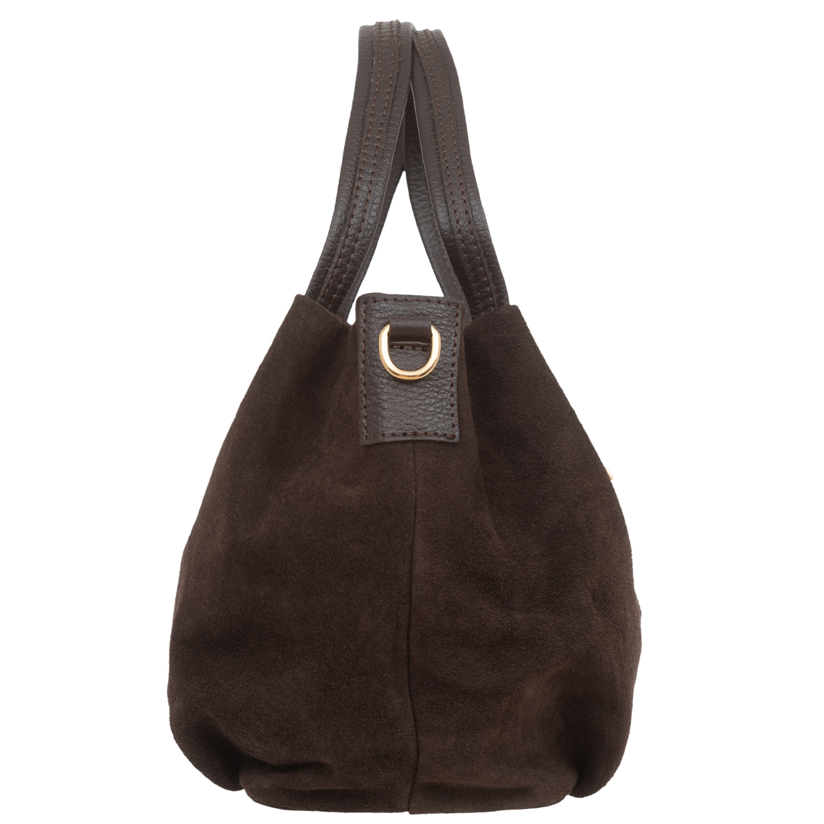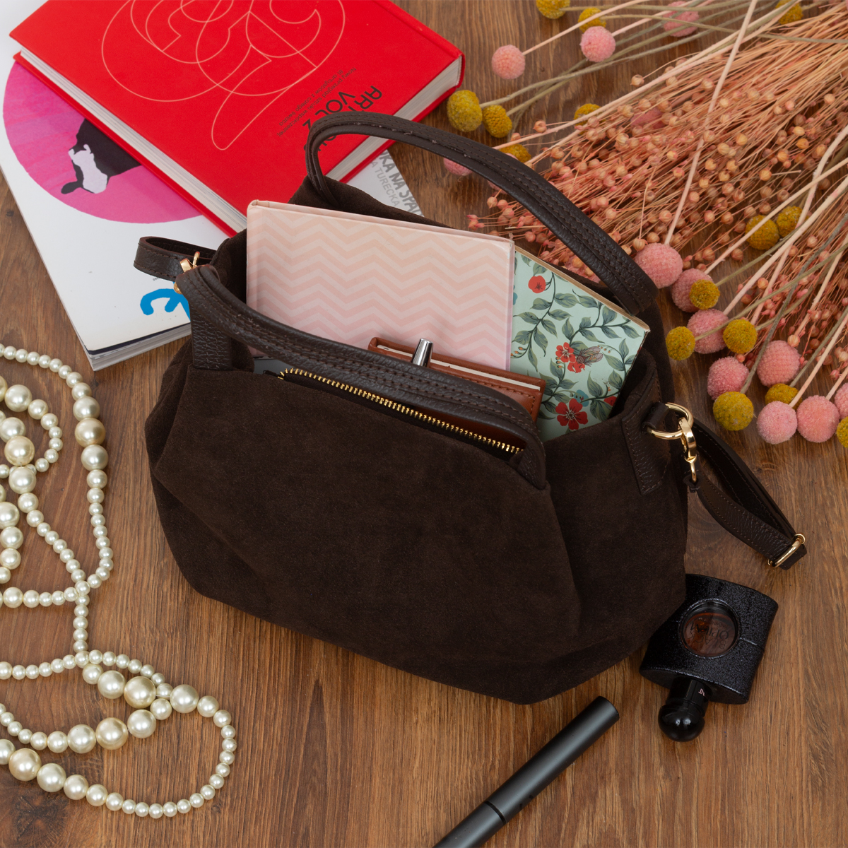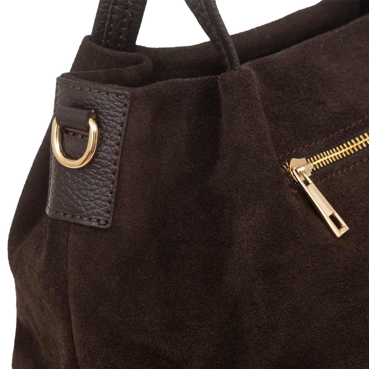 Miejska torebka damska średniej wielkości, wykonana z włoskiej skóry zamszowej. Z tyłu torebki jest kieszonka zamykana na suwak. Para uchwytów i odpinany pasek pozwala nosić torebkę w ręku, na przedramieniu lub na ramieniu.