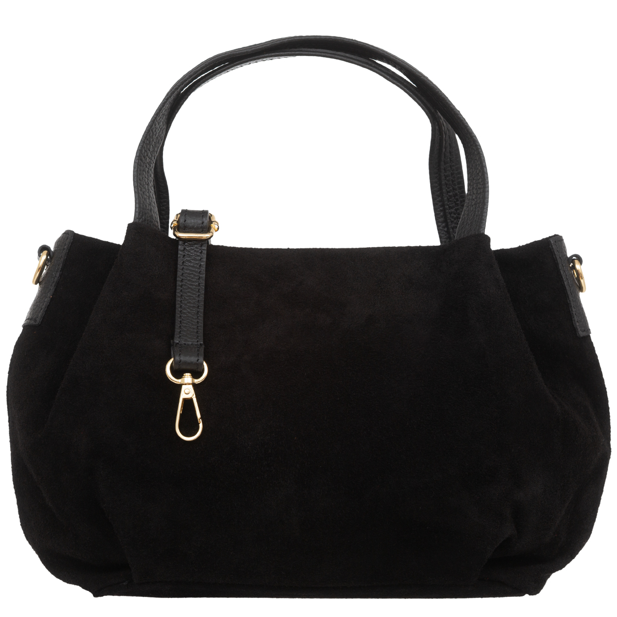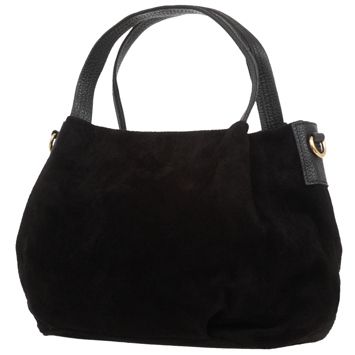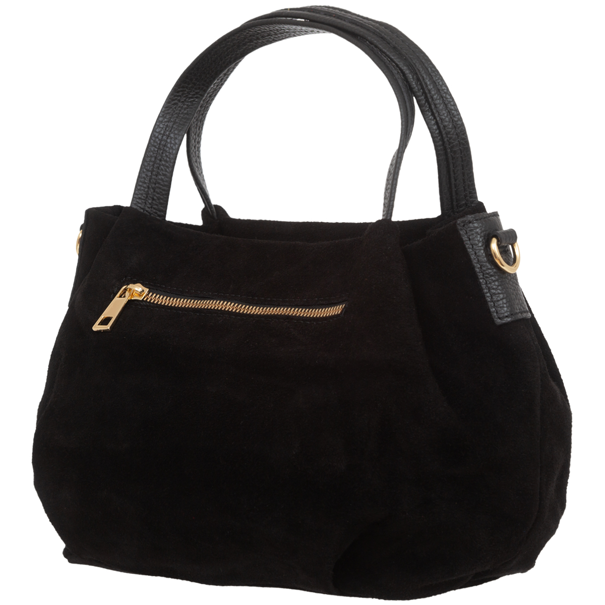 Miejska torebka damska średniej wielkości, wykonana z włoskiej skóry zamszowej. Z tyłu torebki jest kieszonka zamykana na suwak. Para uchwytów i odpinany pasek pozwala nosić torebkę w ręku, na przedramieniu lub na ramieniu.