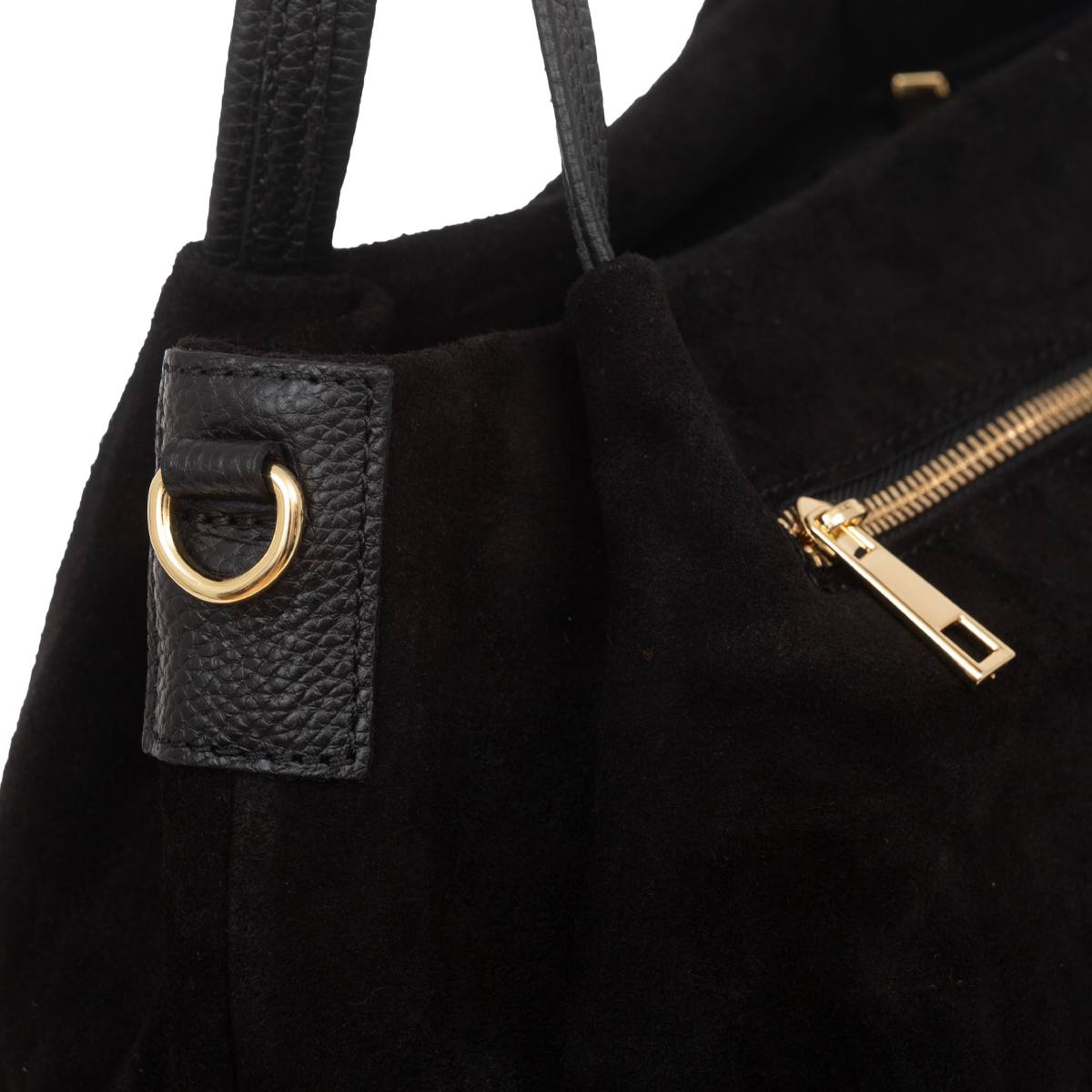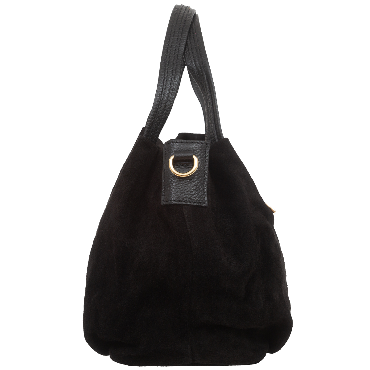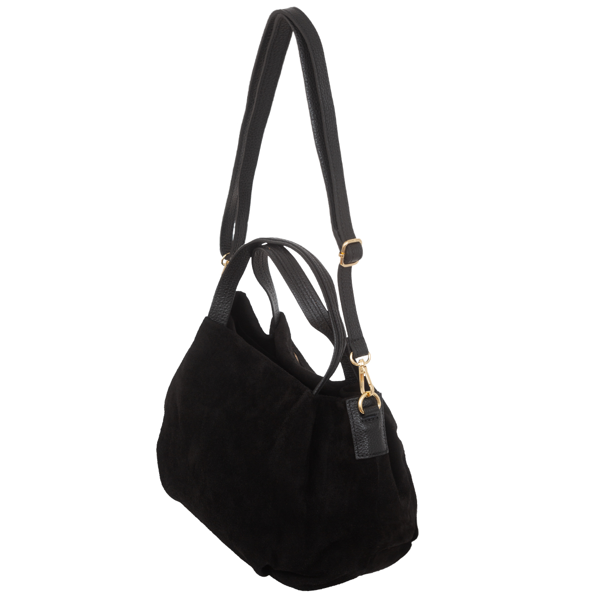 Miejska torebka damska średniej wielkości, wykonana z włoskiej skóry zamszowej. Z tyłu torebki jest kieszonka zamykana na suwak. Para uchwytów i odpinany pasek pozwala nosić torebkę w ręku, na przedramieniu lub na ramieniu.