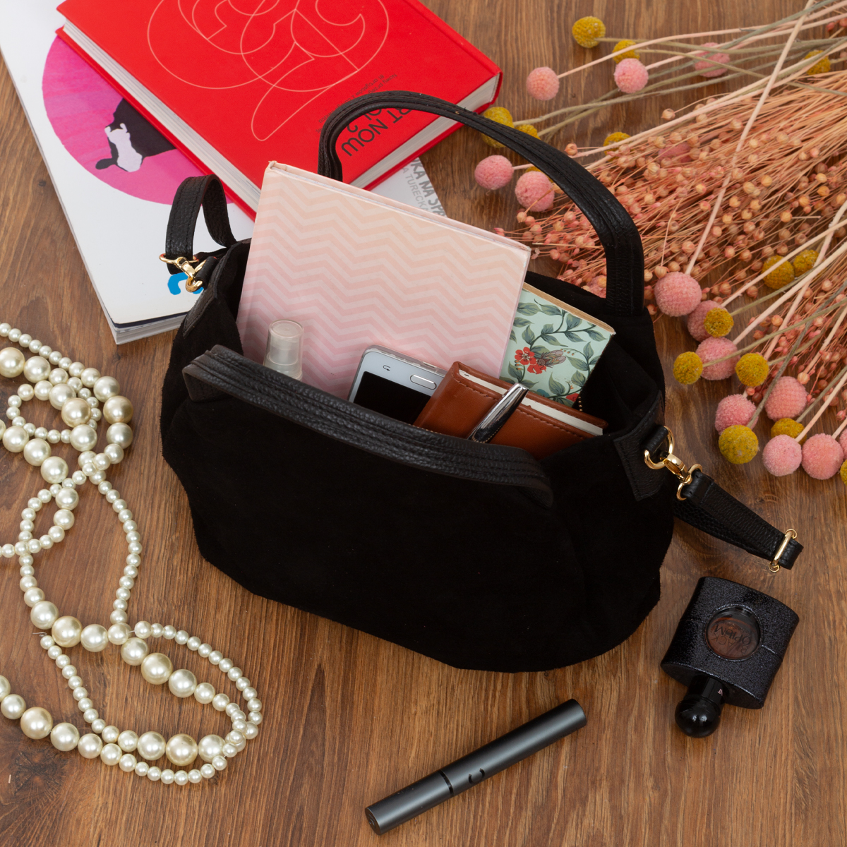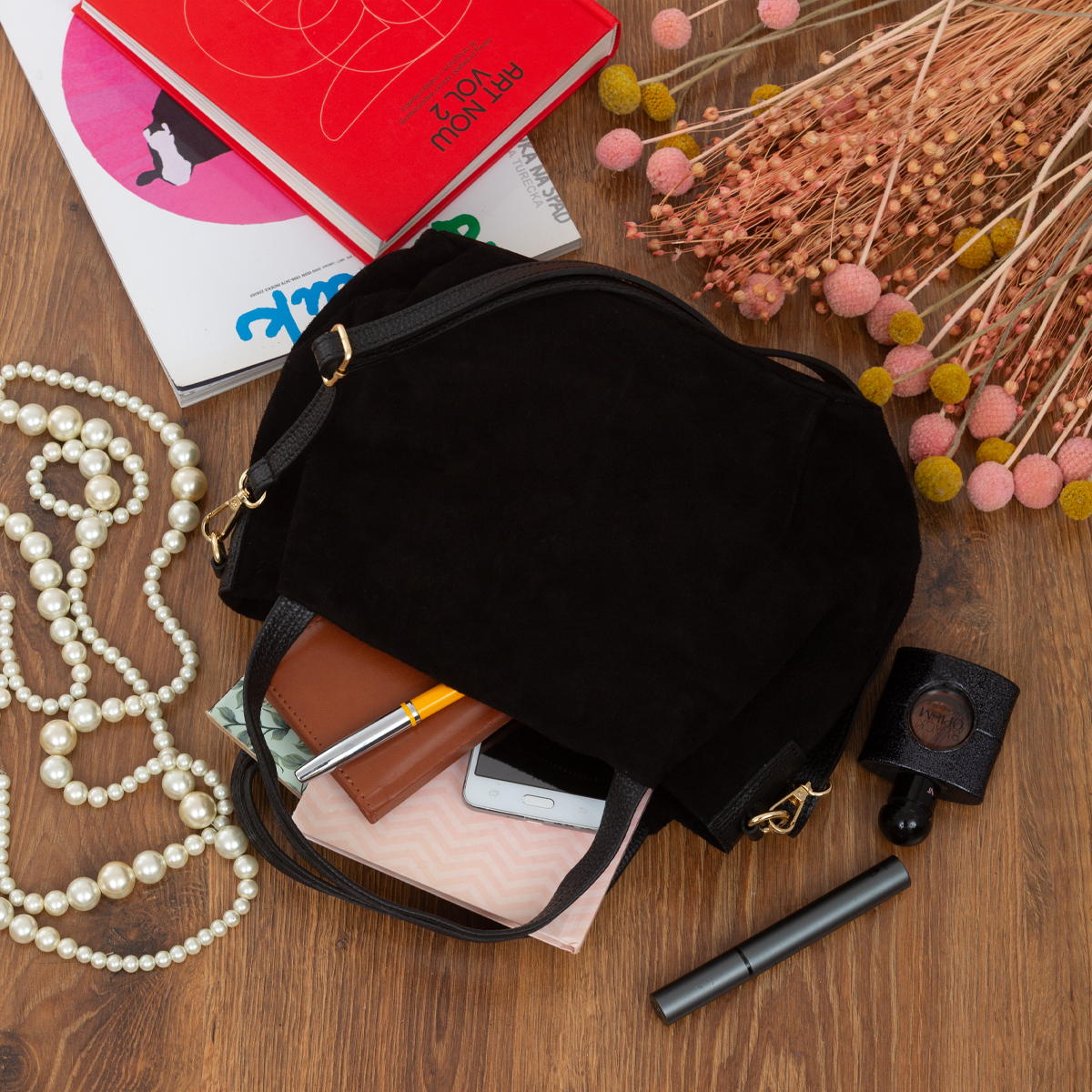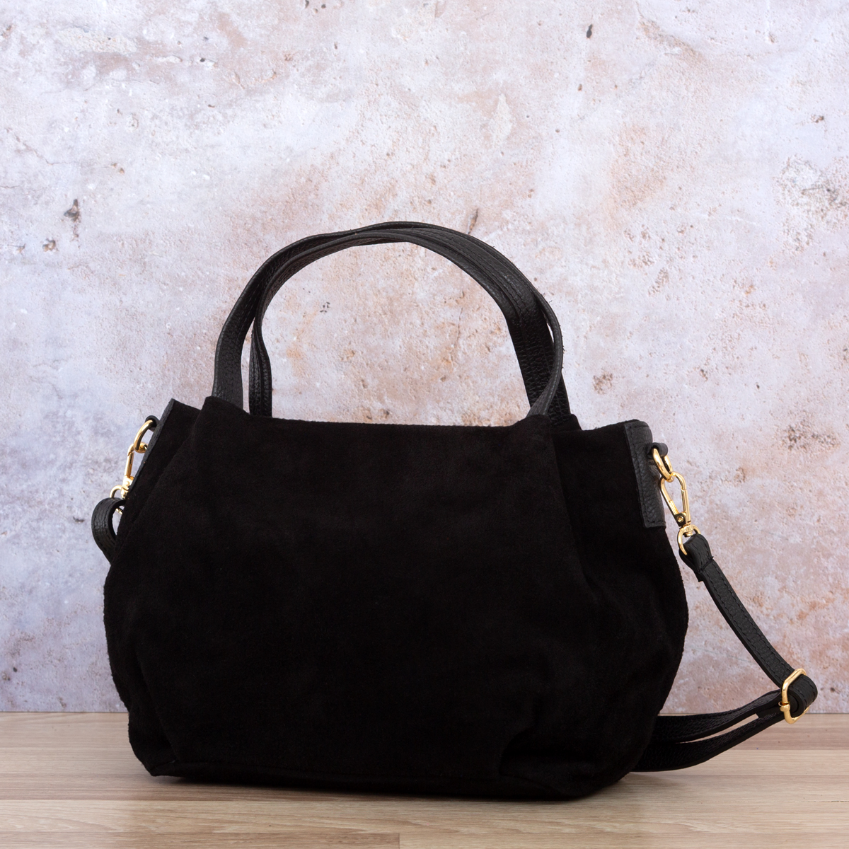 Torebka Damska Na Ramię Zamszowa Vera Pelle Bolsa Czarna