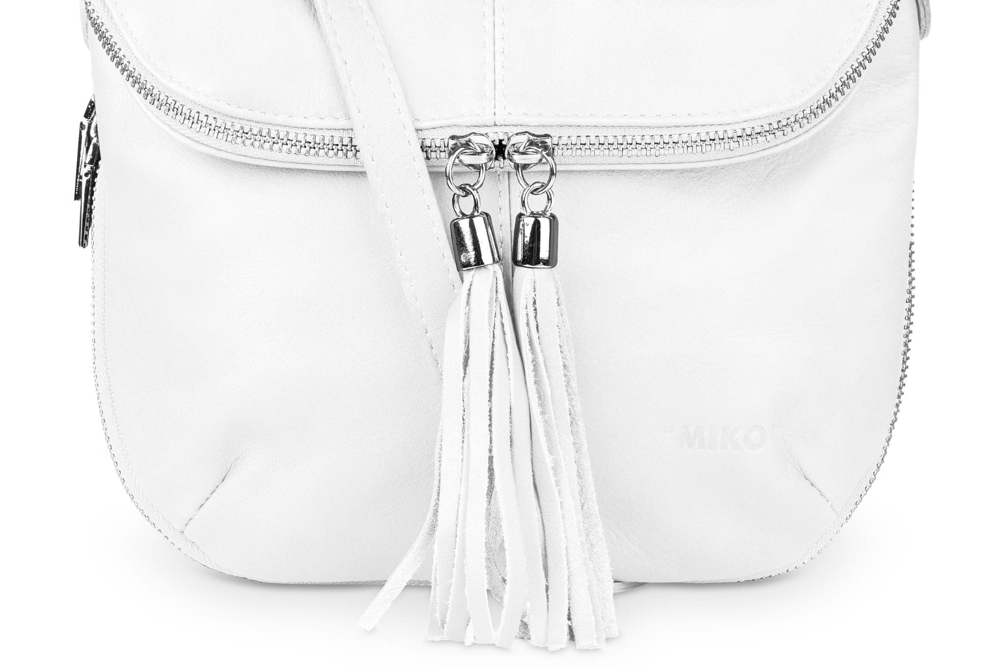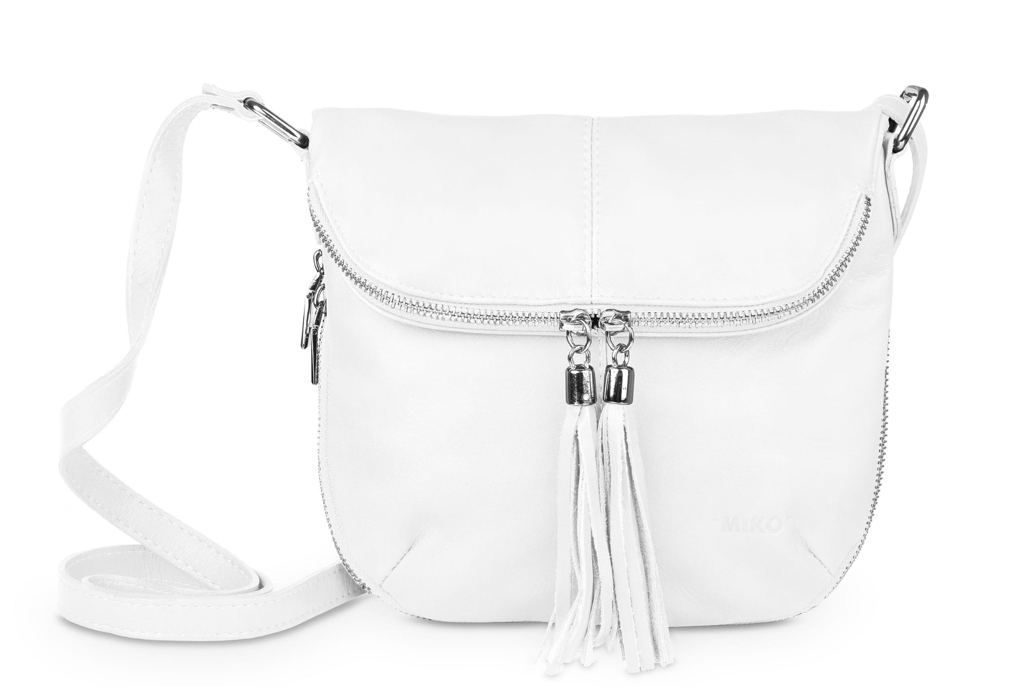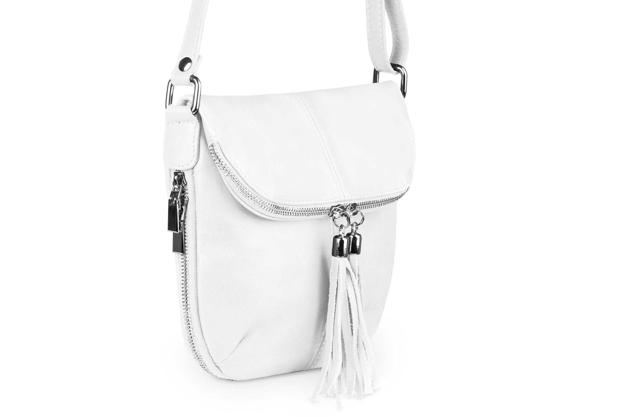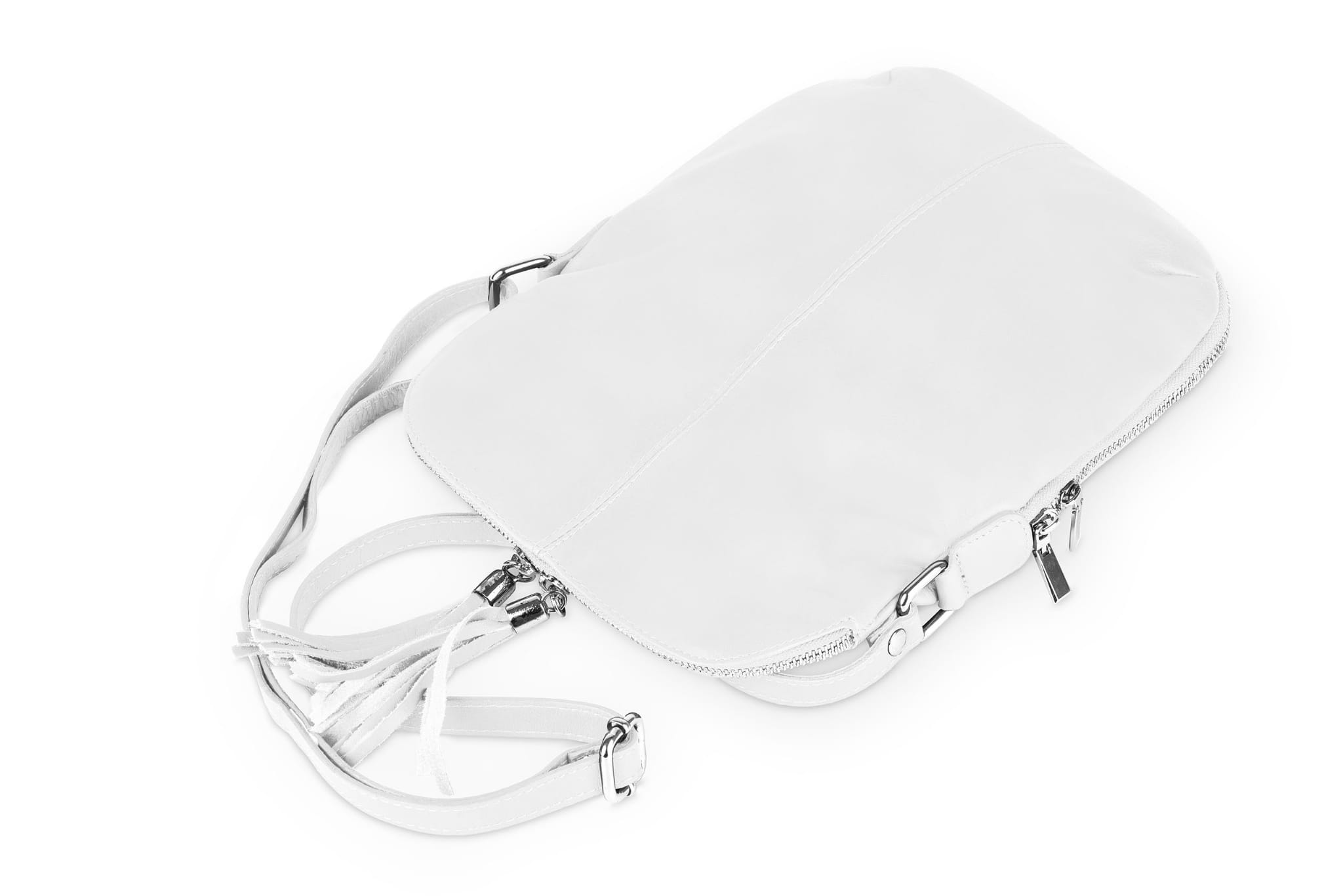 Damska listonoszka uszyta z naturalnej, włoskiej skóry licowej. Lekka i zgrabna torebka z ozdobnym suwakiem i frędzlami.