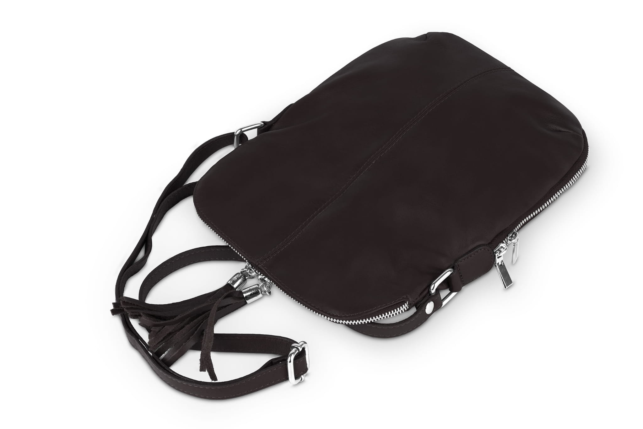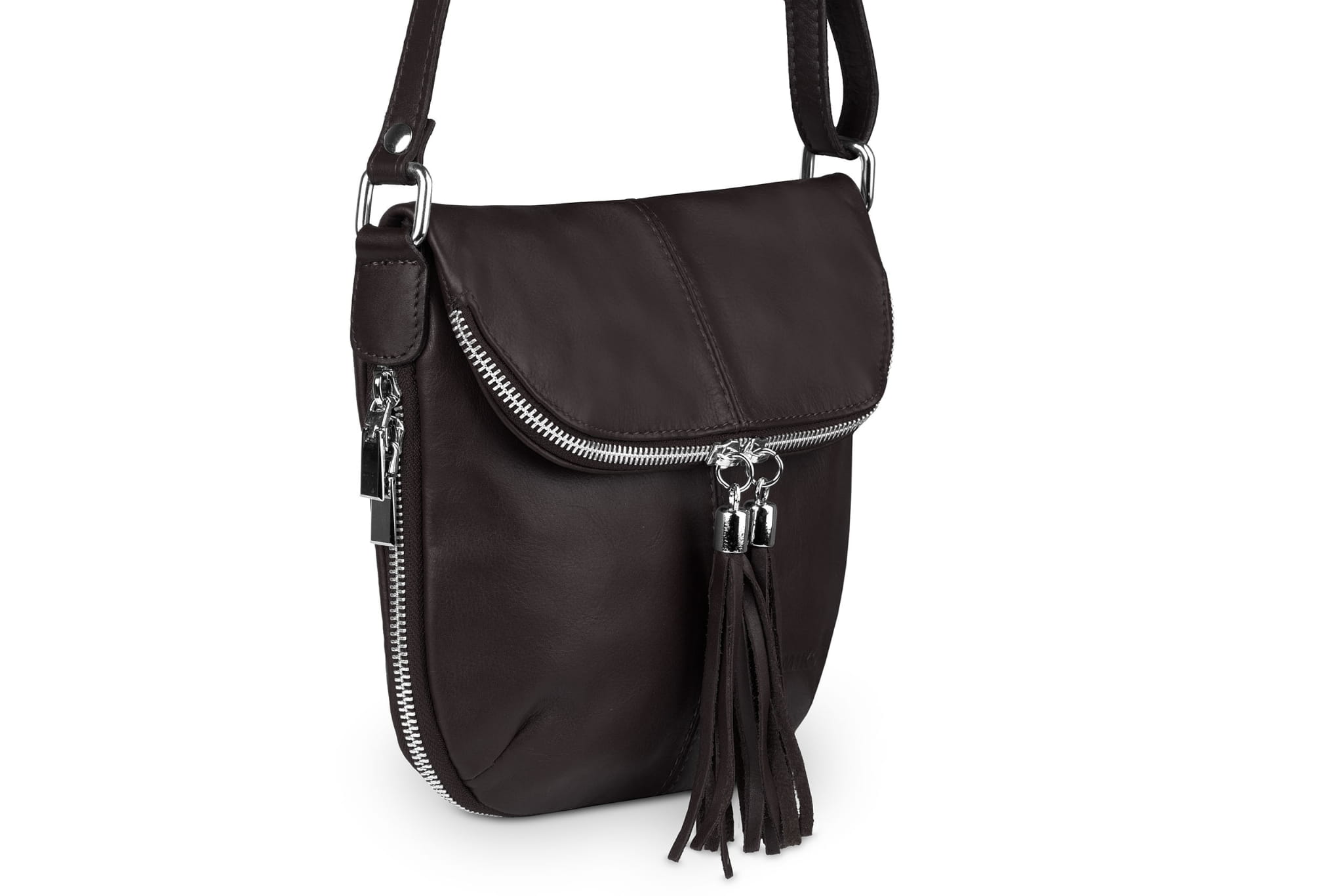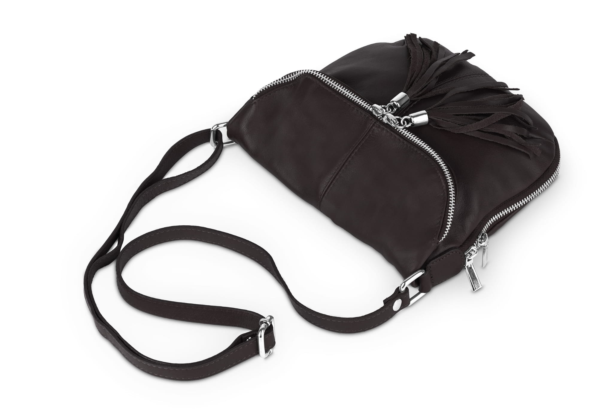 Damska listonoszka uszyta z naturalnej, włoskiej skóry licowej. Lekka i zgrabna torebka z ozdobnym suwakiem i frędzlami.