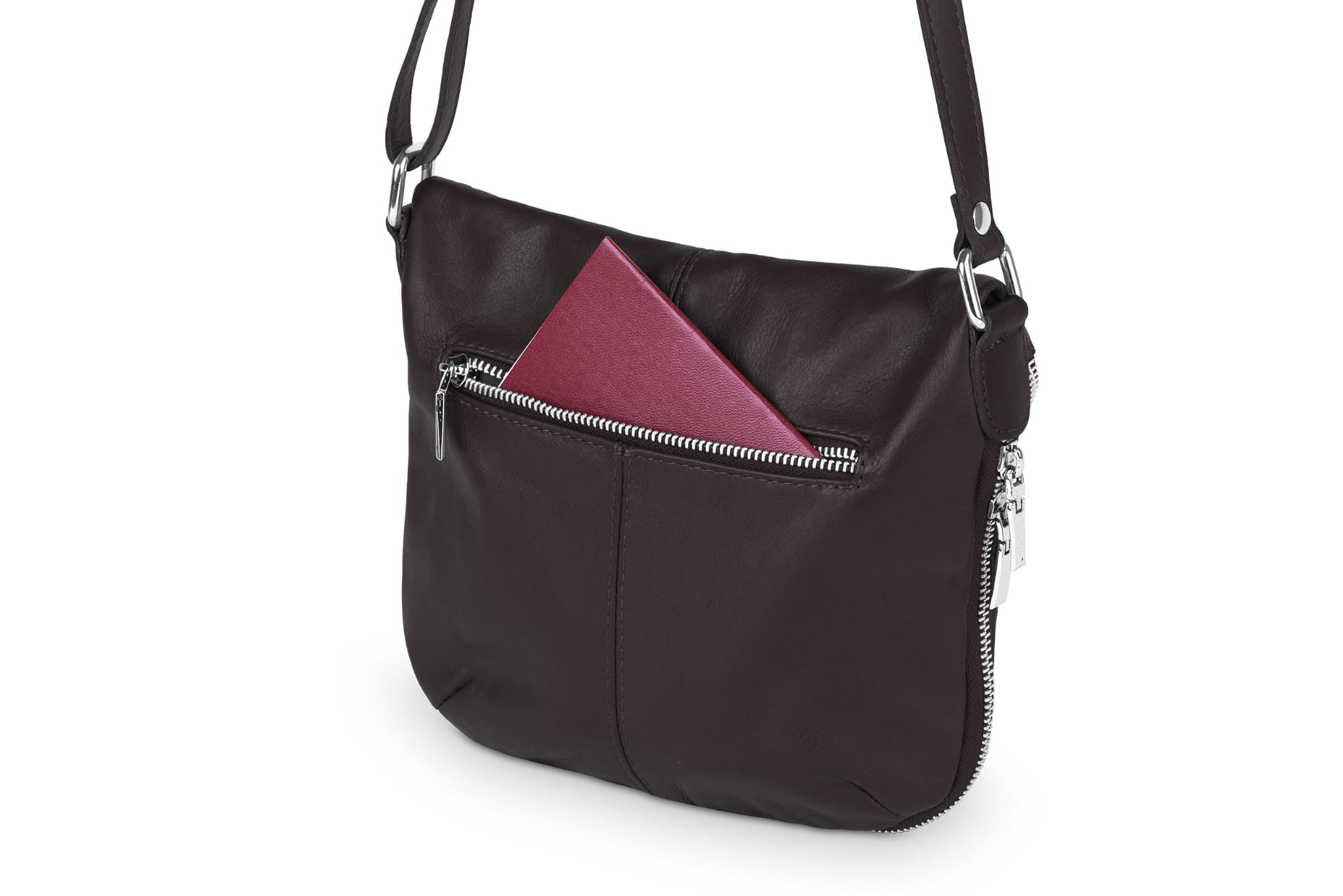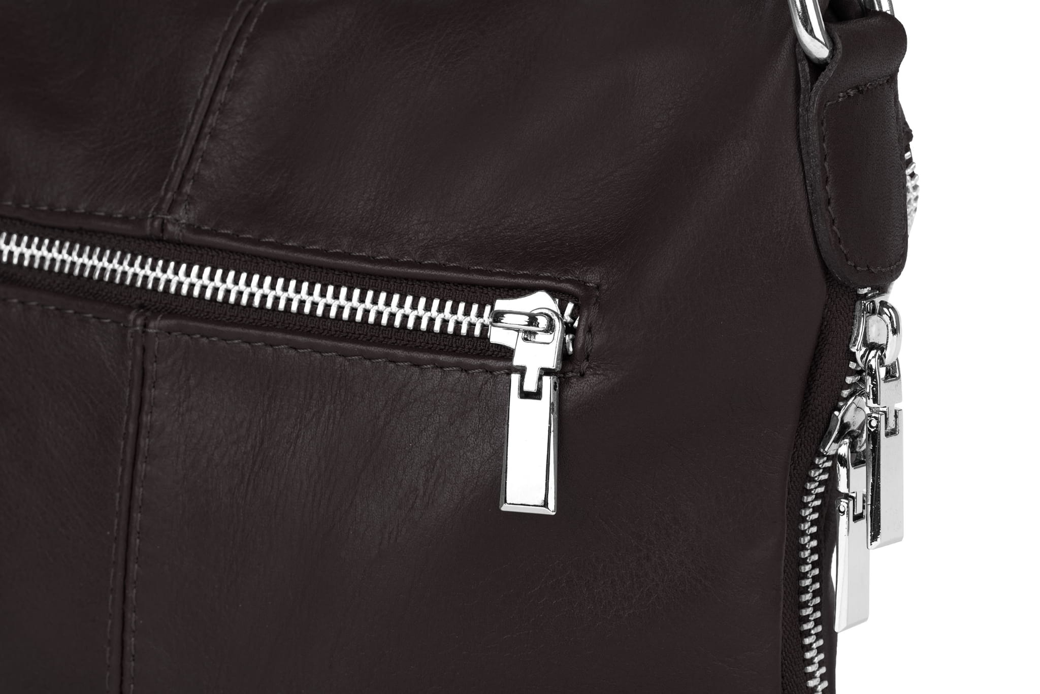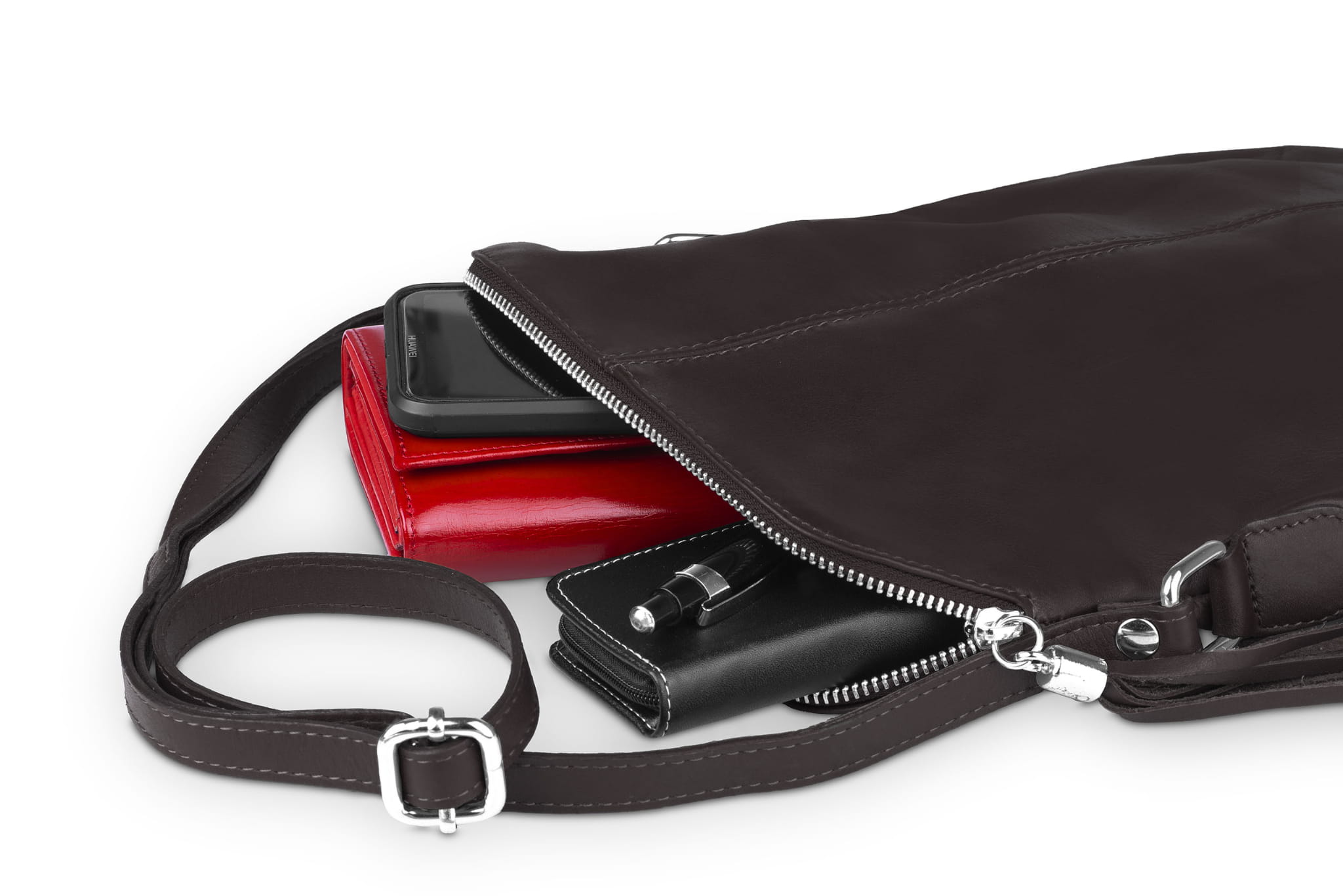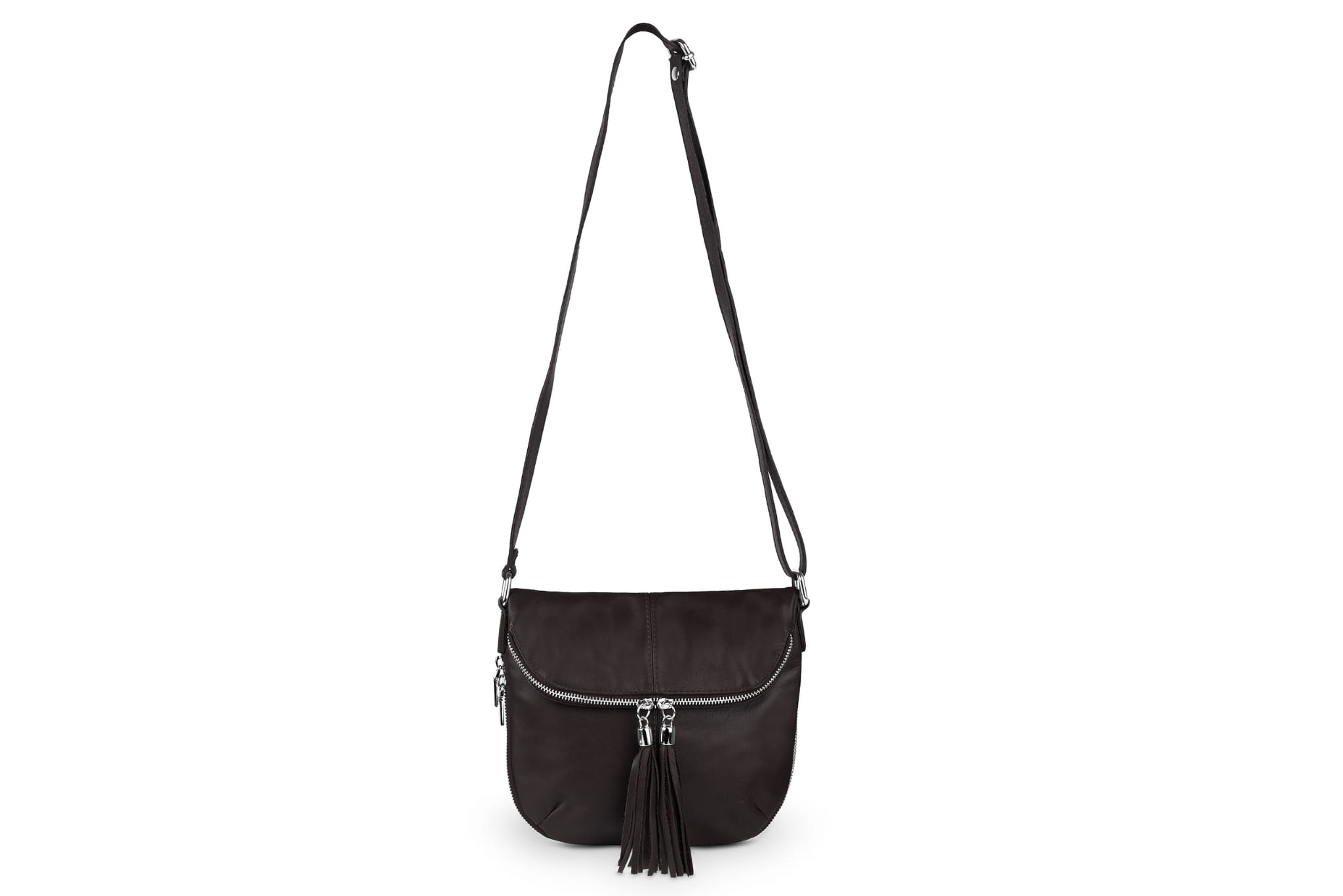 Damska listonoszka uszyta z naturalnej, włoskiej skóry licowej. Lekka i zgrabna torebka z ozdobnym suwakiem i frędzlami.