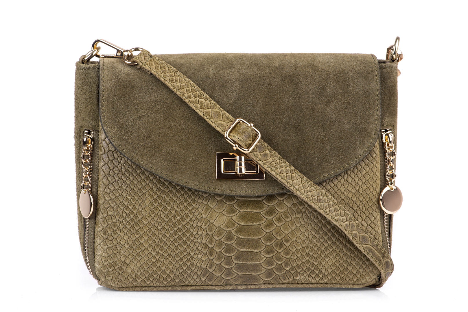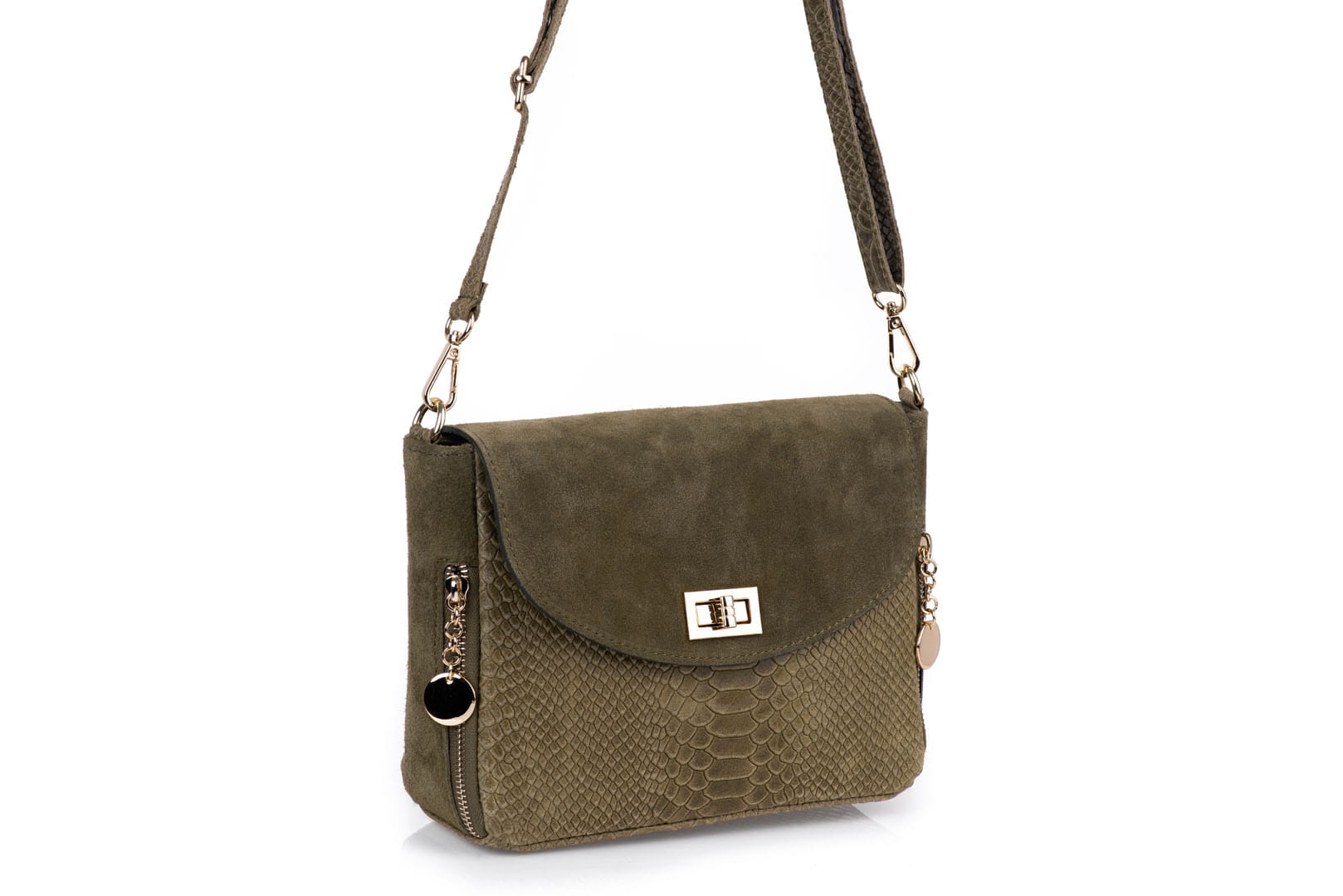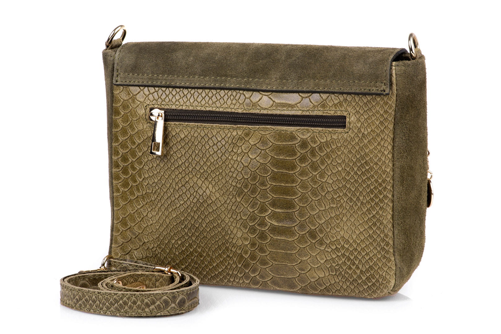 Torebka damska wykonana z wysokogatunkowego włoskiego zamszu naturalnego. Egzotyczny charakter torebki nadaje jej faktura wężowych łusek.