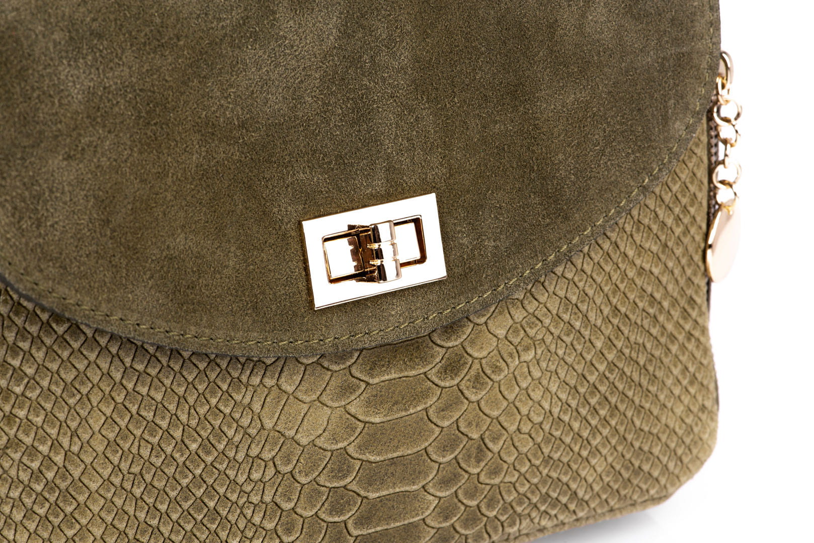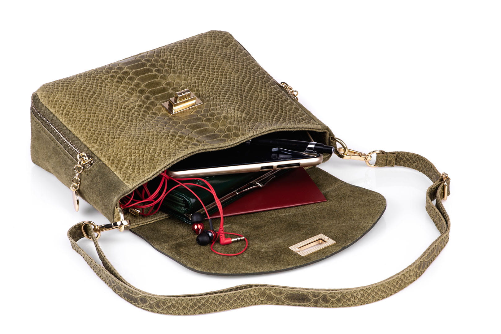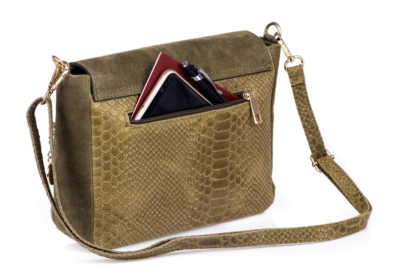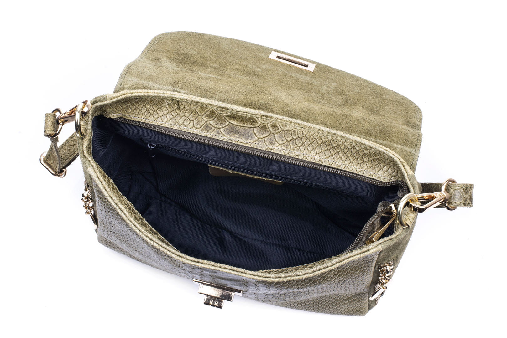 Torebka damska wykonana z wysokogatunkowego włoskiego zamszu naturalnego. Egzotyczny charakter torebki nadaje jej faktura wężowych łusek.