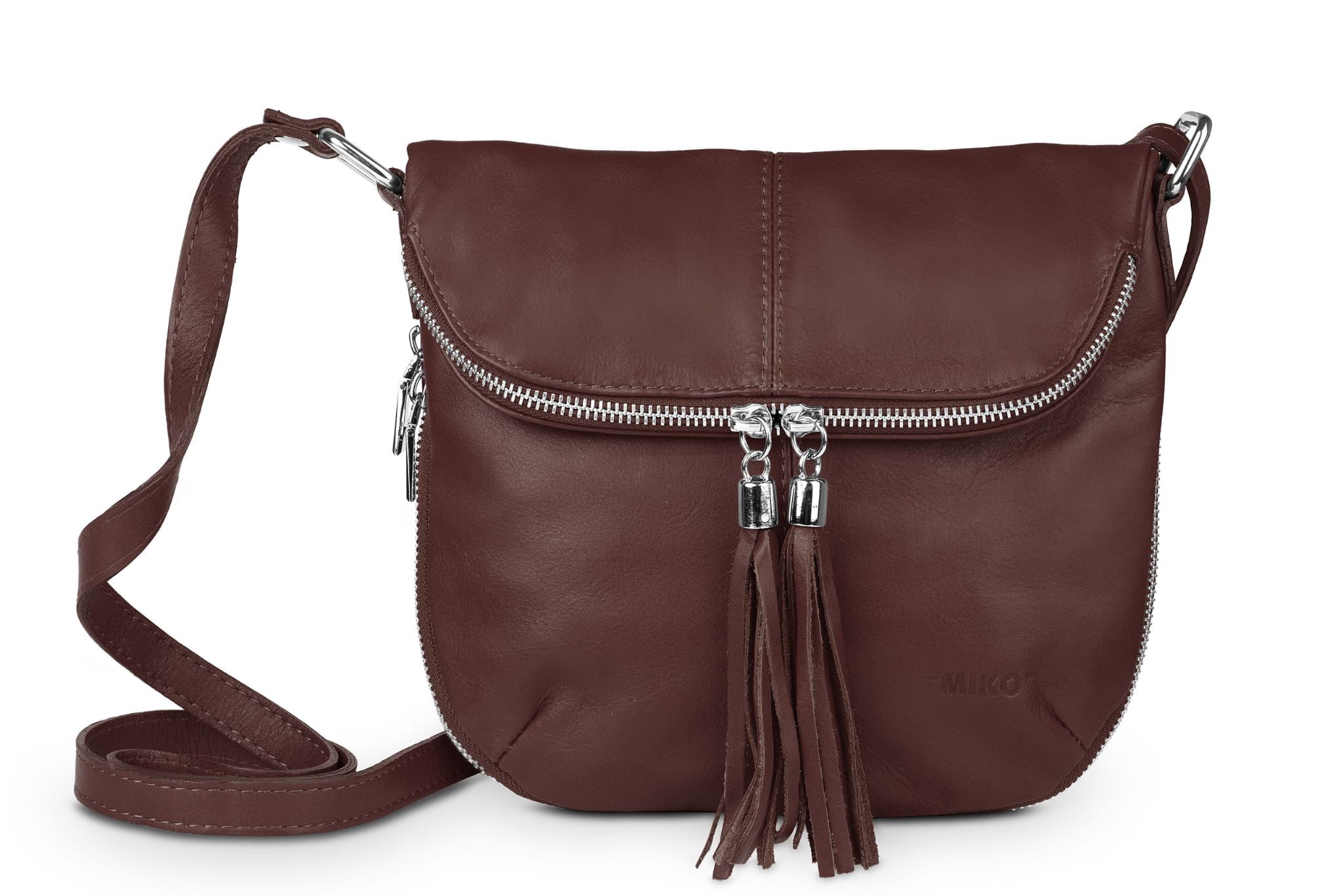 Damska listonoszka uszyta z naturalnej, włoskiej skóry licowej. Lekka i zgrabna torebka z ozdobnym suwakiem i frędzlami.
