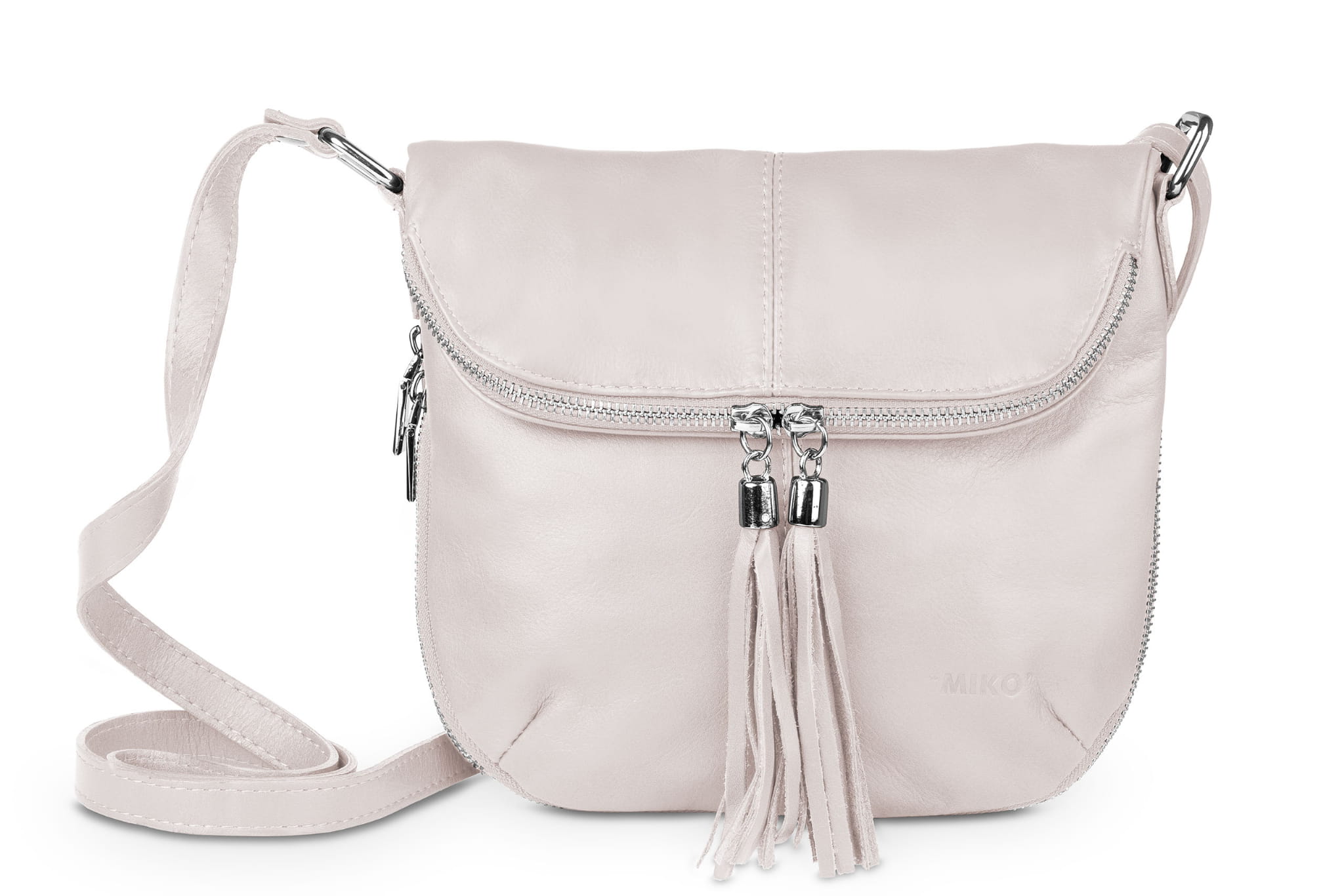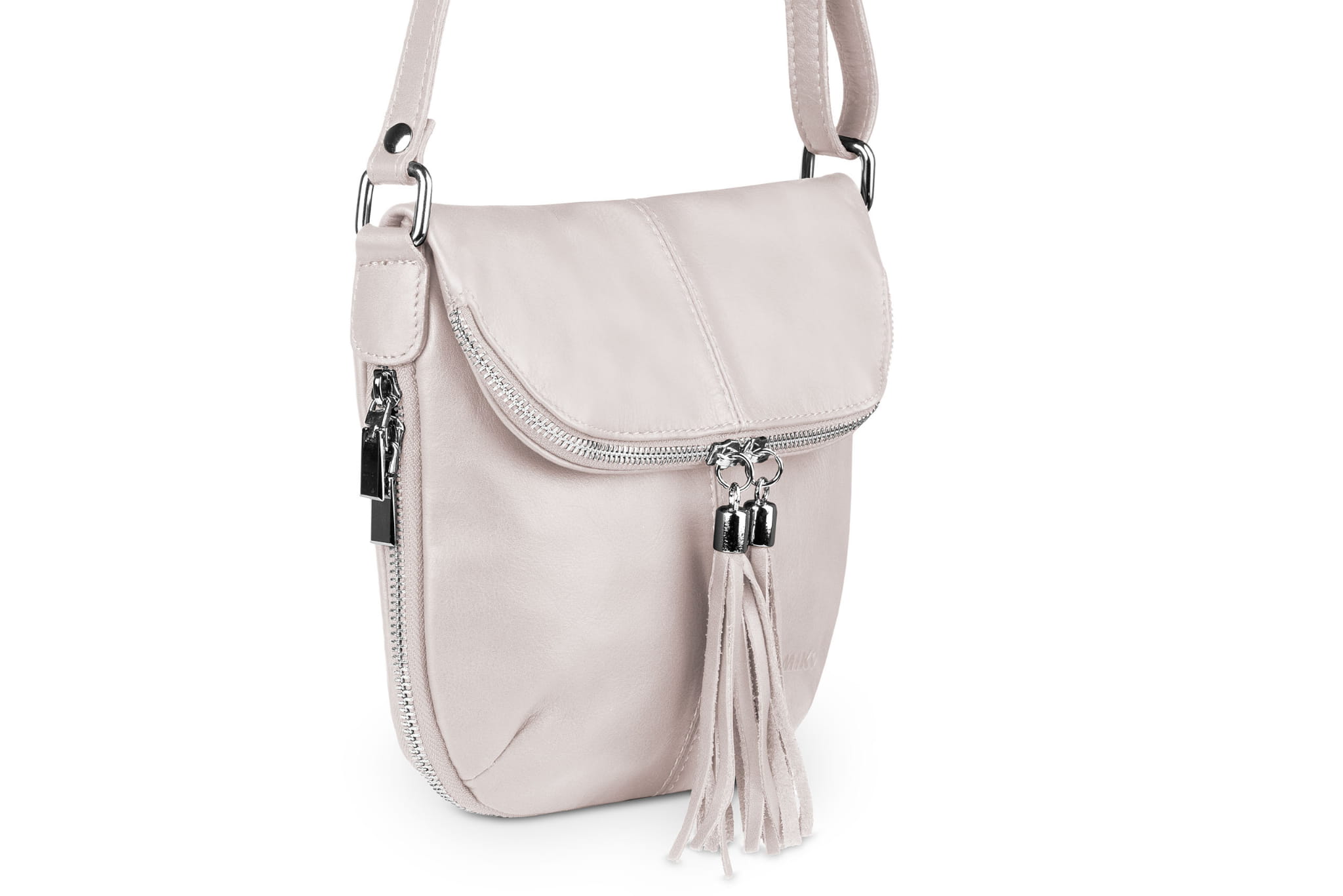 Damska listonoszka uszyta z naturalnej, włoskiej skóry licowej. Lekka i zgrabna torebka z ozdobnym suwakiem i frędzlami.