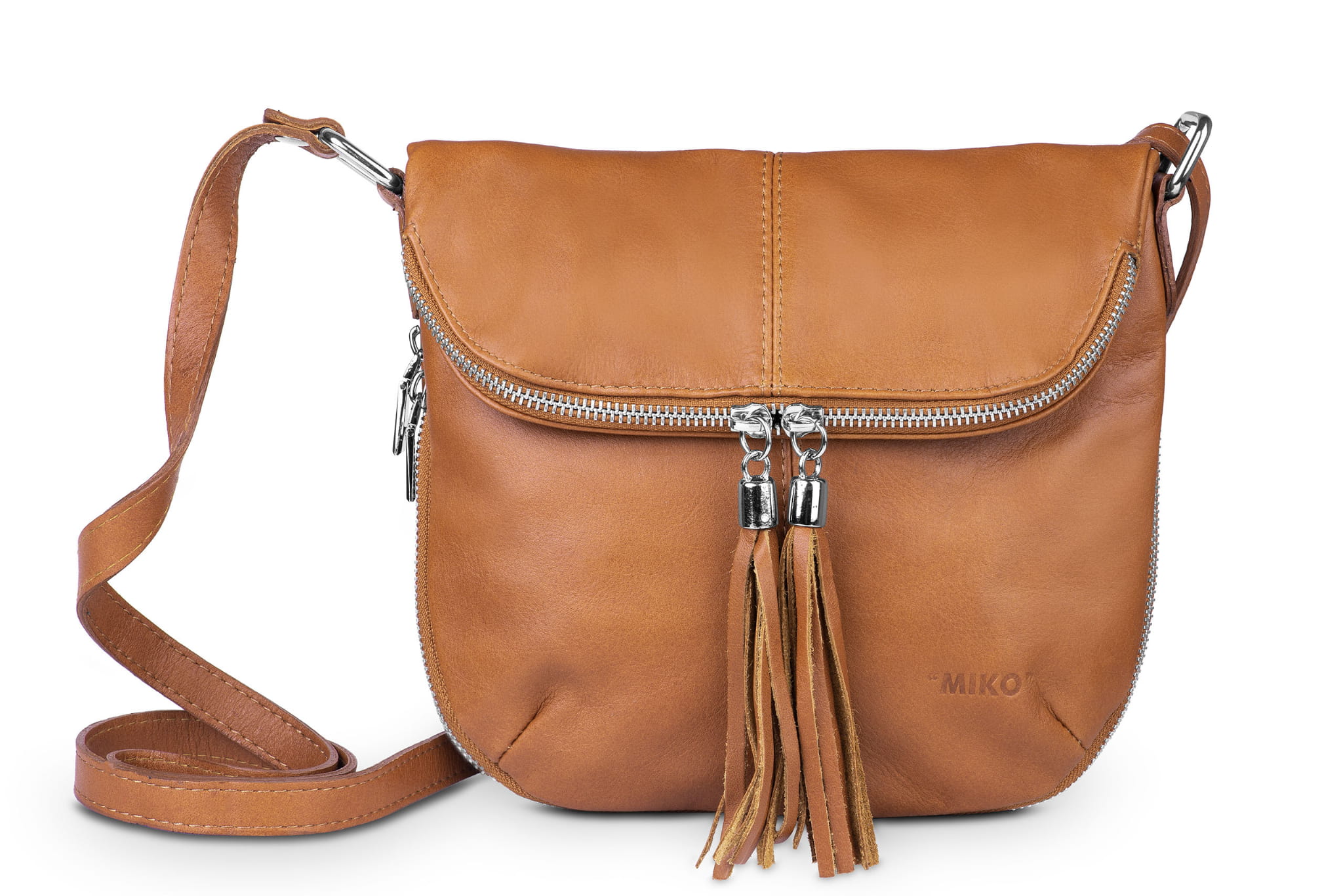 Damska listonoszka uszyta z naturalnej, włoskiej skóry licowej. Lekka i zgrabna torebka z ozdobnym suwakiem i frędzlami.