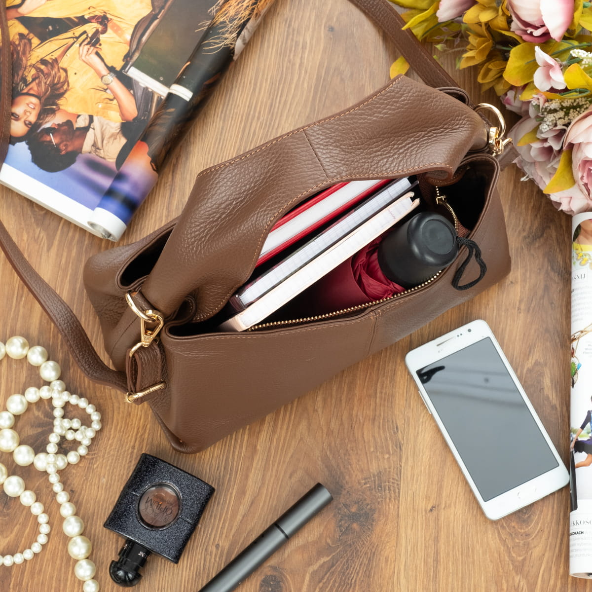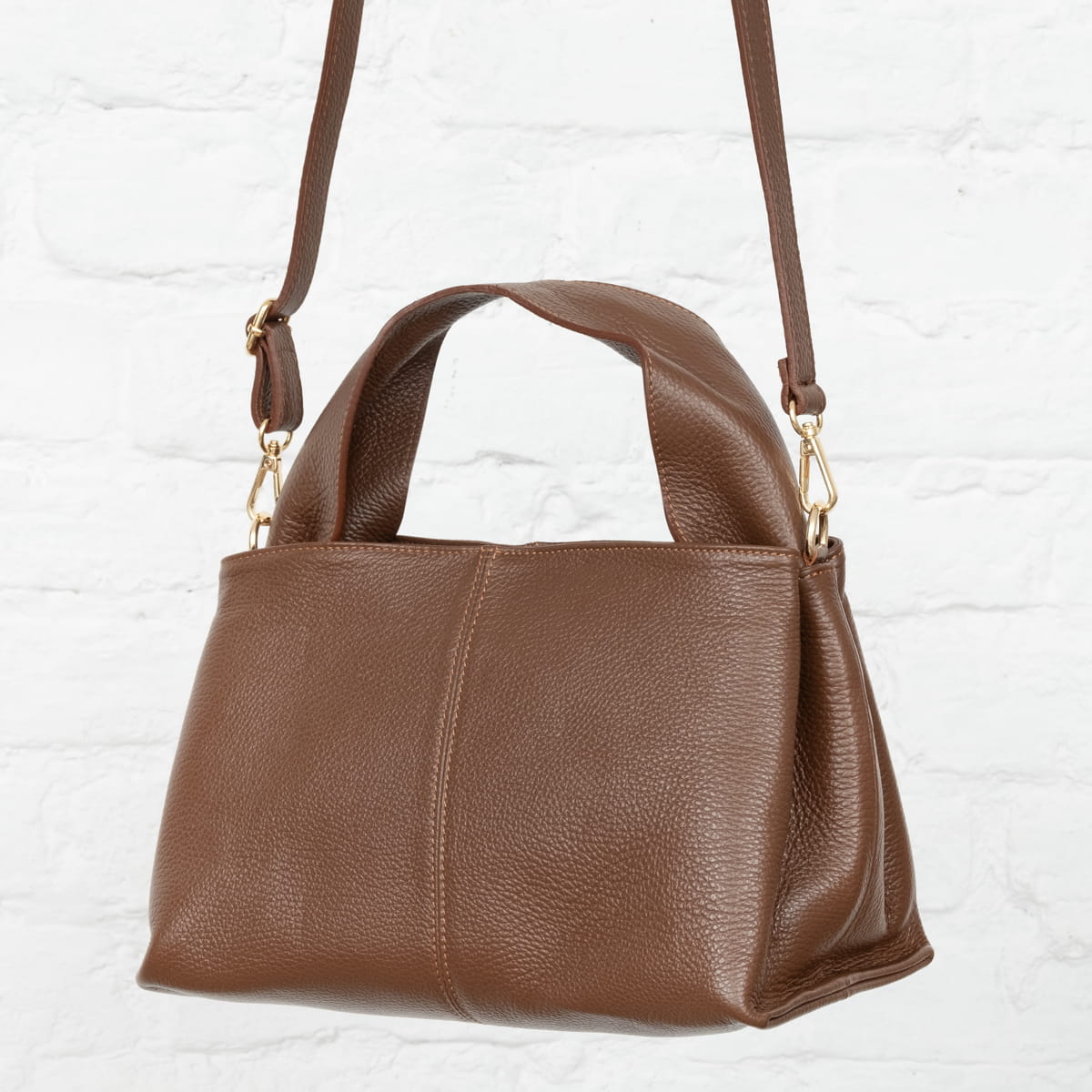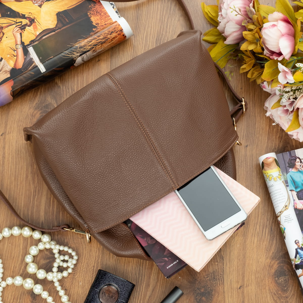 Torba damska wykonana z wysokogatunkowej naturalnej włoskiej skóry licowej. Z wygodnym skórzanym uchwytem. Przystosowana do noszenia w ręku i na ramieniu.