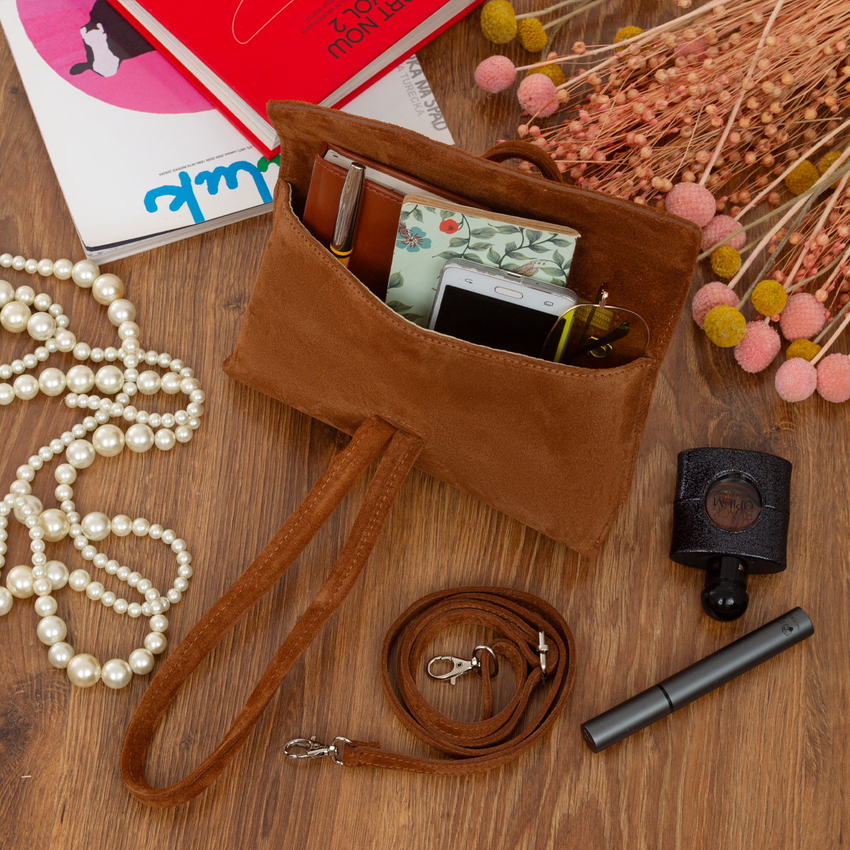 Torebka wykonana z wysokogatunkowej, włoskiej skóry zamszowej. Drobna i lekka torebka wieczorowa jest atrakcyjnym dodatkiem do każdej eleganckiej bądź zwykłej kreacji.