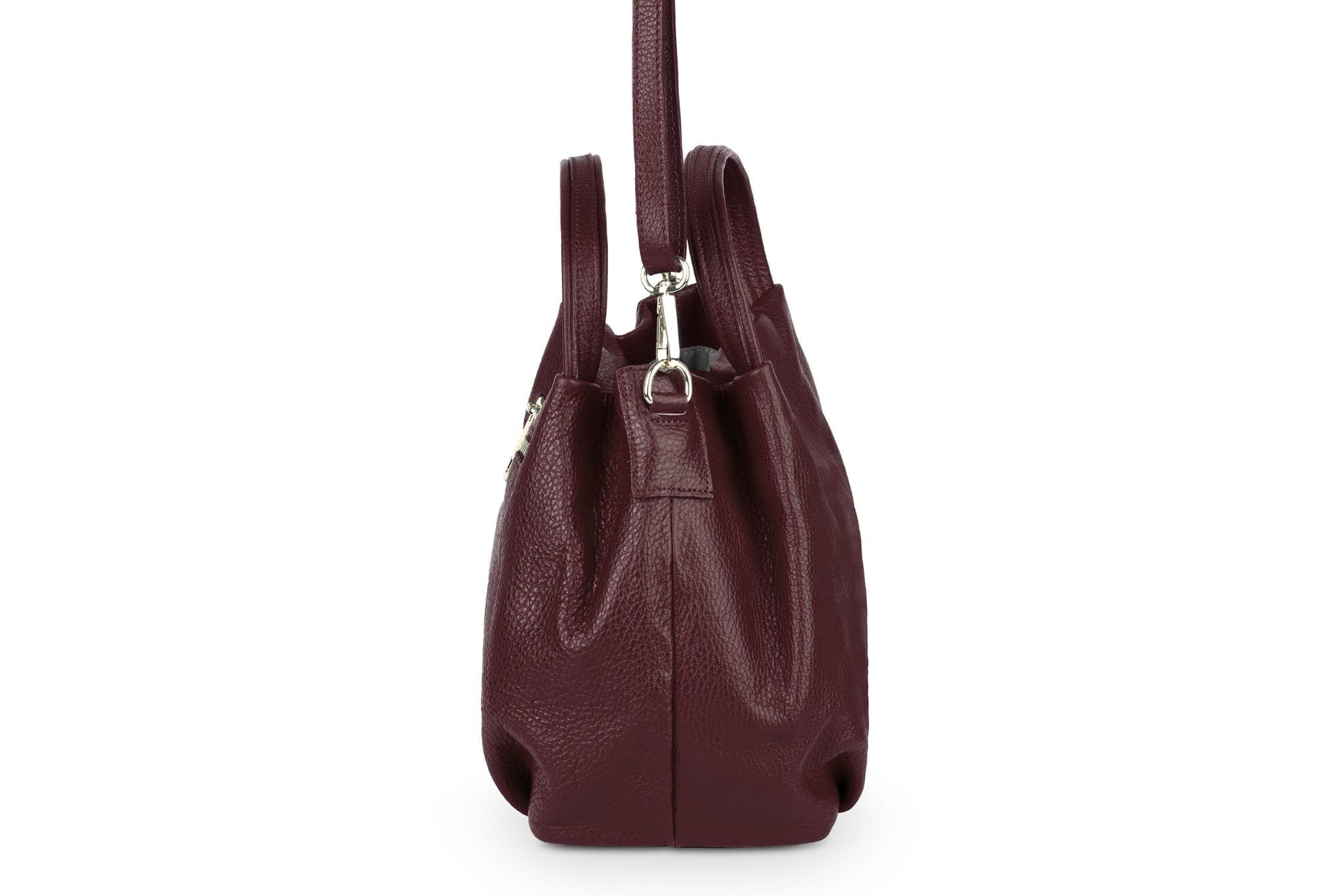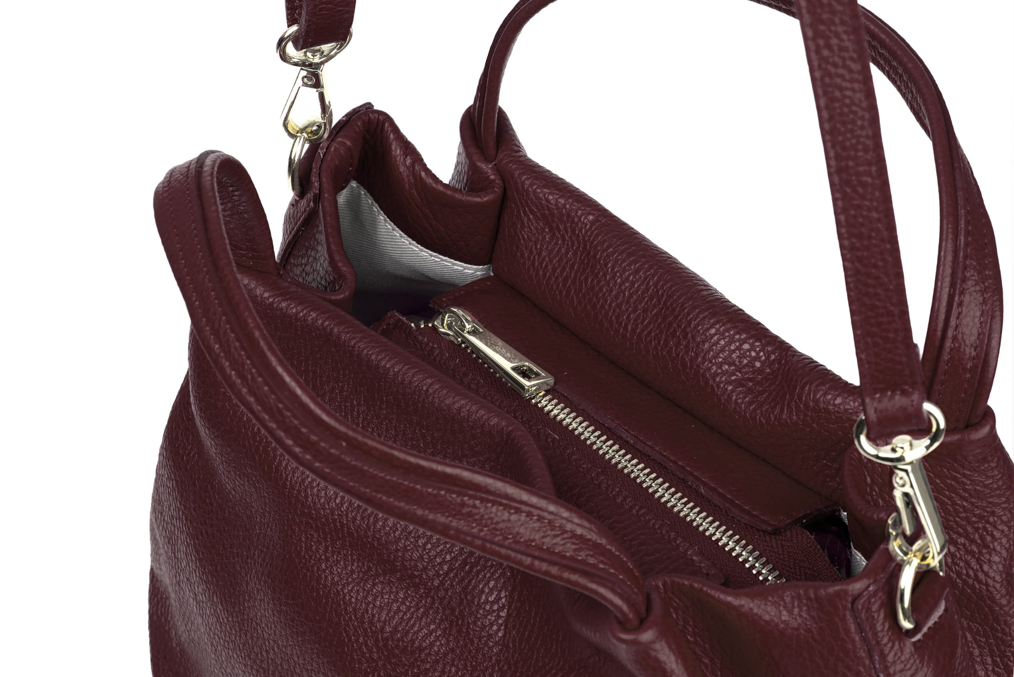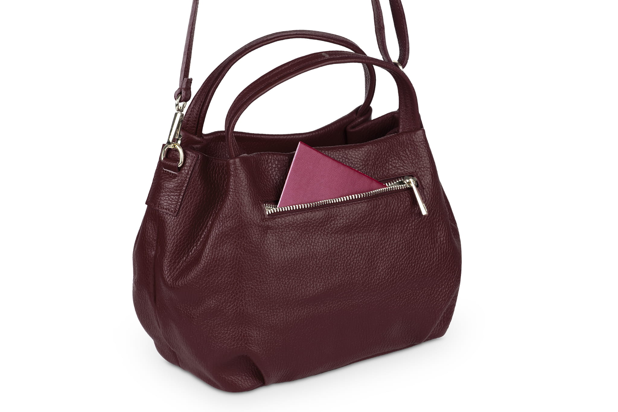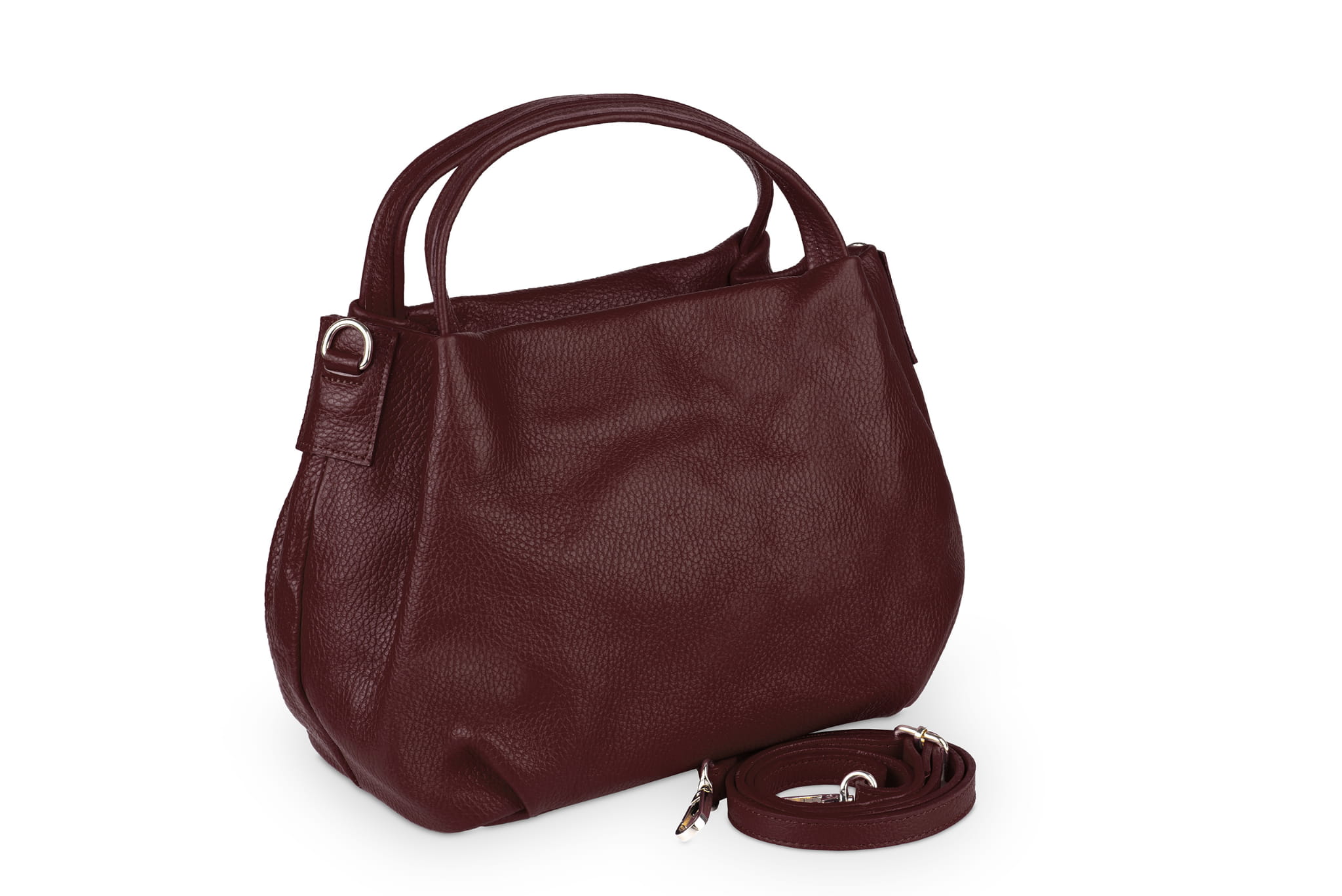 Miejska torebka damska średniej wielkości, wykonana z włoskiej skóry naturalnej. Z tyłu torebki jest kieszonka zamykana na suwak. Para uchwytów i odpinany pasek pozwala nosić torebkę w ręku, na przedramieniu lub na ramieniu.